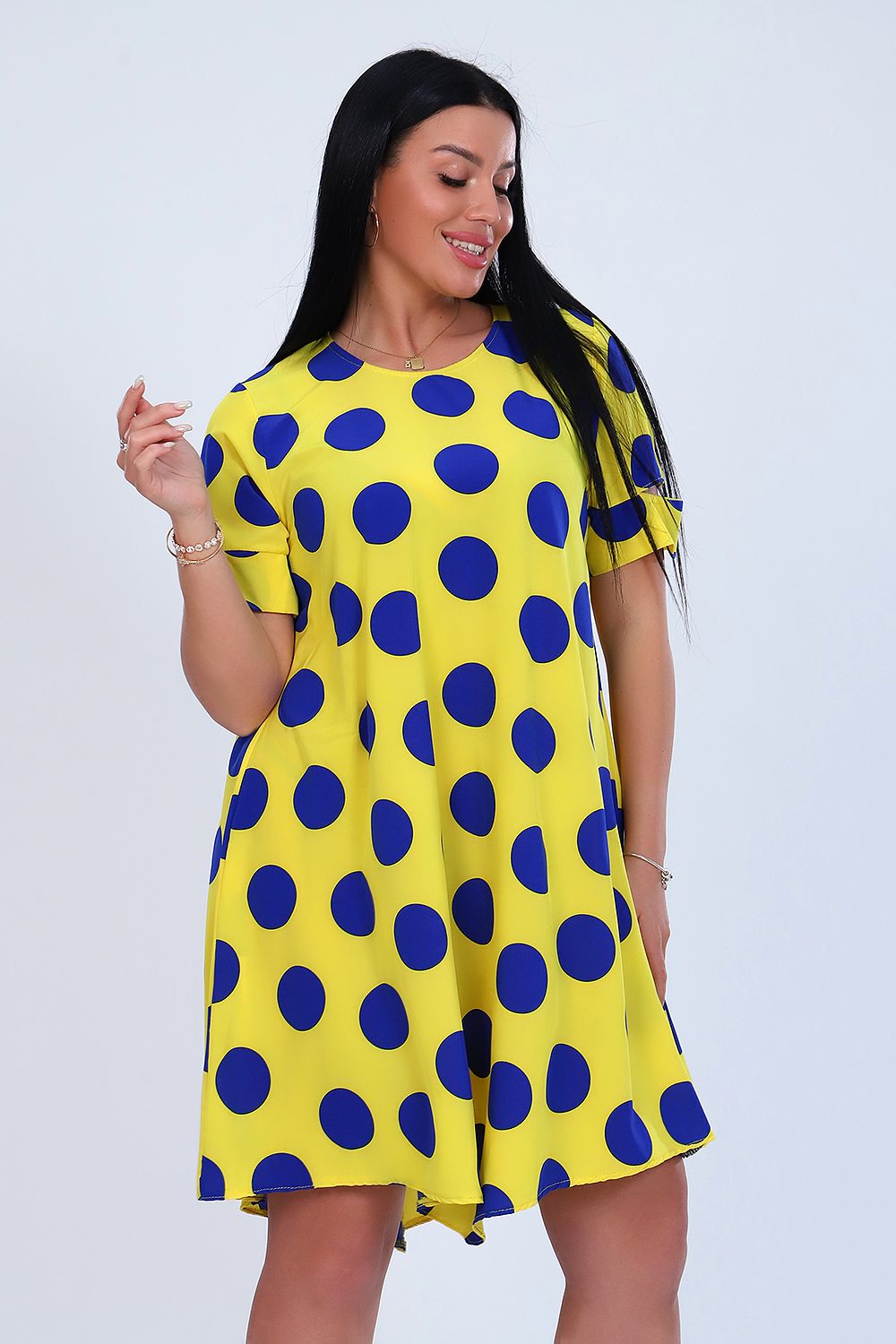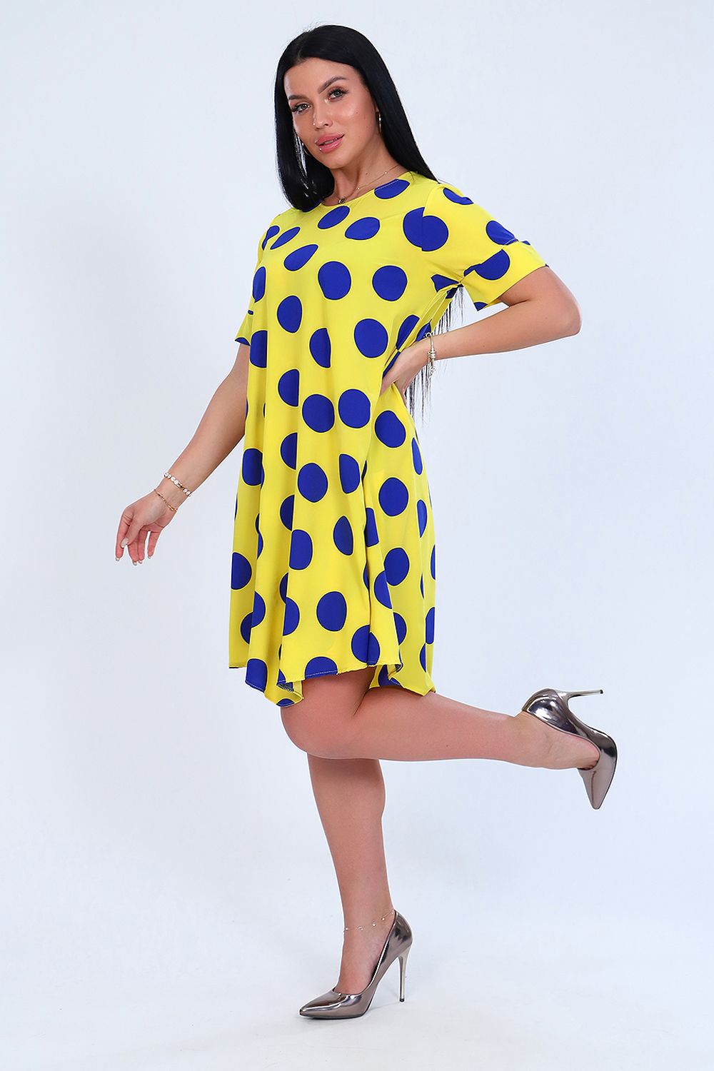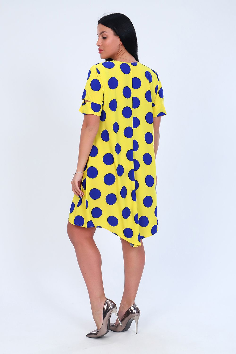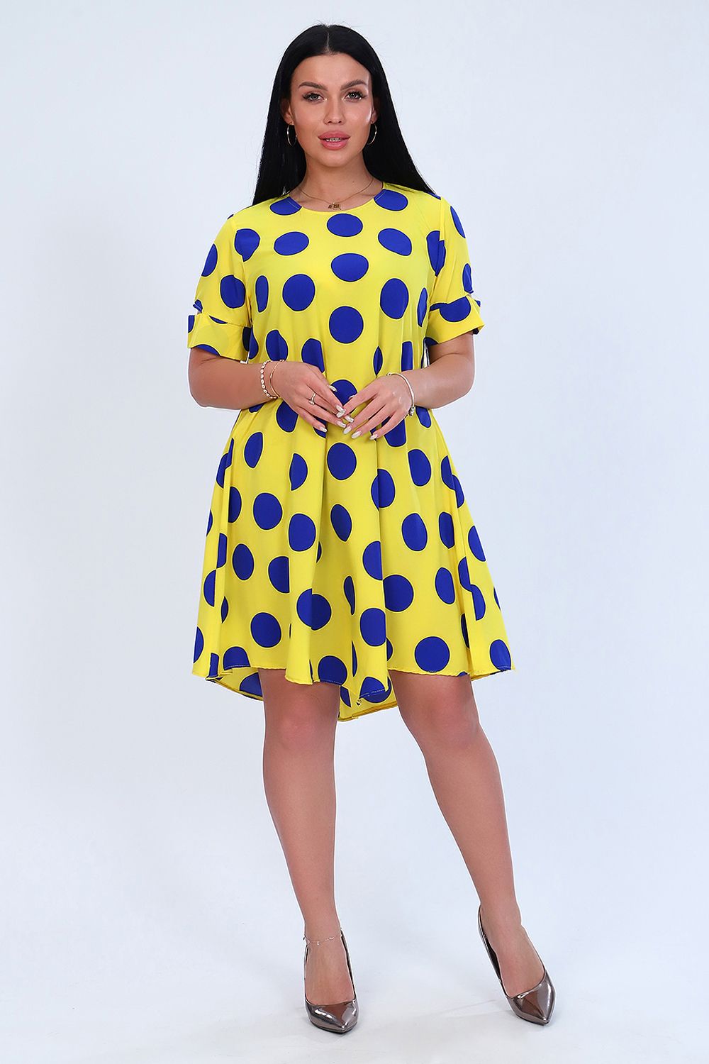 Платье женское расклешенного силуэта, округлый воротник, короткий рукав, задняя полочка длиннее передней. Легкое и удобное.