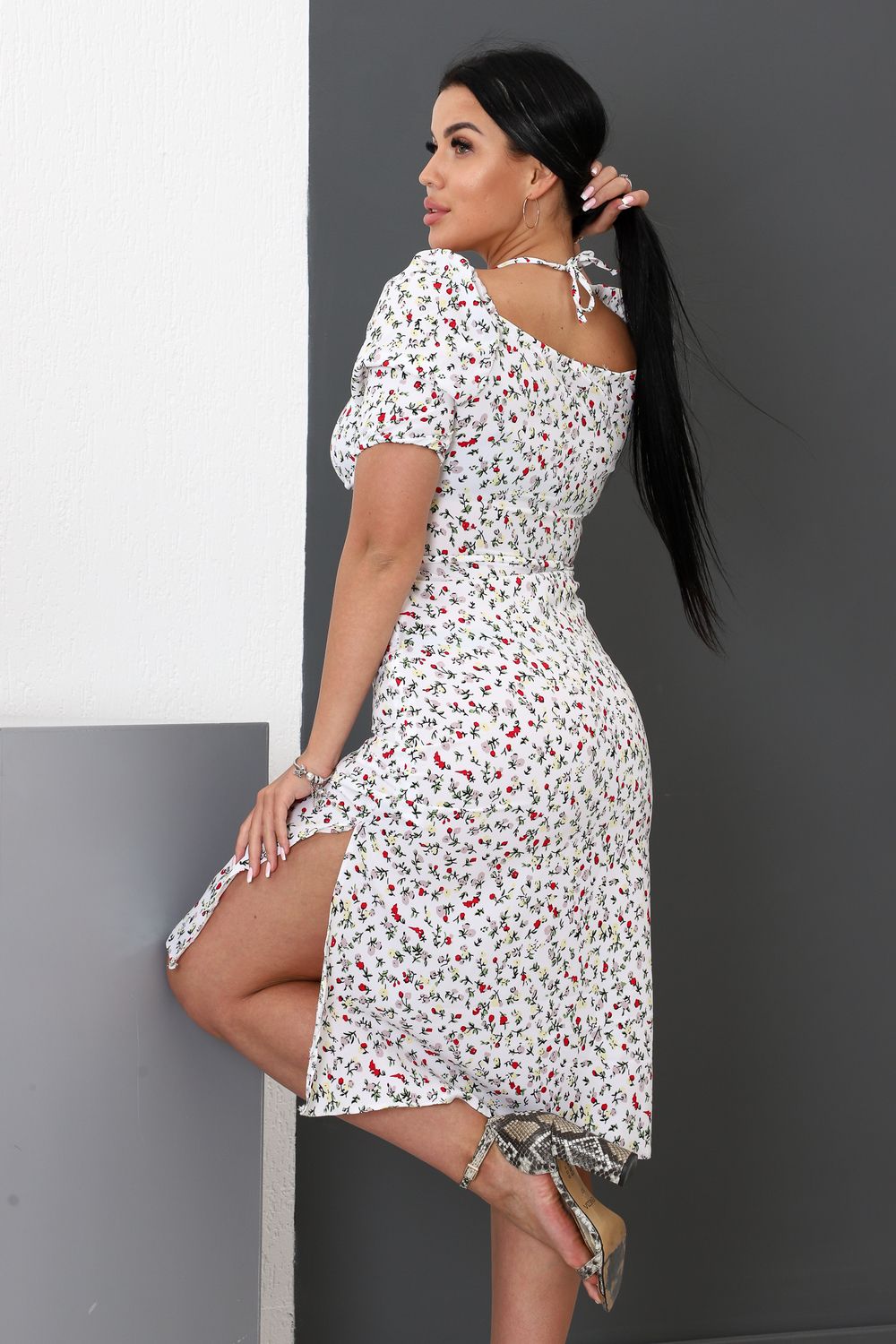 Платье женское полуприталенного силуэта, короткий рукав, округлая горловина с декоративными завязками, на передней полочке разрез снизу. Вид застежки скрытая молния сбоку. Легкое и удобное.