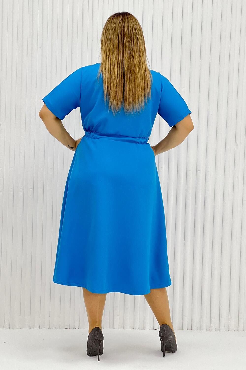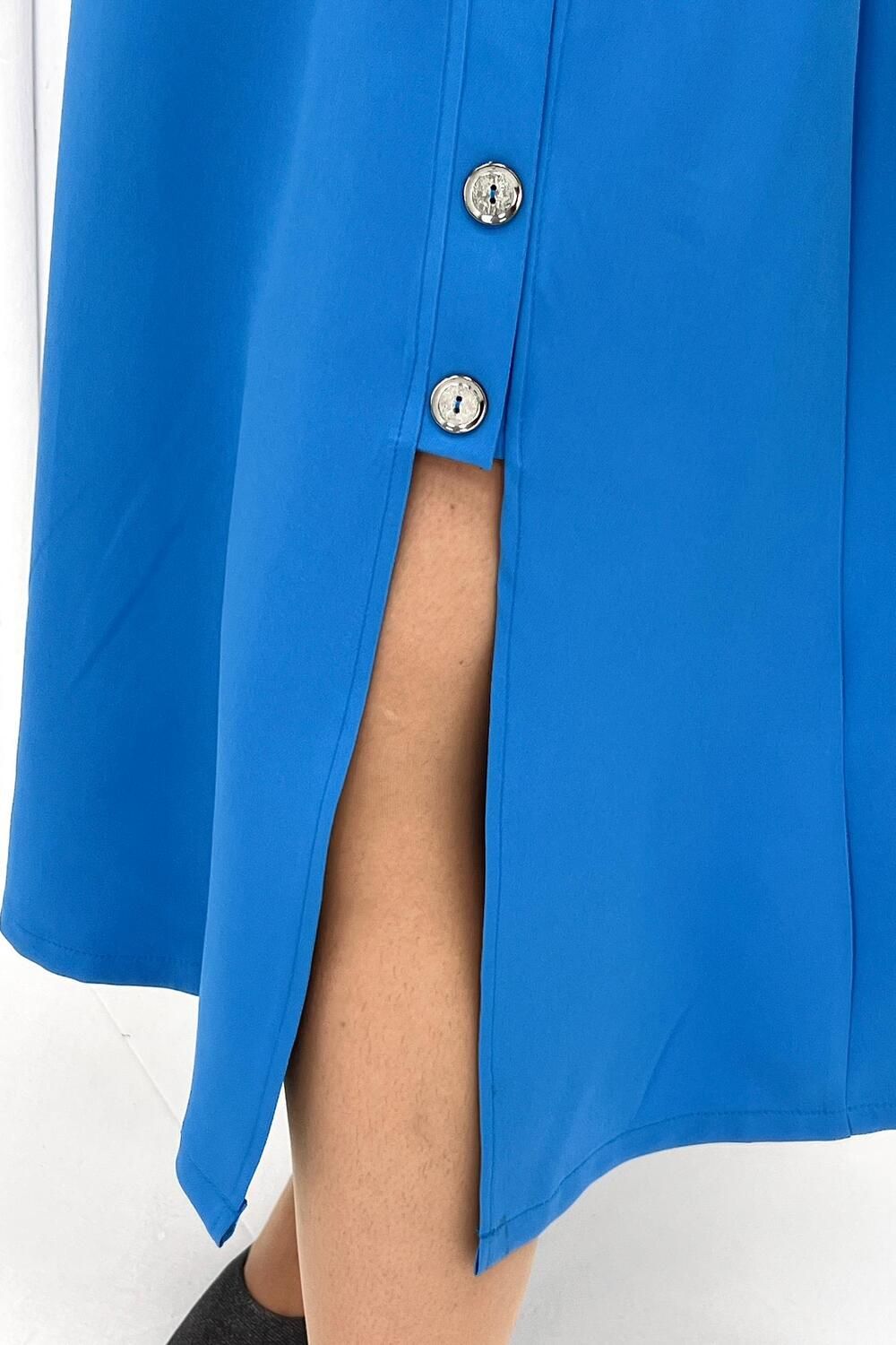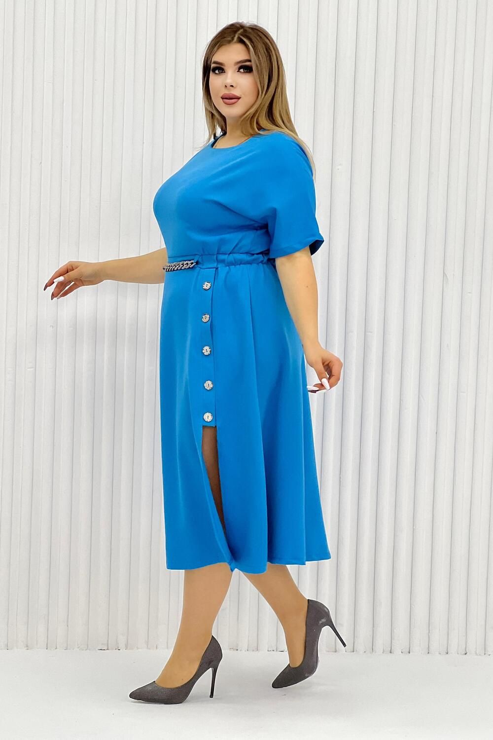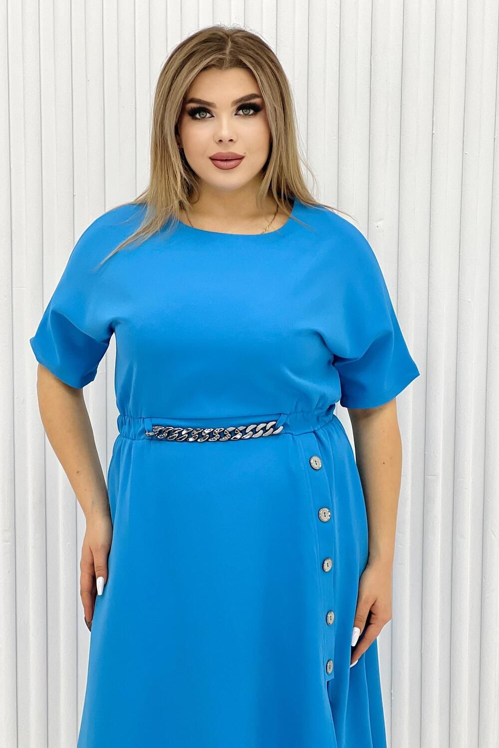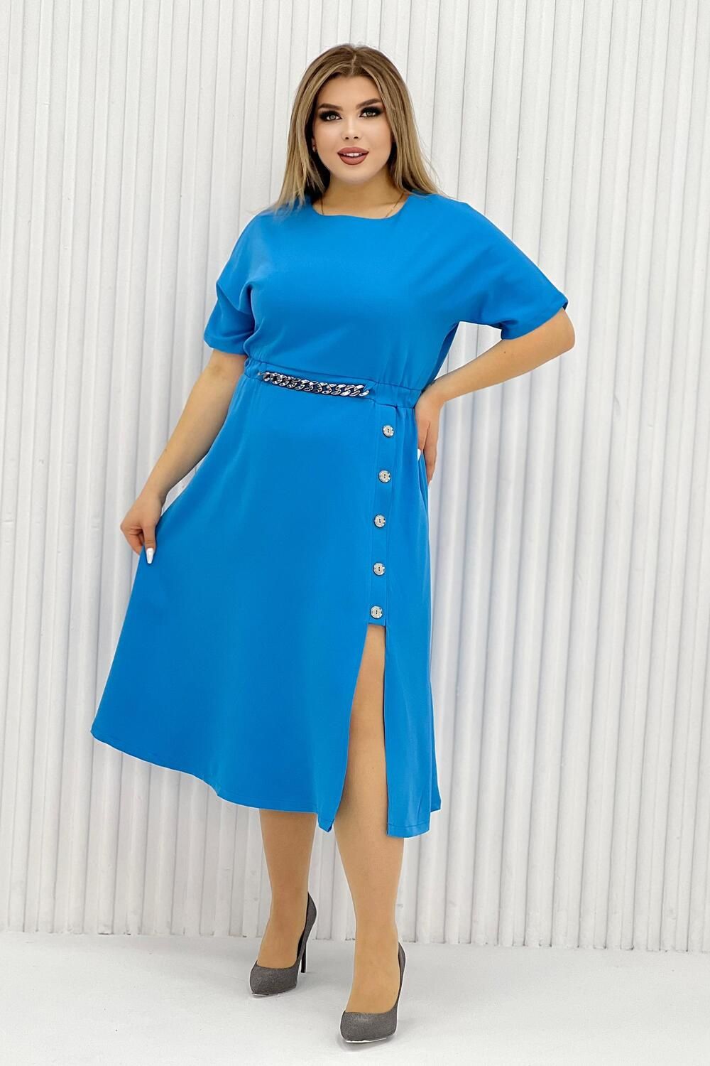 Элегантное женское платье миди в голубом цвете. Изделие приталенное на резинке, с коротким рукавом (выше локтя), округлой горловиной и вырезом снизу, его дополняют декоративные элементы на поясе в виде цепочки и пуговиц от талии к вырезу. Платье подойдет на каждый день, на работу, на праздник. Деловое, но в то же время женственное.