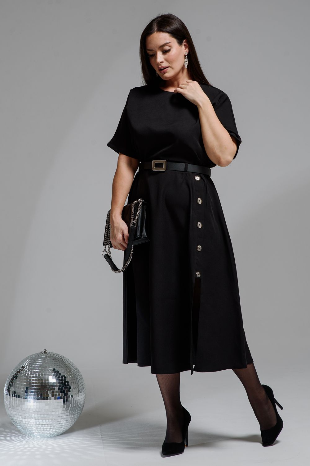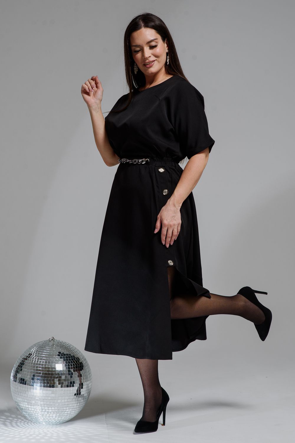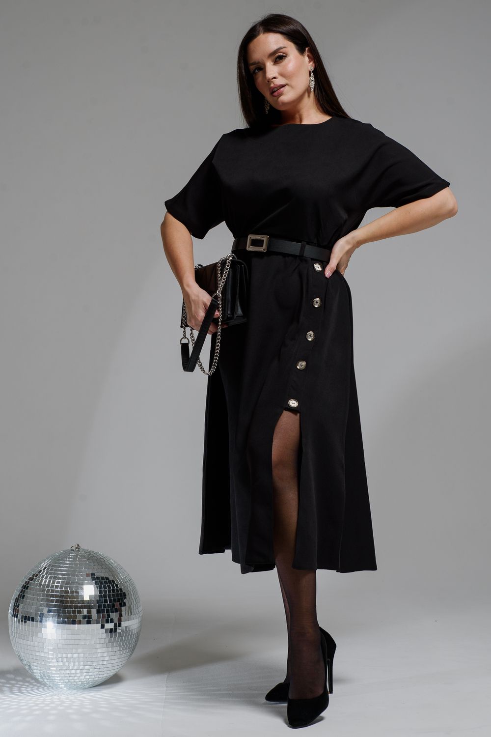 Элегантное женское платье миди представлено в трех расцветках . Изделие приталенное на резинке, с коротким рукавом (выше локтя), округлой горловиной и вырезом снизу, его дополняют декоративные элементы на поясе в виде цепочки и пуговиц от талии к вырезу. Платье подойдет на каждый день, на работу, на праздник. Деловое, но в то же время женственное.