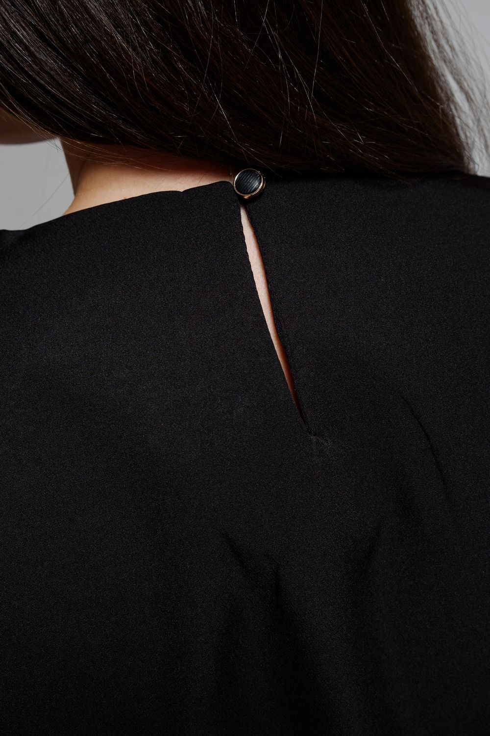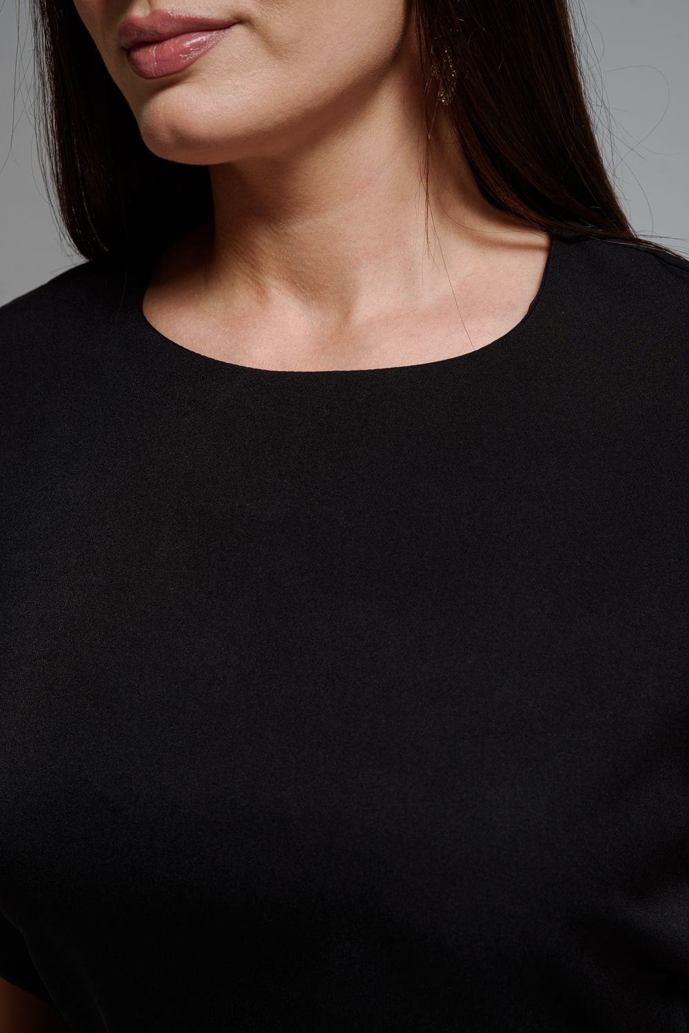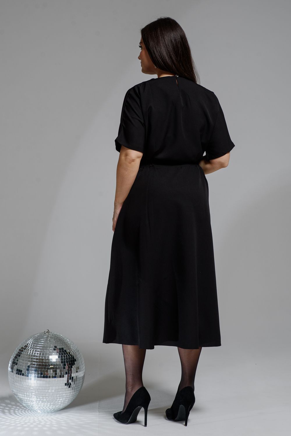 Элегантное женское платье миди представлено в трех расцветках . Изделие приталенное на резинке, с коротким рукавом (выше локтя), округлой горловиной и вырезом снизу, его дополняют декоративные элементы на поясе в виде цепочки и пуговиц от талии к вырезу. Платье подойдет на каждый день, на работу, на праздник. Деловое, но в то же время женственное.