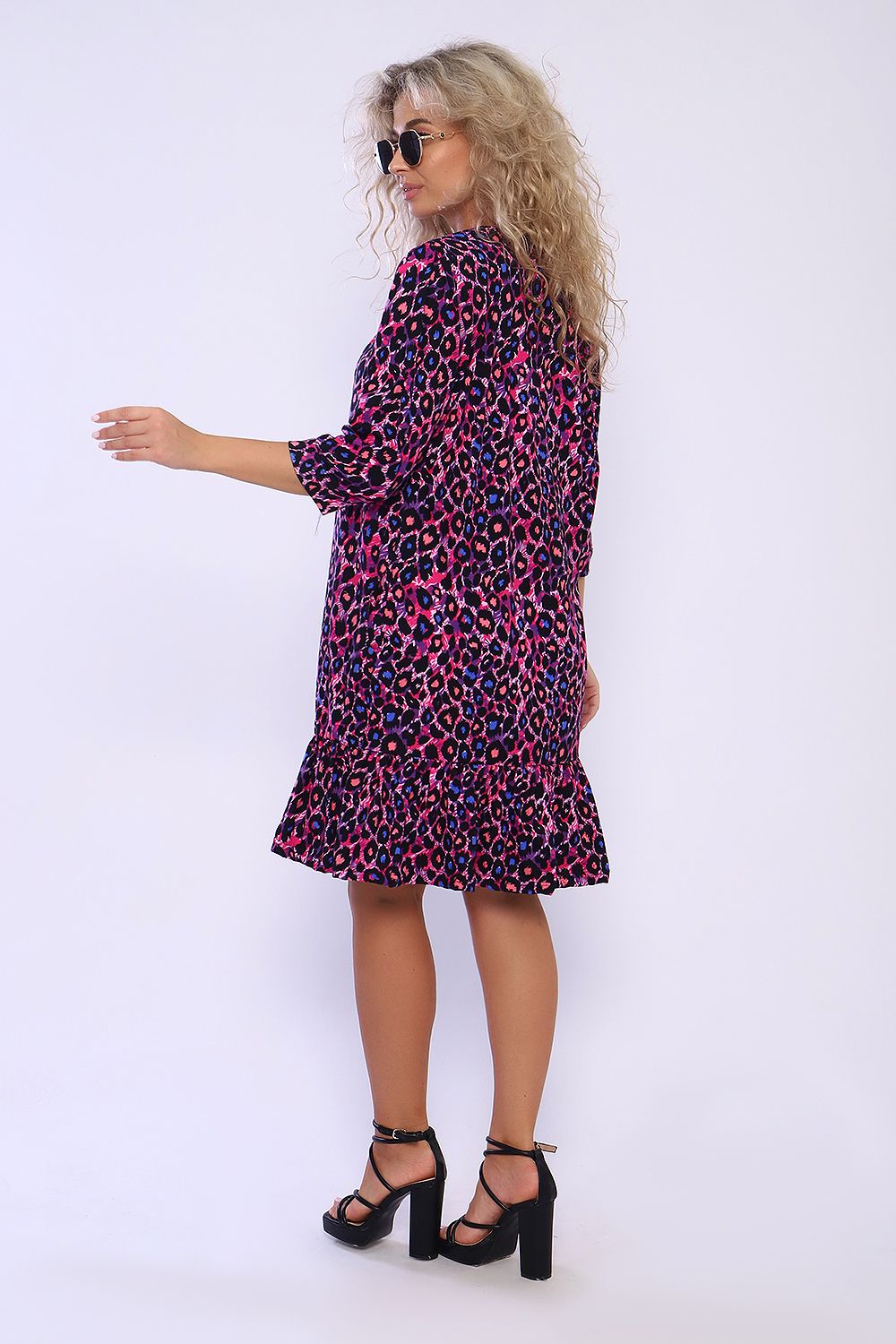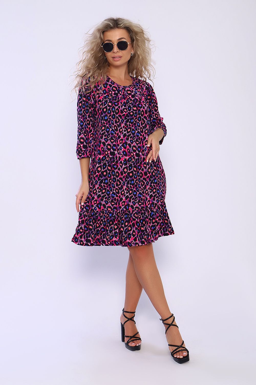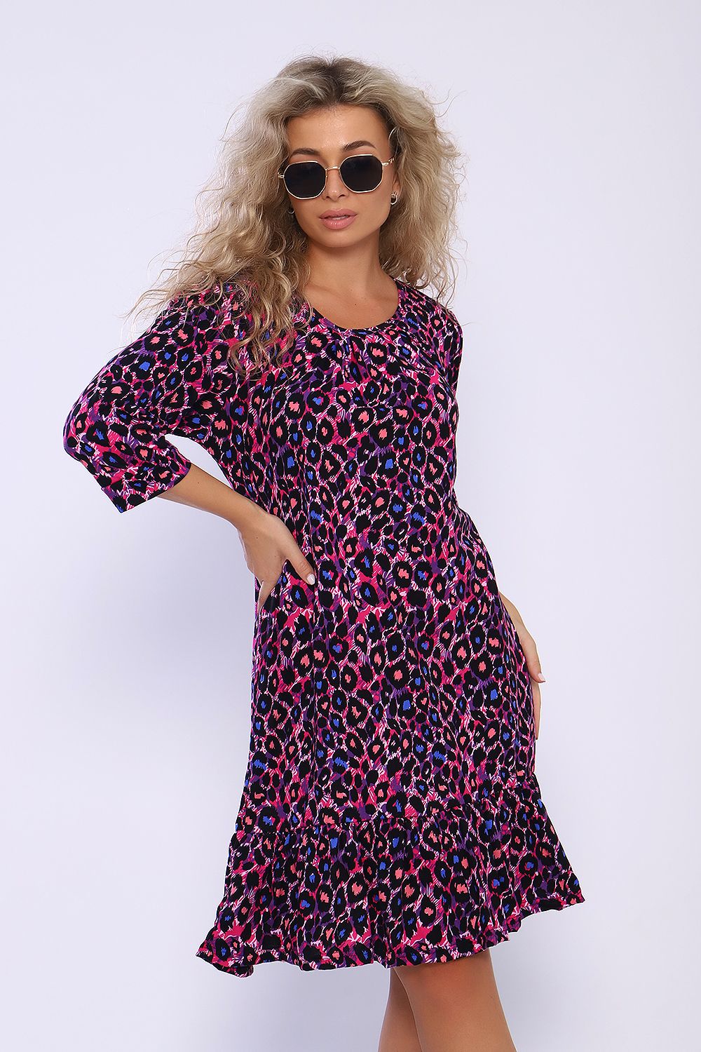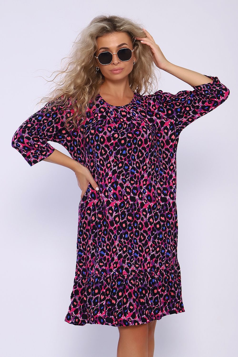 Свободное платье с карманами в боковых швах и воланом со сборкой по низу. Рукава длиной 3/4 со сборкой и на манжетах. На полочке в зоне декольте заложены складки. Необходимый элемент гардероба для легких образов.