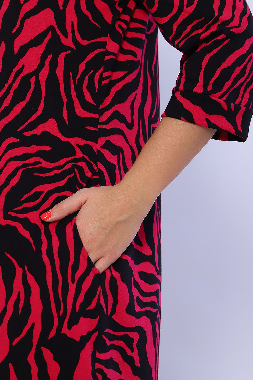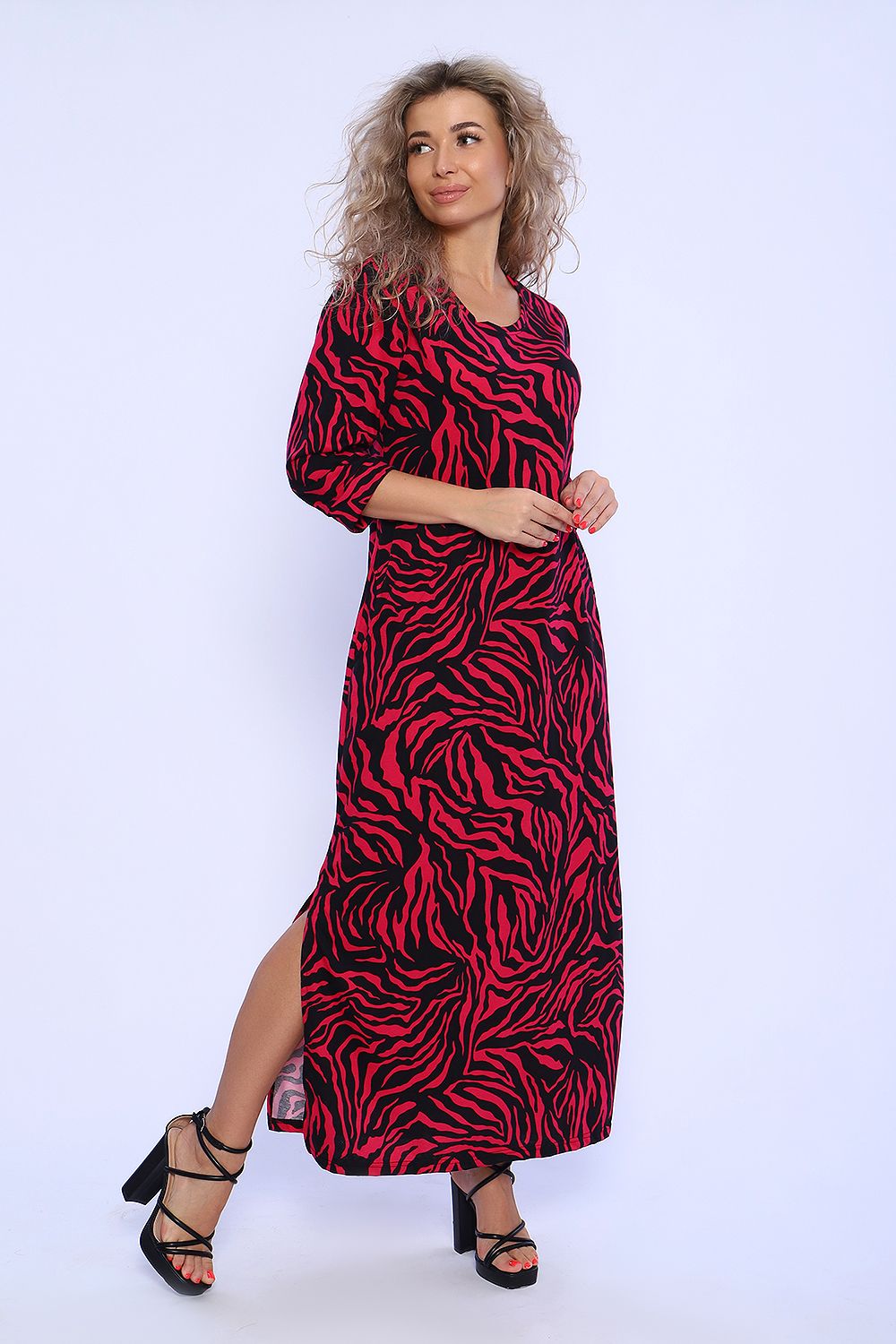 Длинное платье полуприлегающего силуэта с рукавами длиной 3/4 на манжетах и со сборкой. В боковых швах два длинных разреза и удобные карманы.