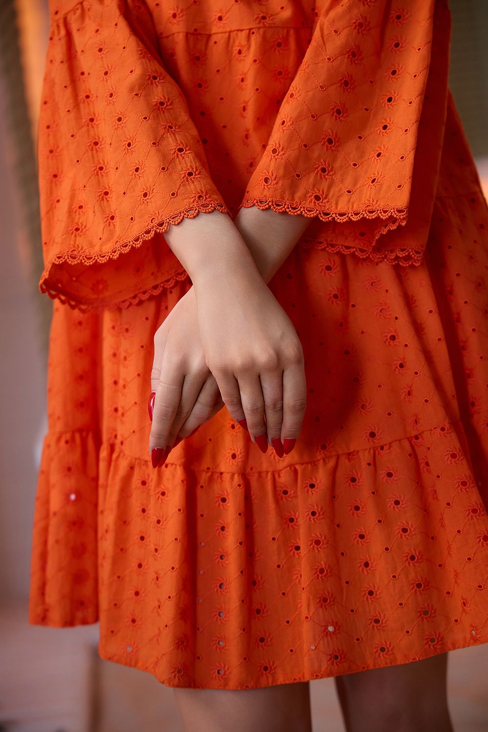 Женское платье с длинным рукавом. Расклешенный к низу за счет сборок. Треугольный вырез на полочке.