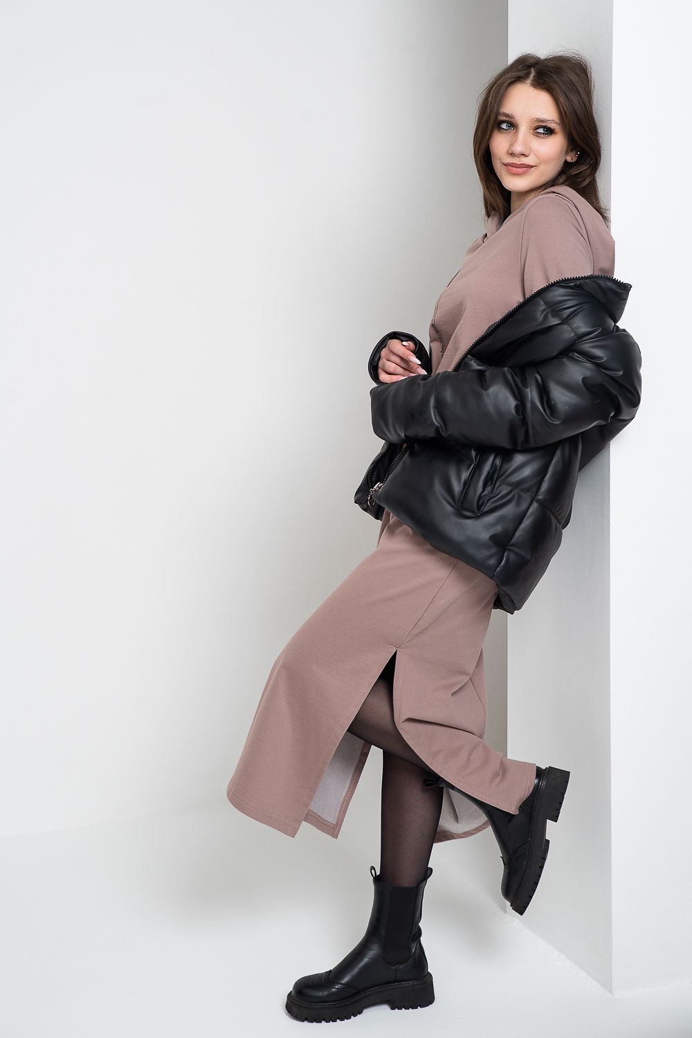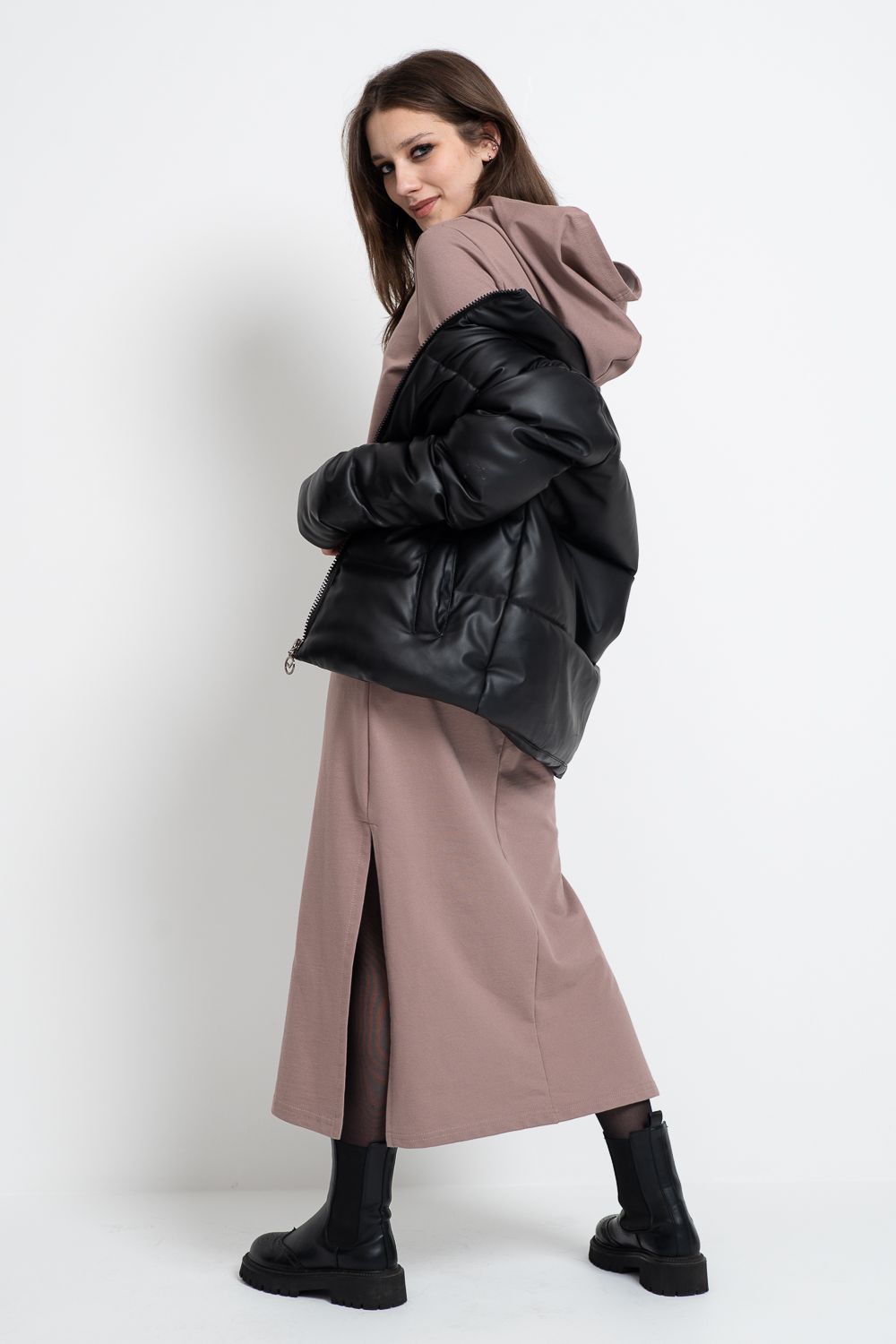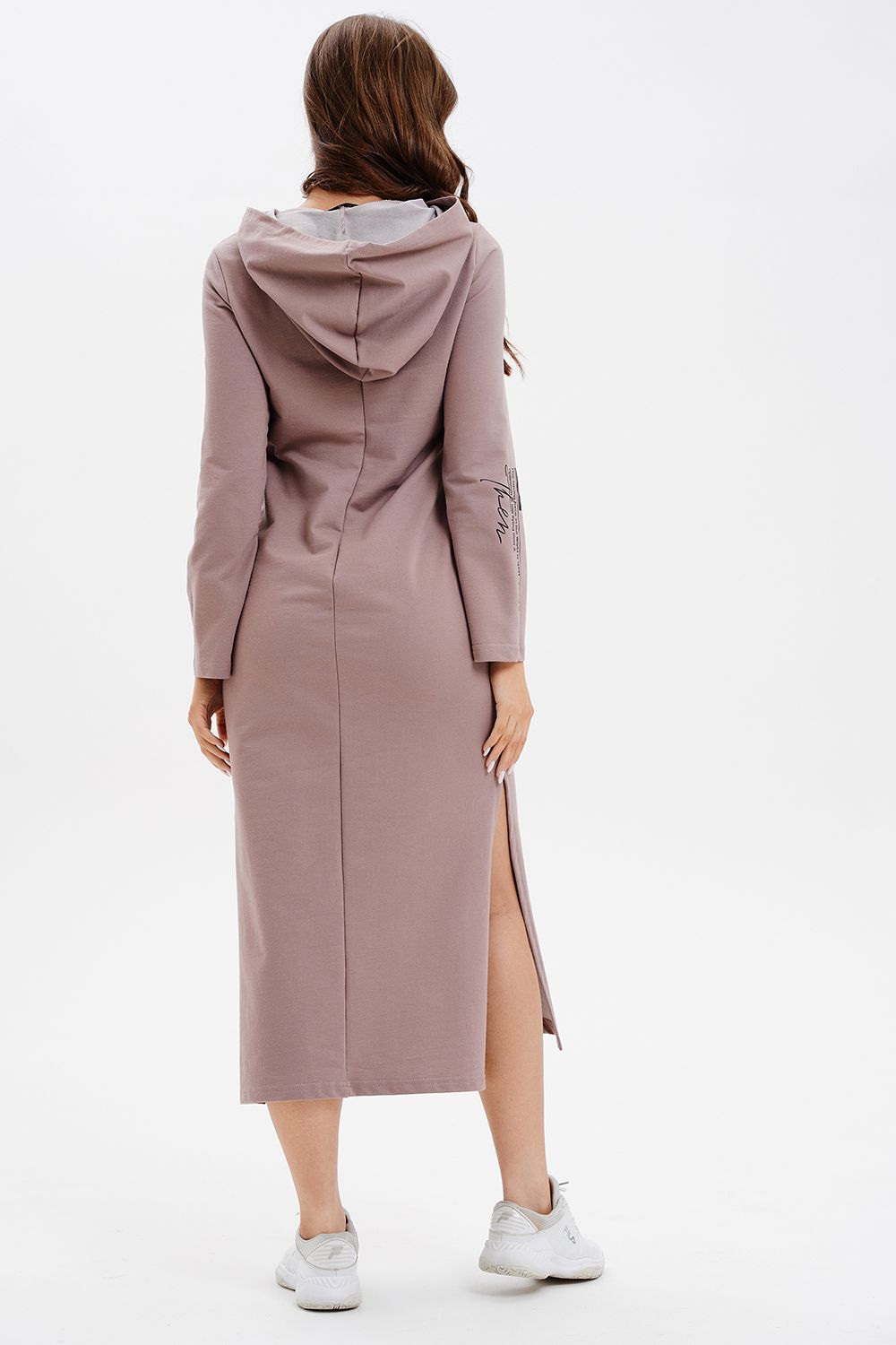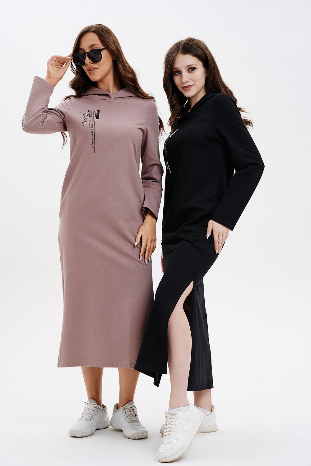 Стильное платье имеет объёмный капюшон, два боковых кармана и длинные разрезы по бокам. Удобное длинное трикотажное платье - беспроигрышное решение для любого случая!