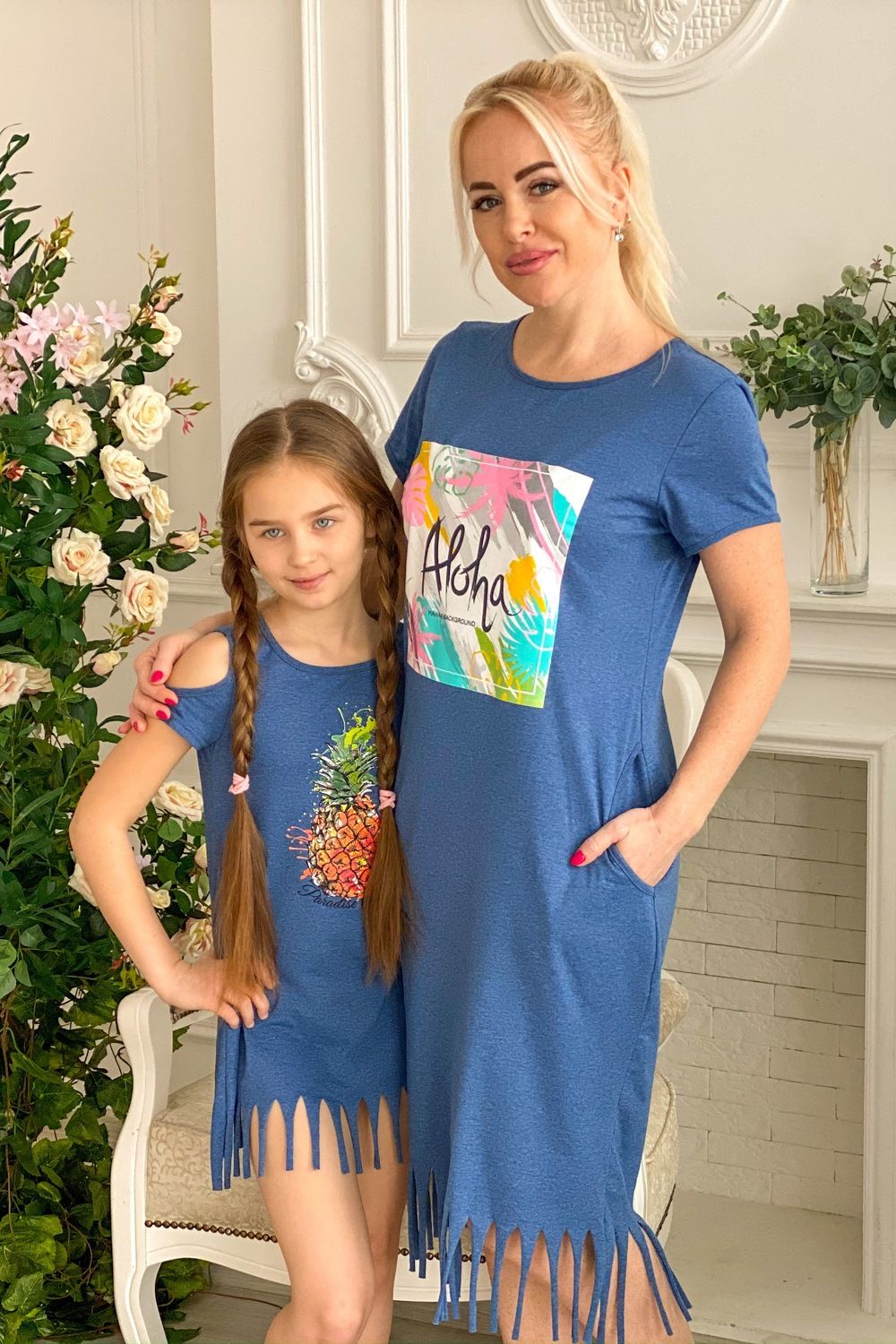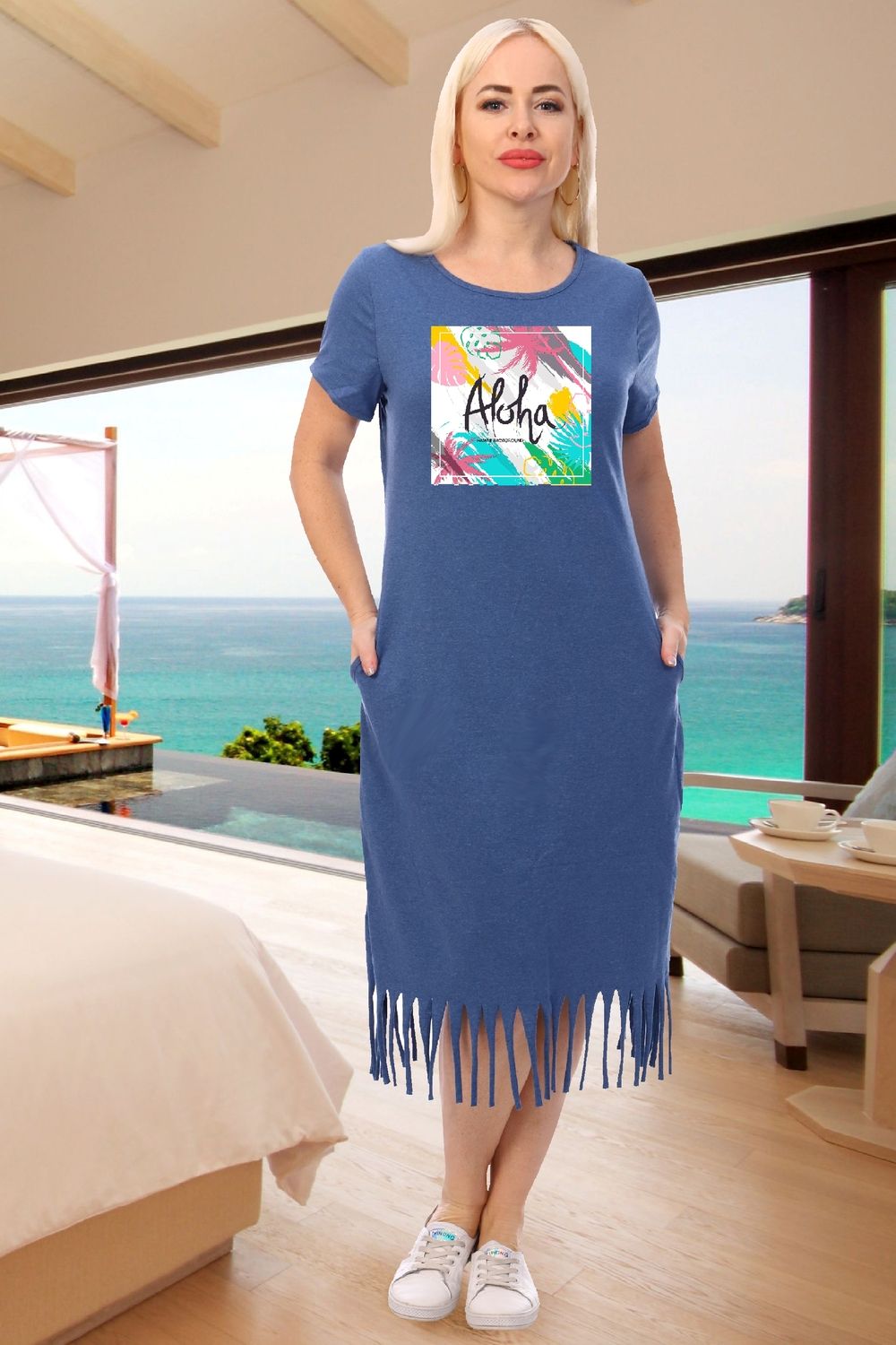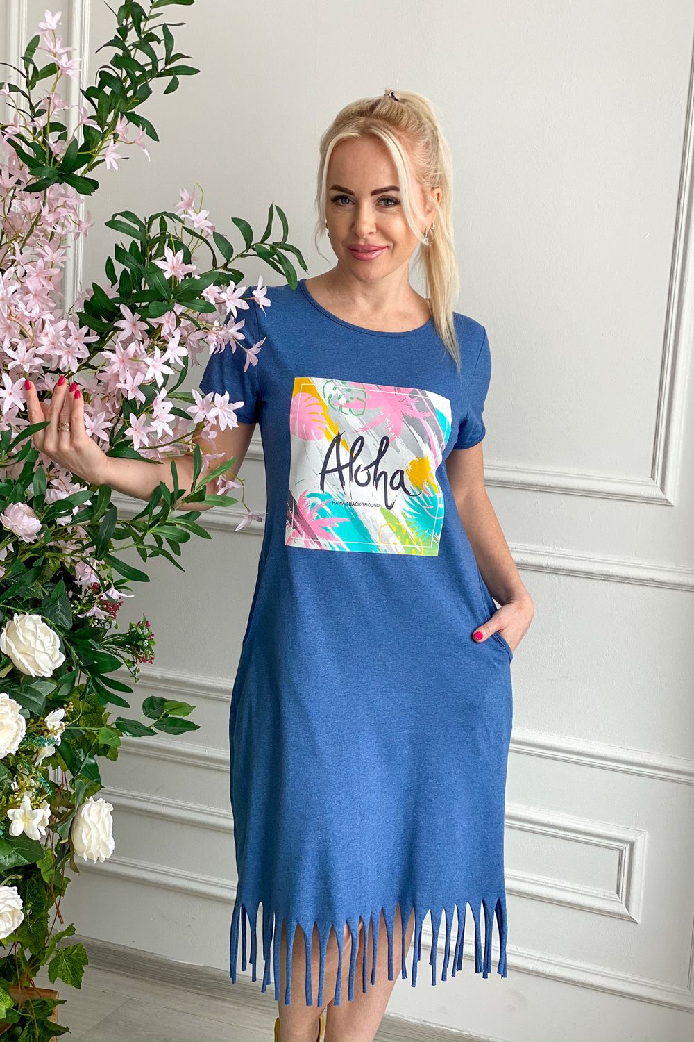 Платье женское полуприлегающего силуэта. По низу изделия разрезы-бахрома. На полочке принт.