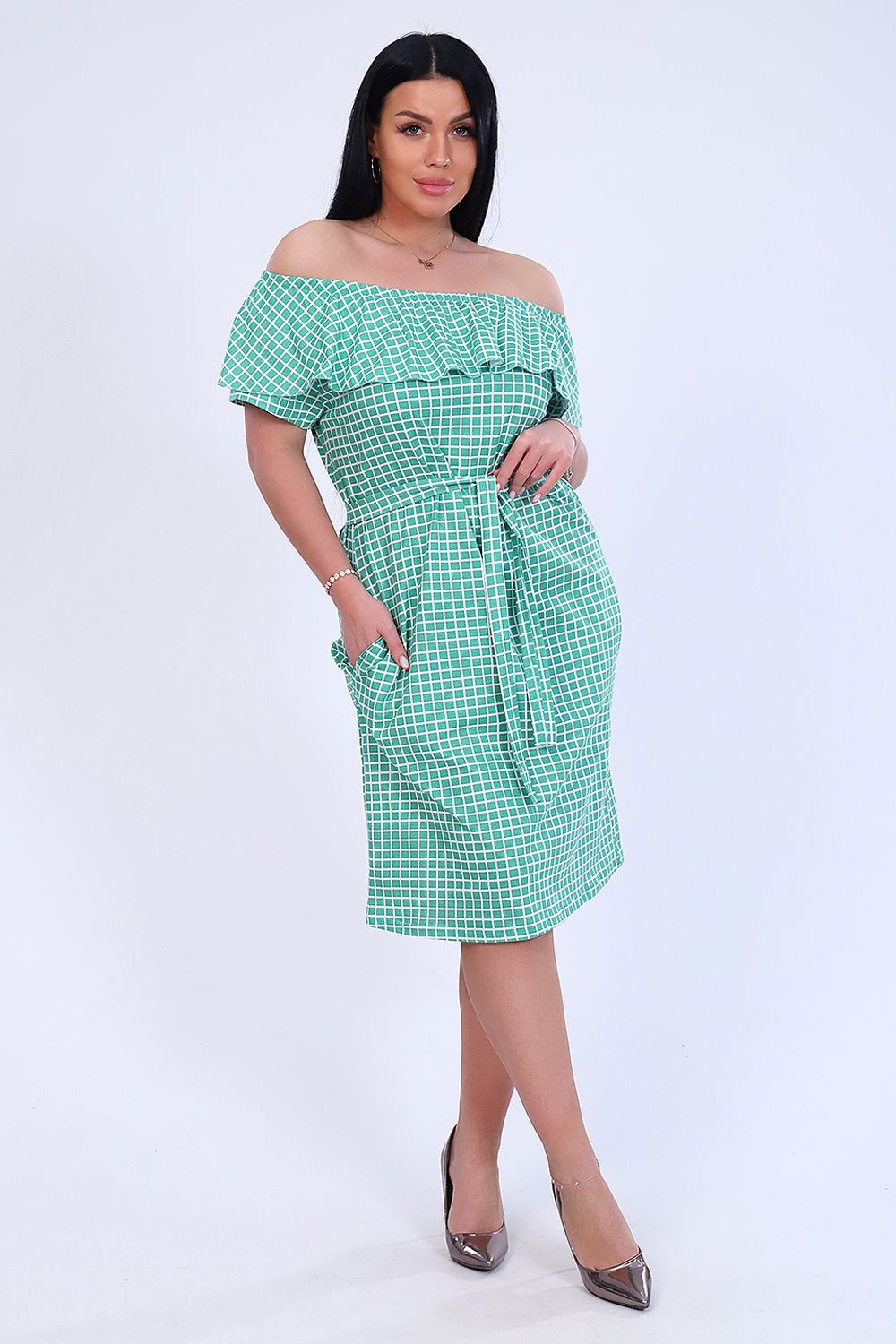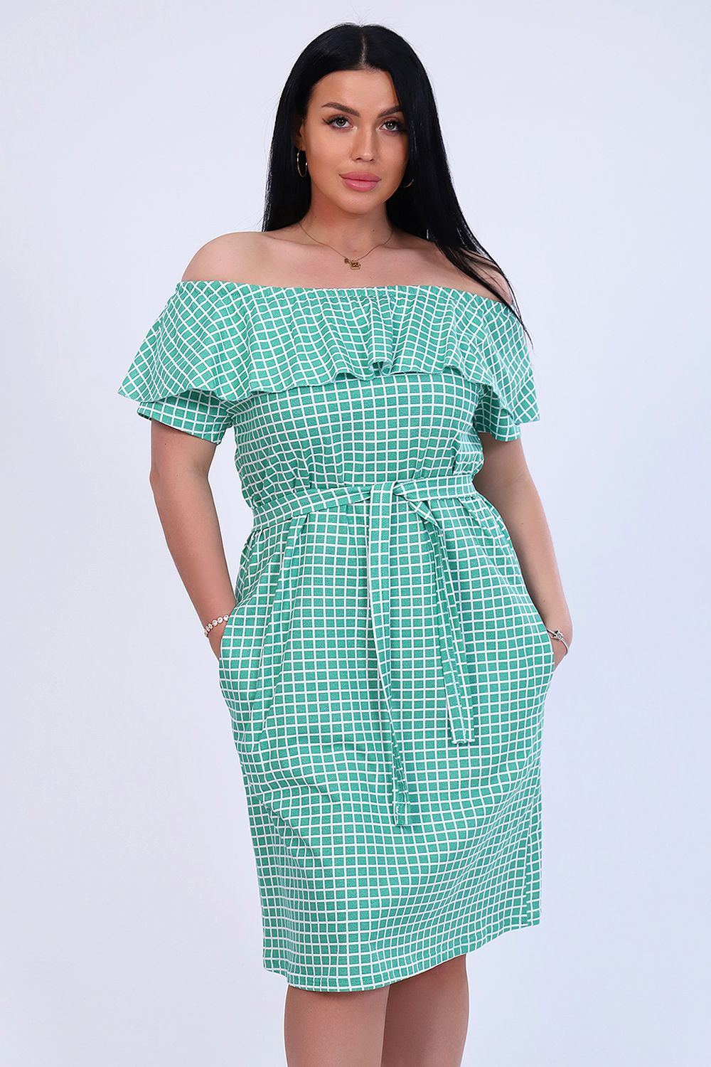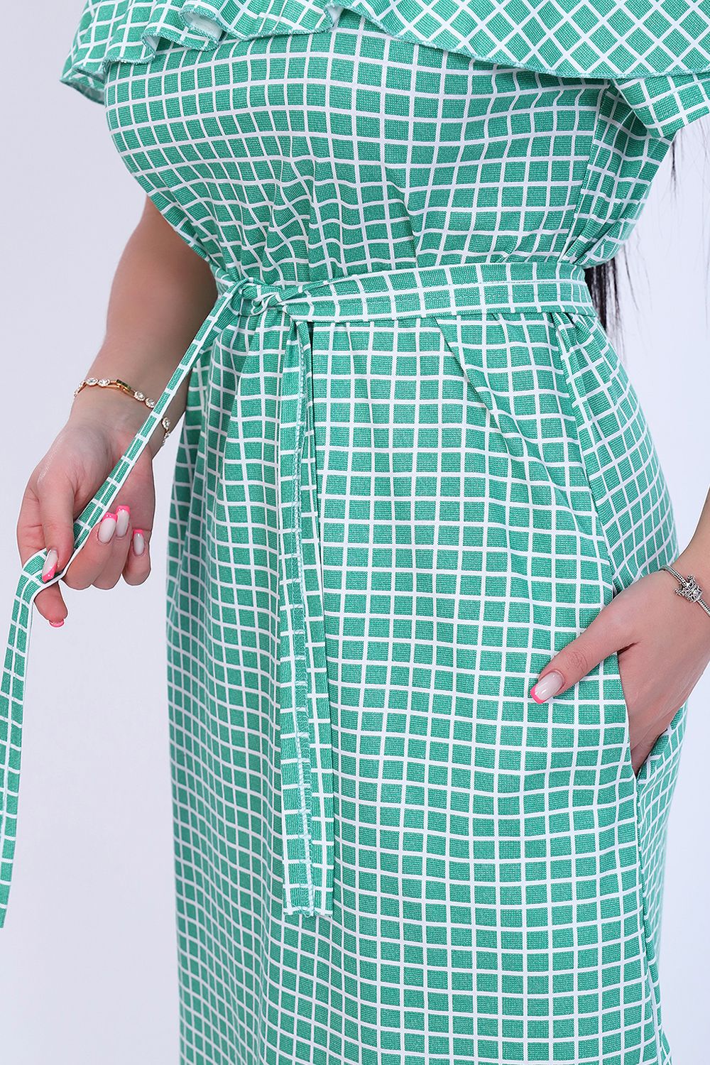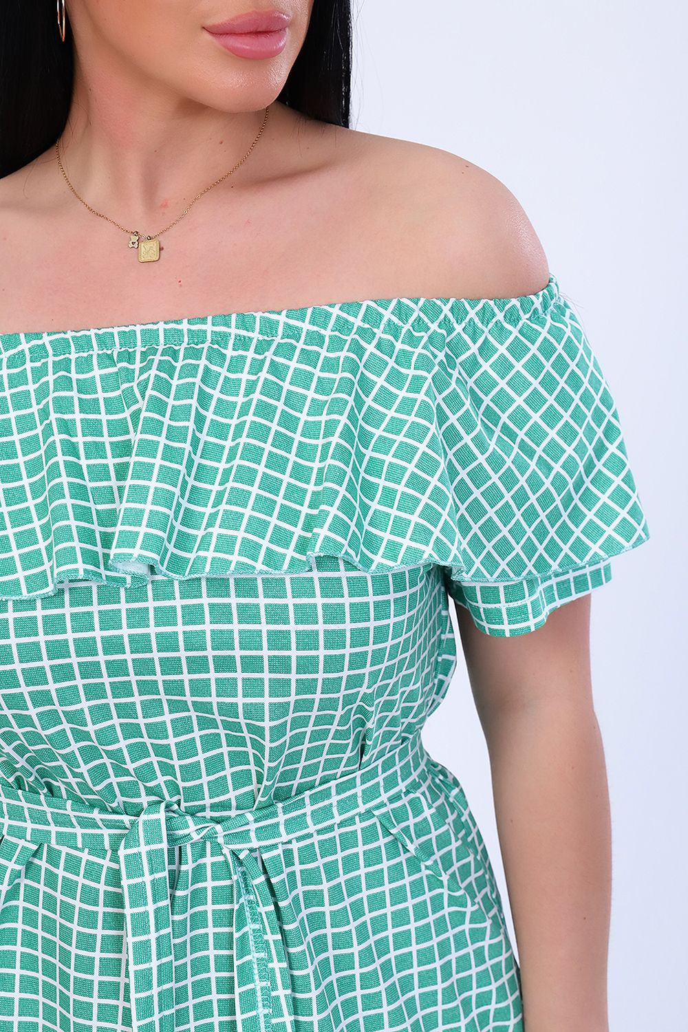 Женское платье - сарафан полуприлегающего силуэта с поясом и широкой рюшью на плечах. Выполнен в романтическом стиле из трикотажного полотна, 100% хлопок. Горловина собрана на резинку и отделана широкой оборкой. Короткий рукав, реглан. Длина пояса в 44 размере 155 см, в 62 размере 180 см. Широкий размерный ряд с 44 до 62 размера. Яркие весенне-летние расцветки с принтом по ткани в виде клетки. Карманы в боковом шве, добавляют дополнительный комфорт при носке. Платье можно носить, как со спущенным с плеч верхом, так и с поднятым, либо на одно плечо. Прекрасно подходит беременным, так как пояс не фиксируется на изделии и может приталить платье на любом уровне. В этом нарядном и удобном платье, Вы будете себя чувствовать комфортно в любой обстановке: на прогулке, дома, в отпуске, на пляже, на даче и на любом празднике.