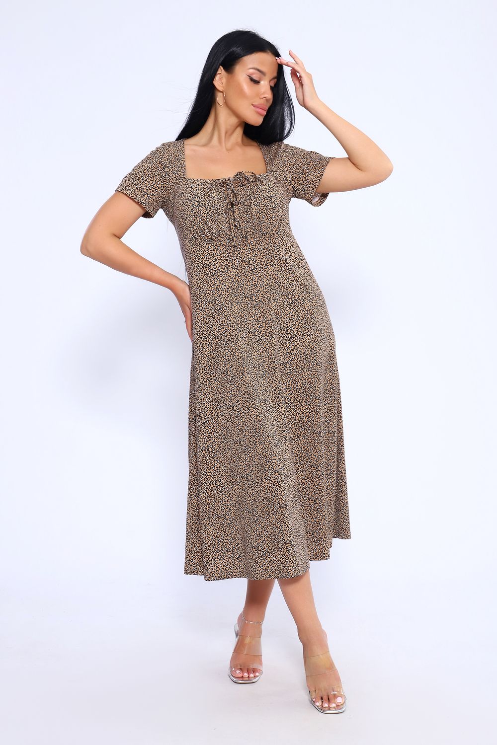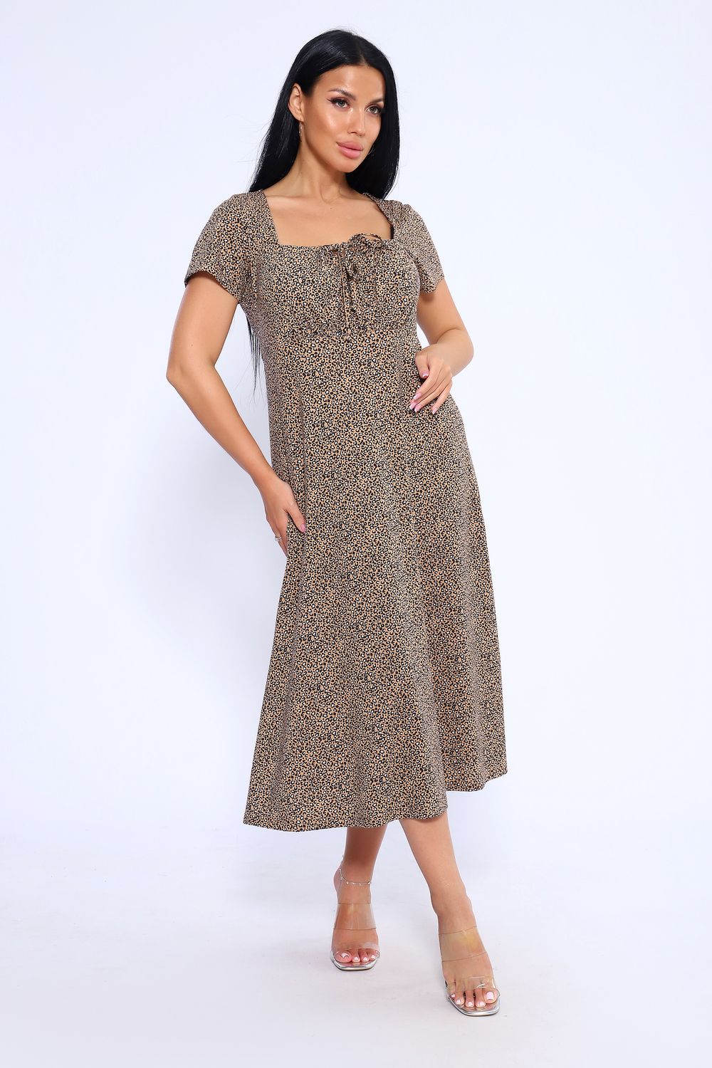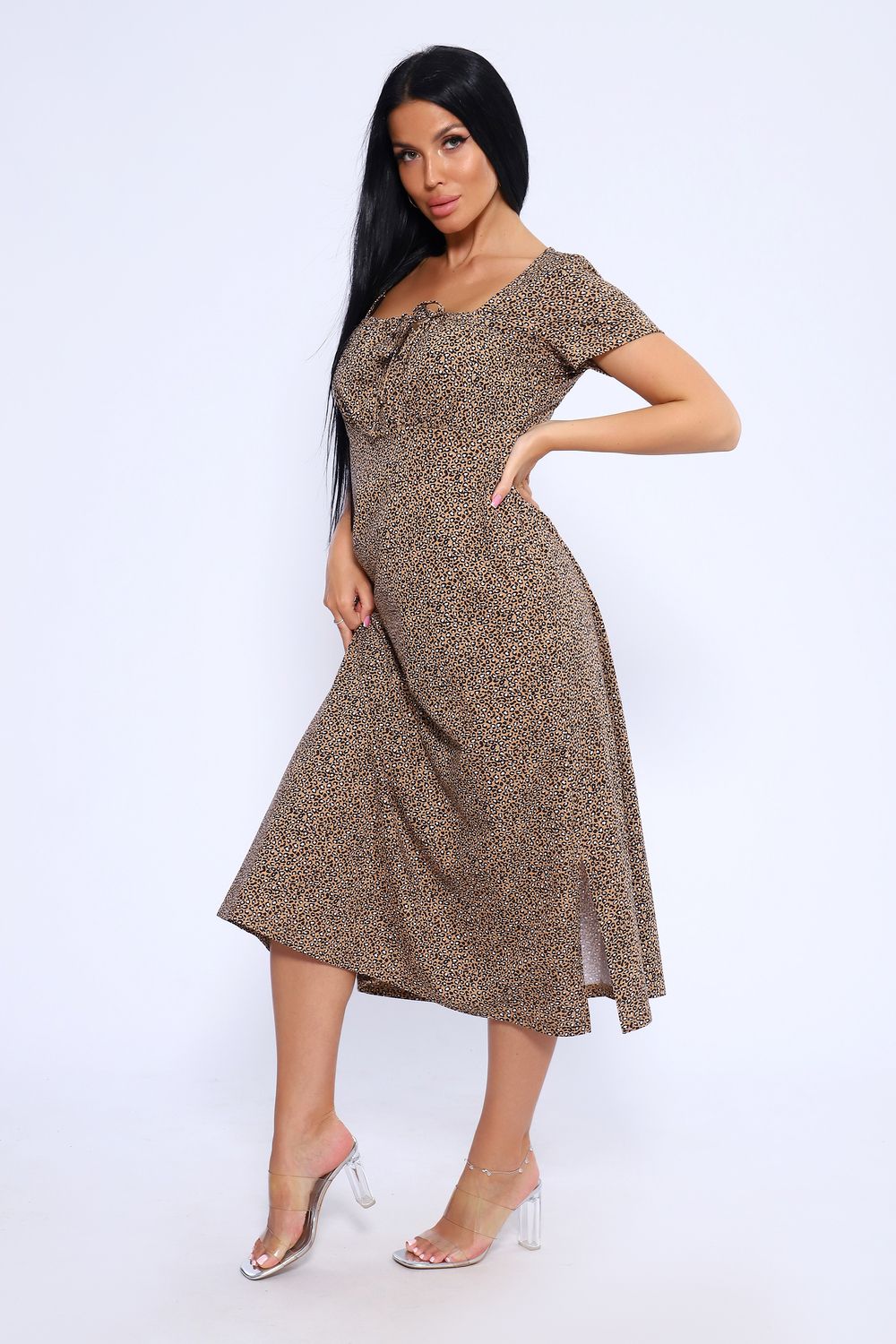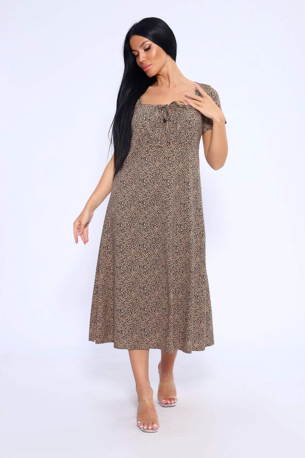Длинное романтичное платье с короткими рукавами, декорировано квадратным вырезом декольте с завязками на груди. Милое, воздушное платье ниже колена с разрезами по боковым швам. Платье имеет свободный крой А-силуэта, который подходит для разного типа фигуры. Модель подойдет для прогулок, отдыха на пляже.
