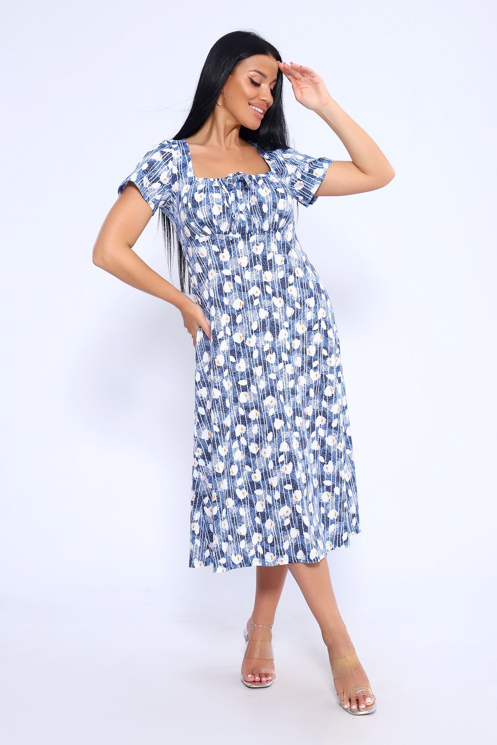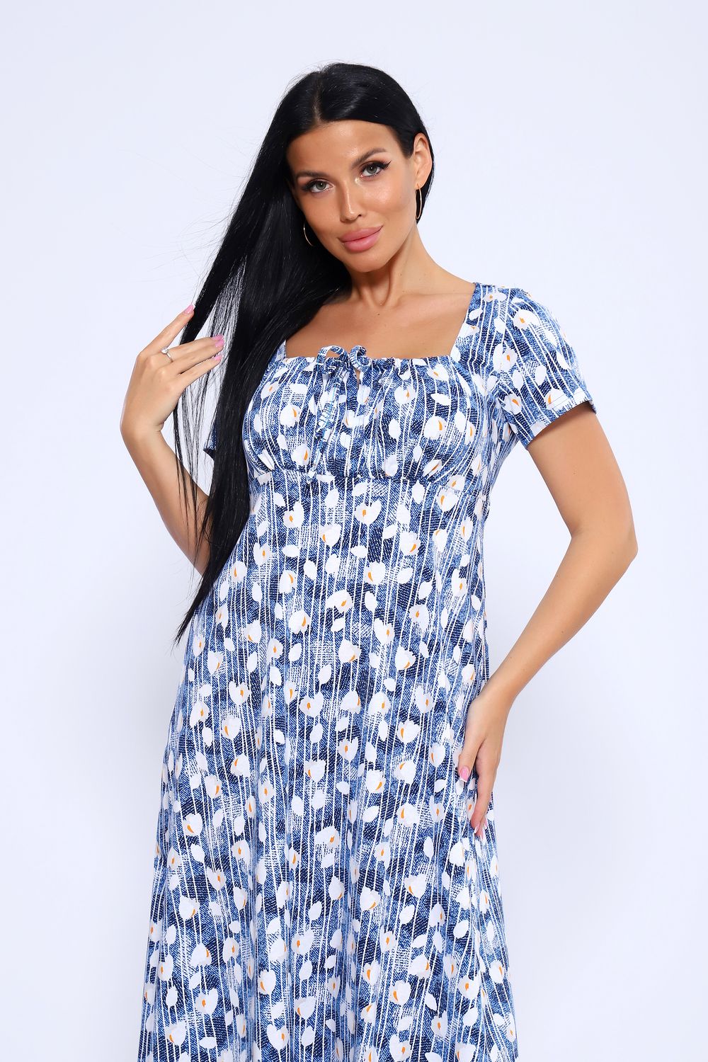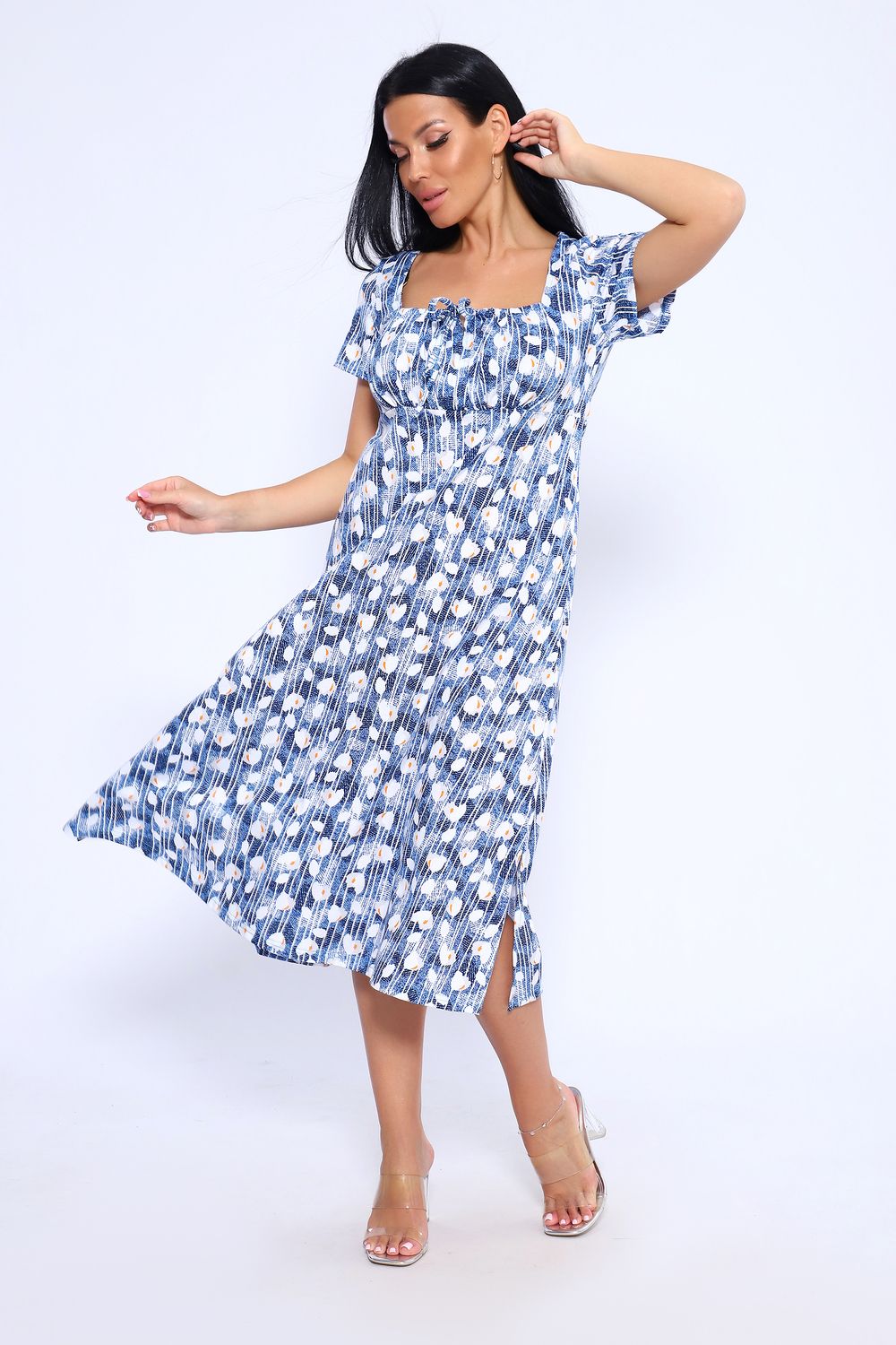 Длинное романтичное платье с короткими рукавами, декорировано квадратным вырезом декольте с завязками на груди. Милое, воздушное платье ниже колена с разрезами по боковым швам. Платье имеет свободный крой А-силуэта, который подходит для разного типа фигуры. Модель подойдет для прогулок, отдыха на пляже.