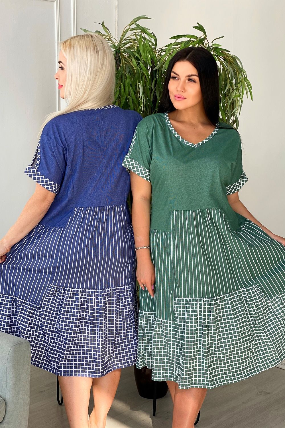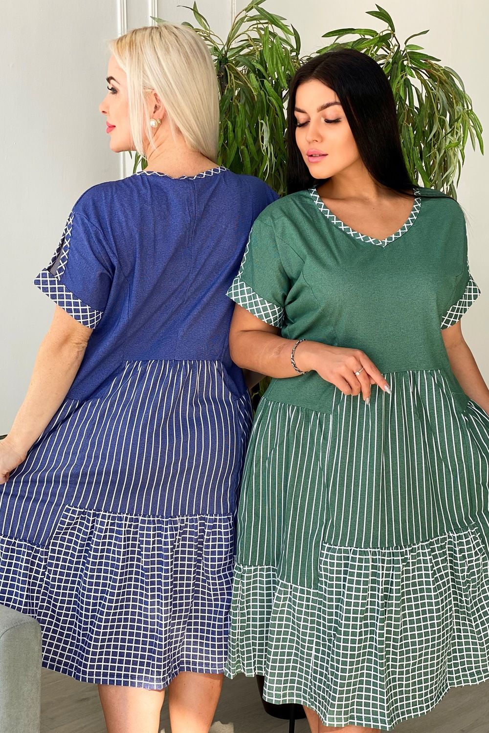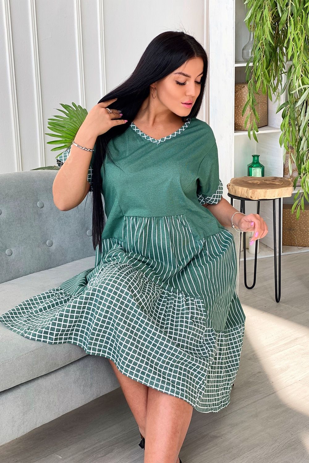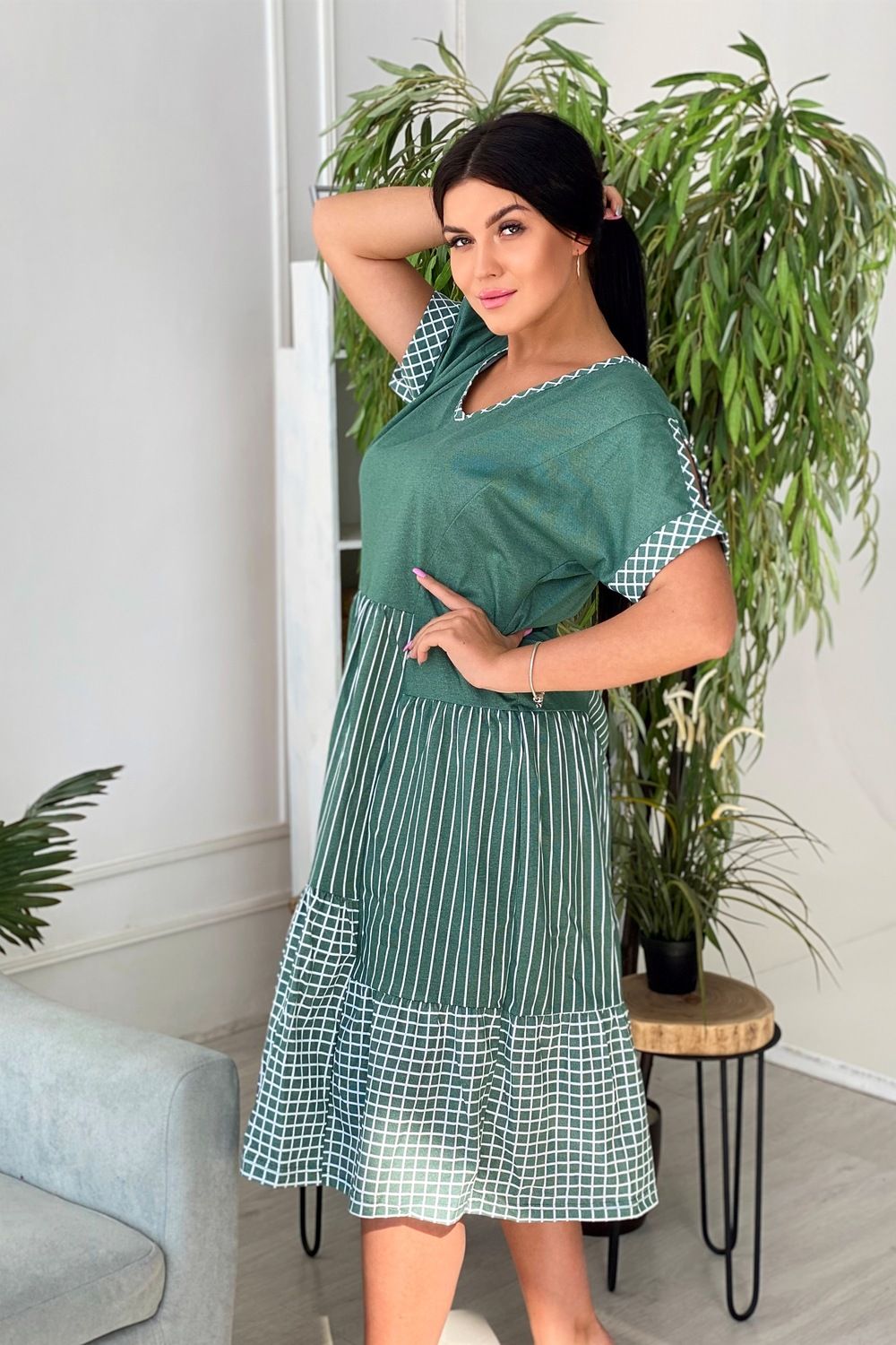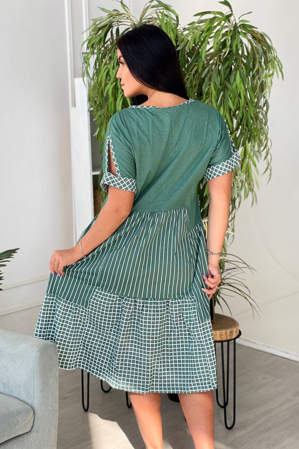 Платье женское полуприлегающего силуэта, к низу расширенное. Рукав цельнокроенный с разрезом, на манжете. Y-образный вырез обработан косой бейкой из ткани в клетку. Низ платья из двух ярусов, расположенных на разных уровнях. Средний ярус из ткани в полоску, нижний - в клетку.