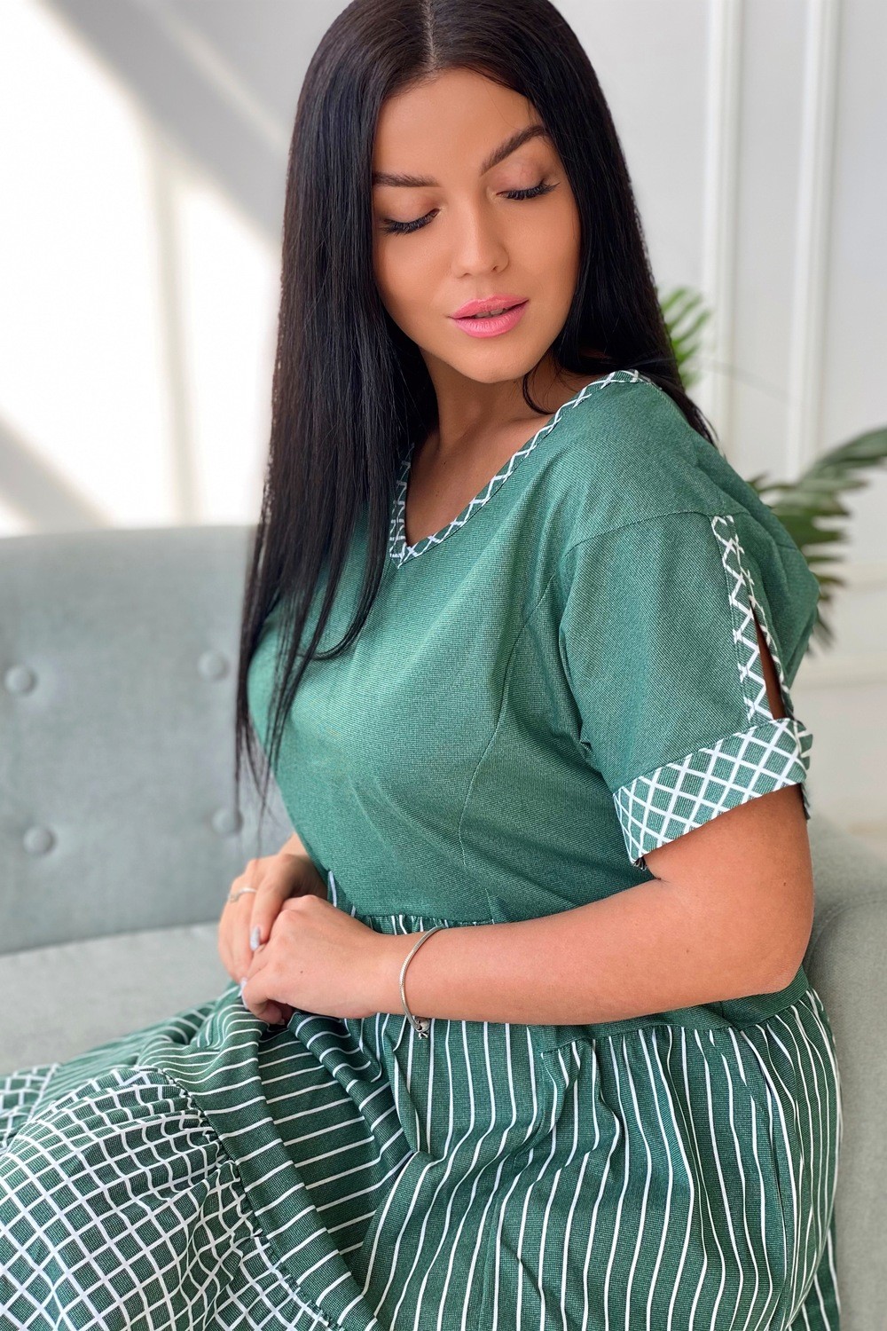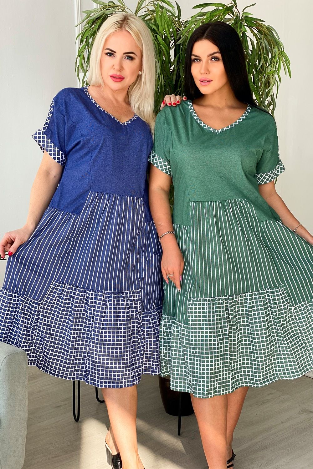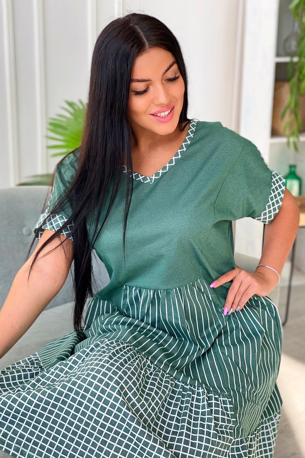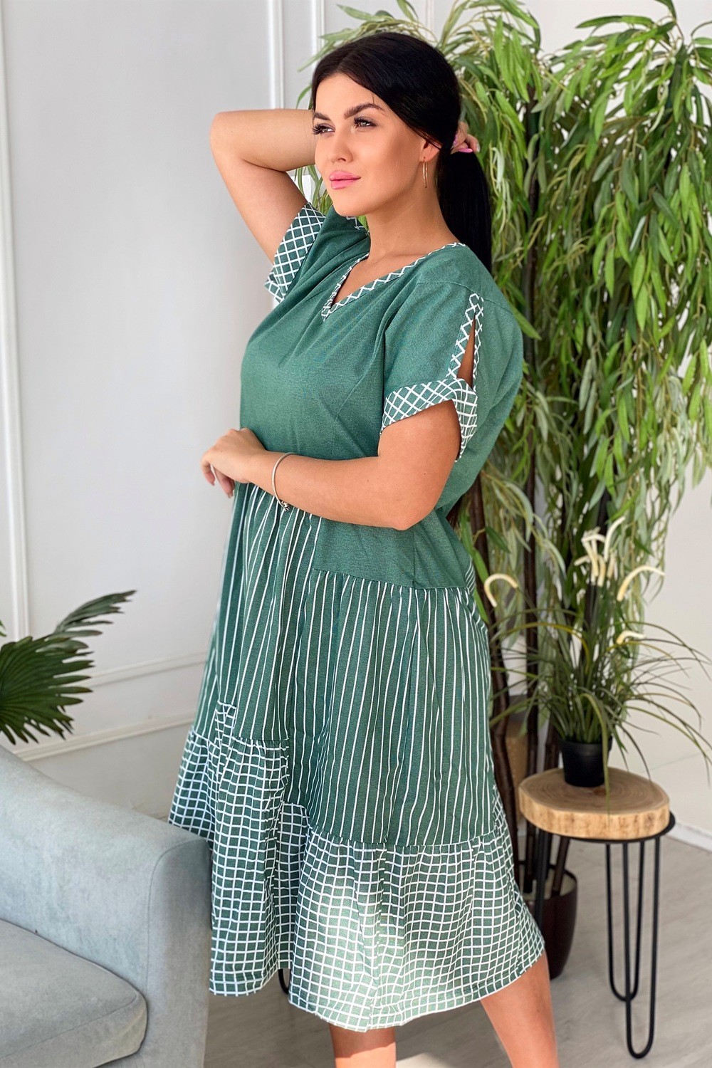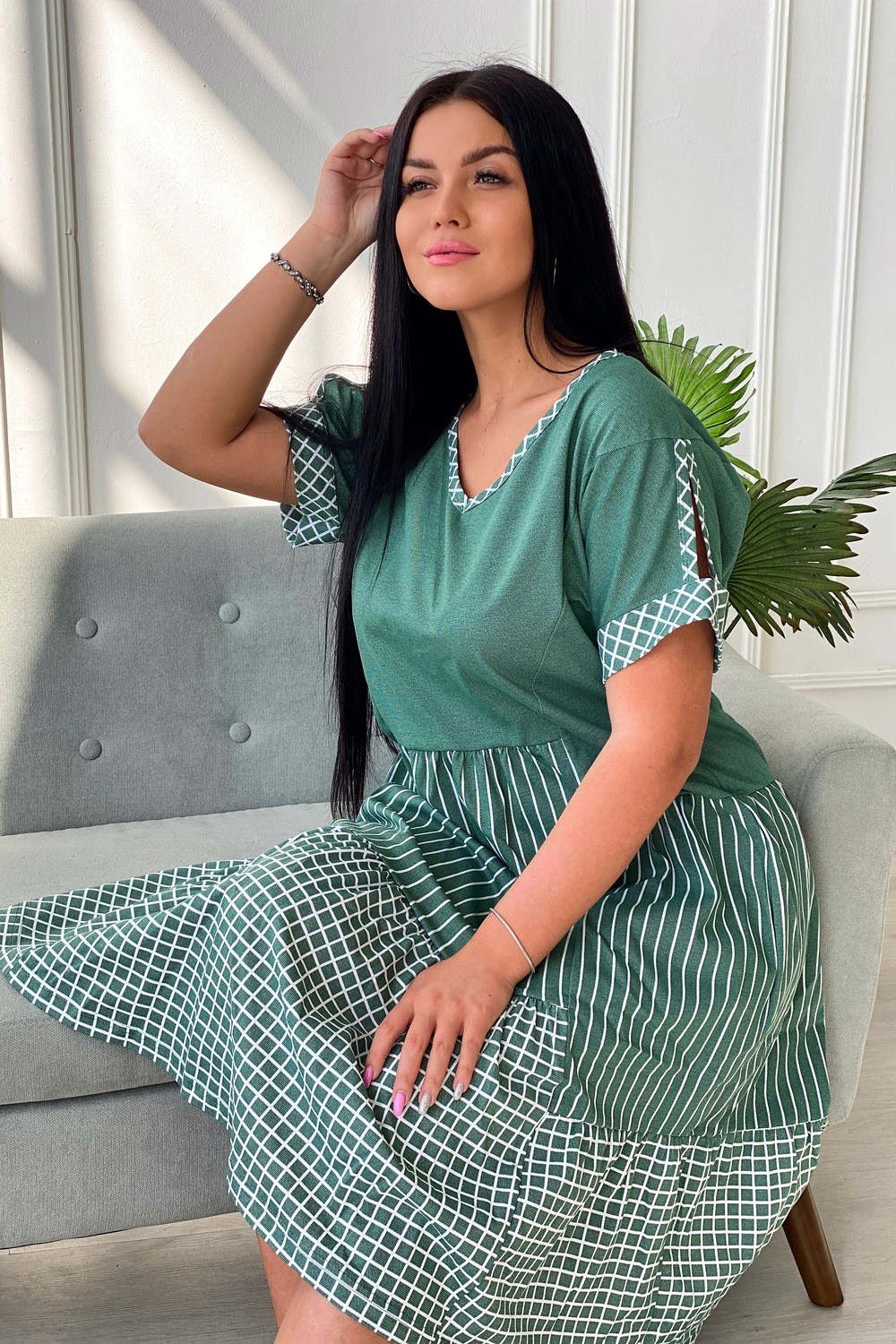 Платье женское полуприлегающего силуэта, к низу расширенное. Рукав цельнокроенный с разрезом, на манжете. Y-образный вырез обработан косой бейкой из ткани в клетку. Низ платья из двух ярусов, расположенных на разных уровнях. Средний ярус из ткани в полоску, нижний - в клетку.