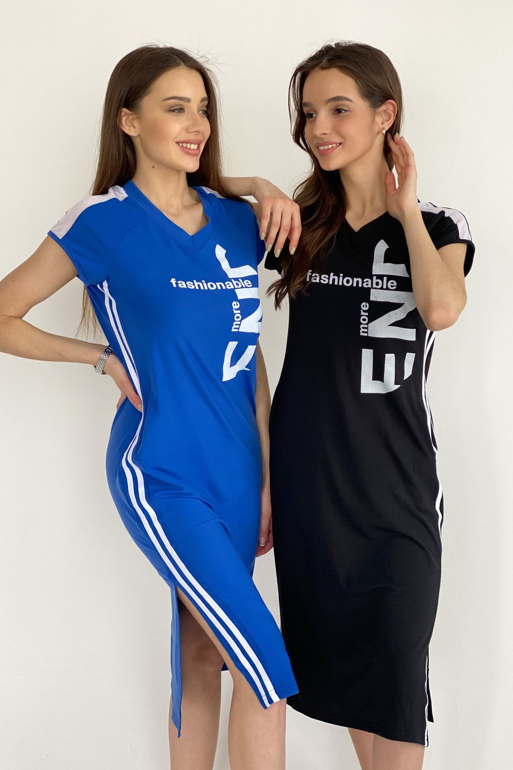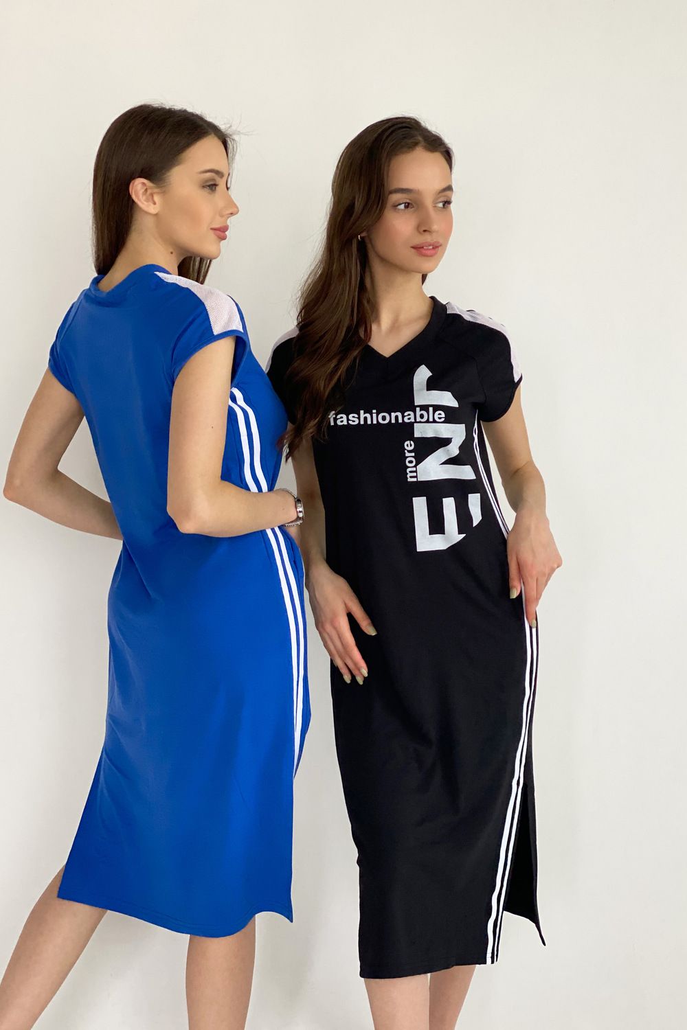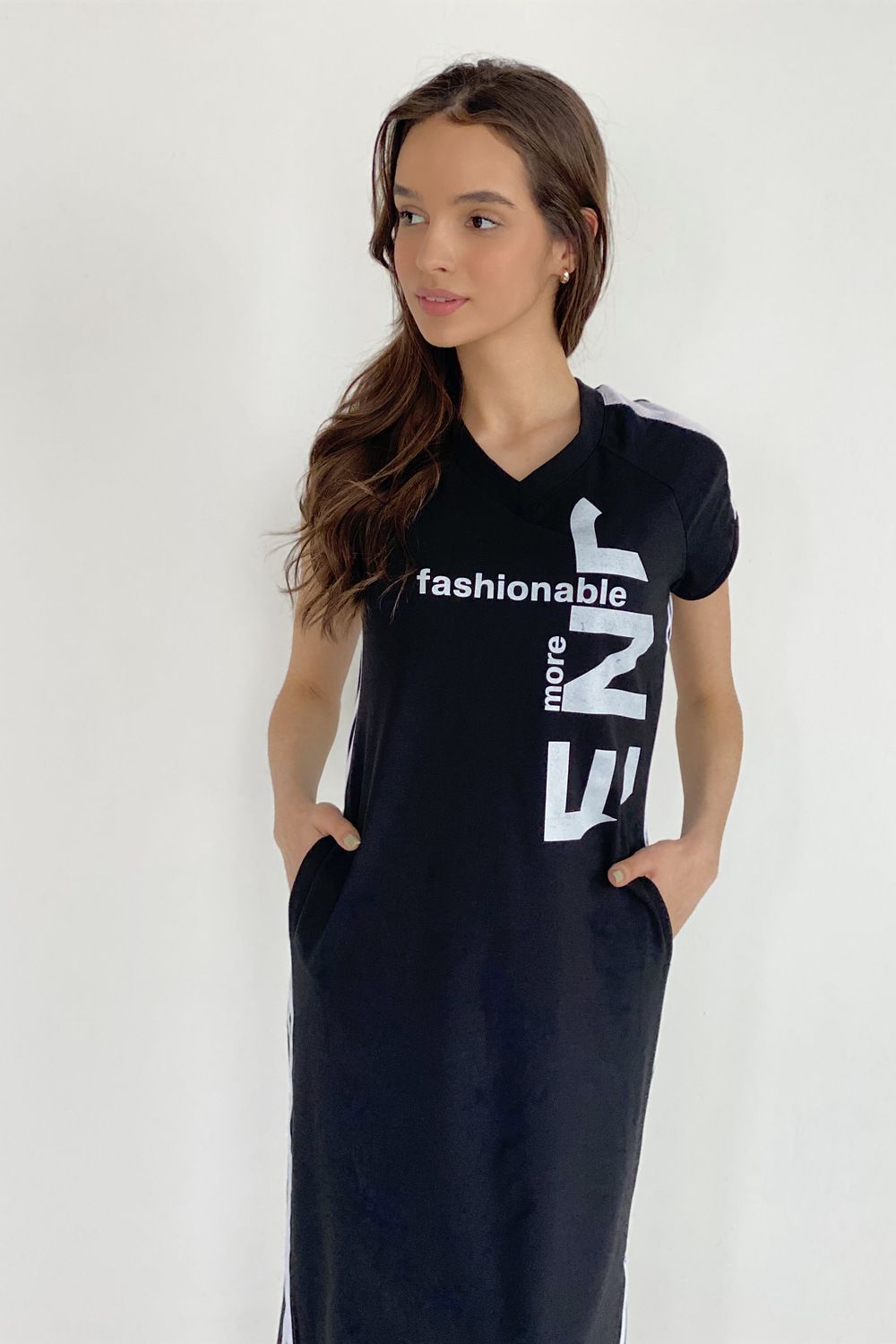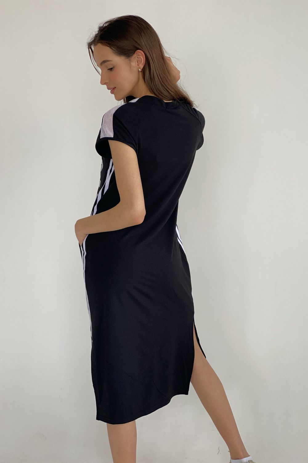 Платье полуприлегающего силуэта, длинное, с V-образной горловиной, с боковыми карманами. Рукав реглан, короткий, со вставкой из сетки. Полочка с лампасами контрастного цвета вдоль боковых швов. В нижней части боковых швов обработаны разрезы. Горловина обработана обтачкой, рукава обработаны бейкой из основного полотна.