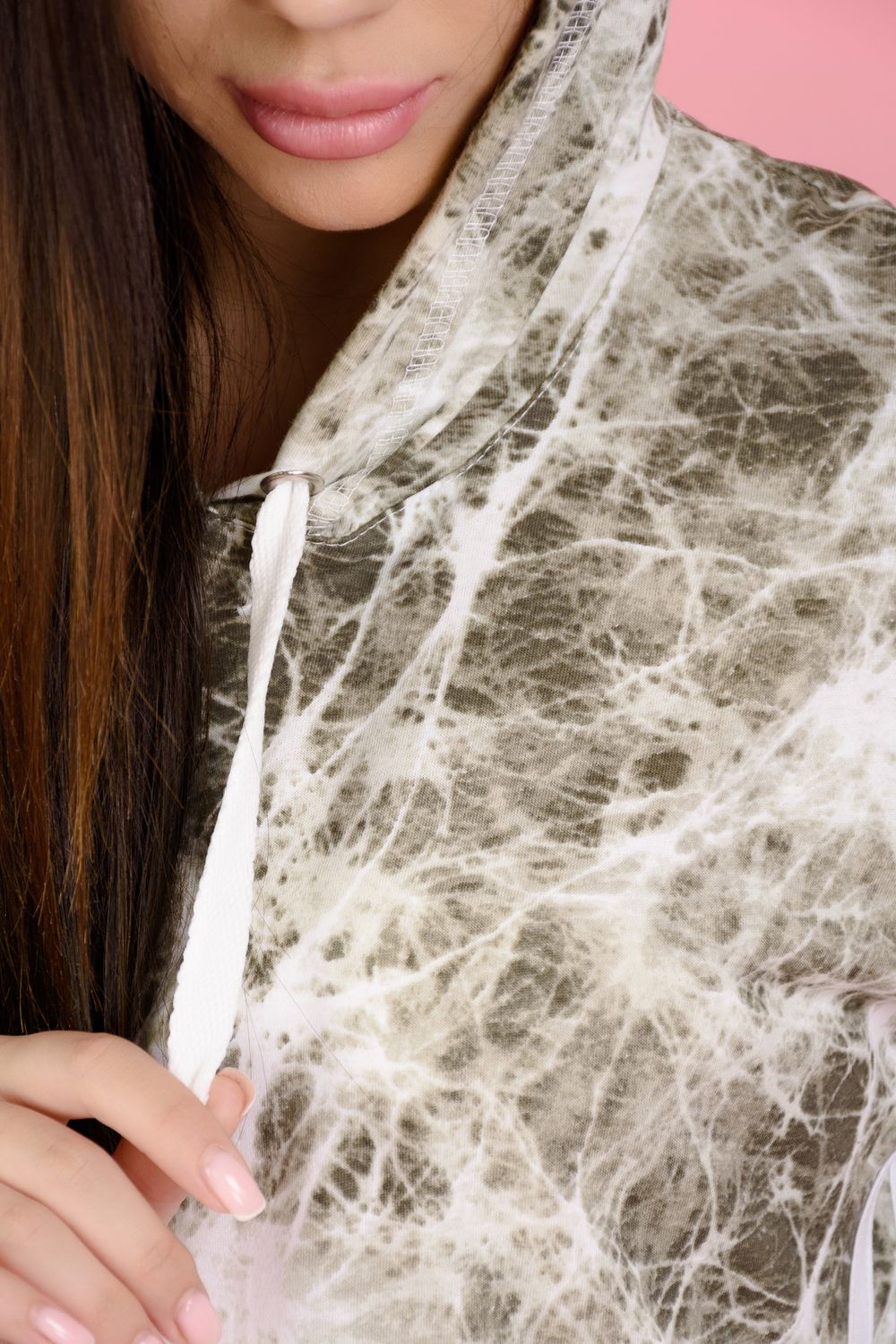Платье прямое, длинное, с капюшоном, с карманом "кенгуру". Рукав короткий, с лампасами из отделочного полотна. Полочка с лампасами из отделочного полотна вдоль боковых швов. В нижней части боковых швов обработаны разрезы.