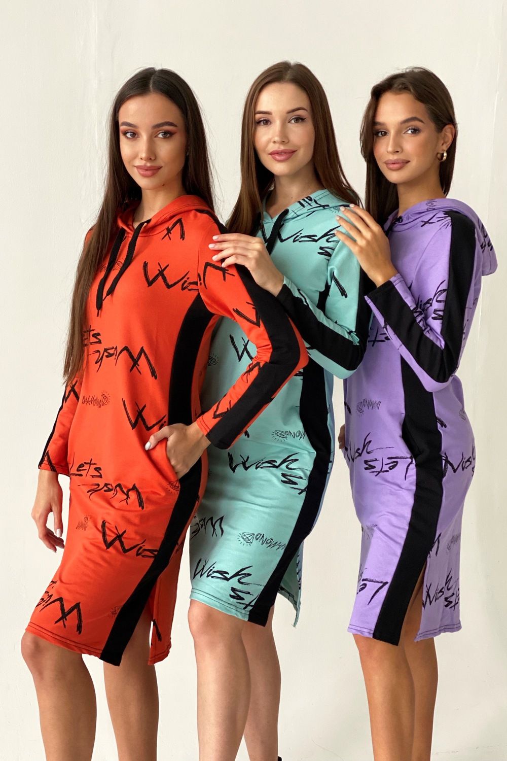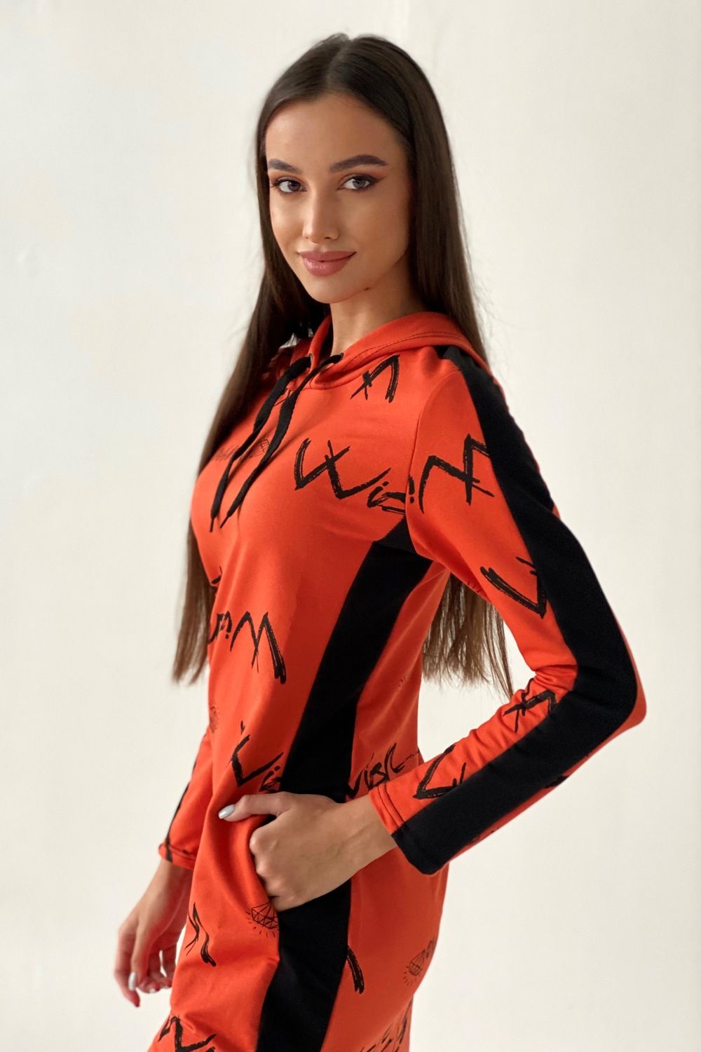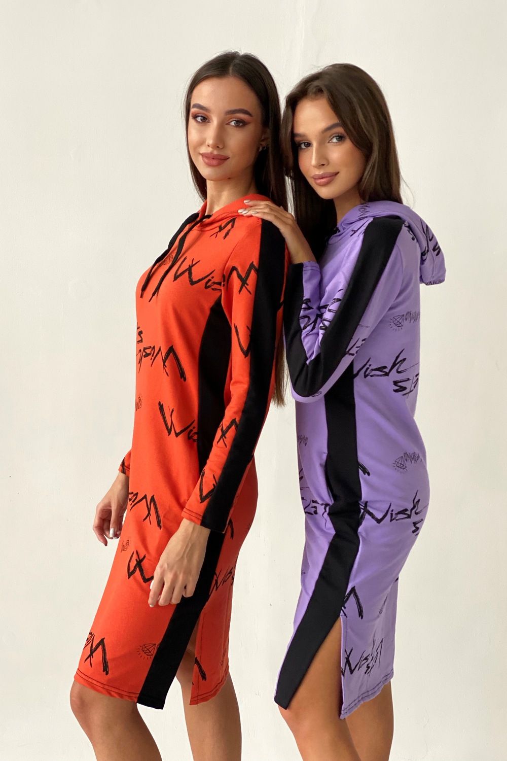 Платье полуприлегающего силуэта, длиной ниже колена, с капюшоном, с боловыми внутренними карманами, с лампасами из отделочного полотна, с высокими разрезами в нижней части боковых швов. Рукав втачной, длинный, с лампасами из отделочного полотна вдоль рукава.
