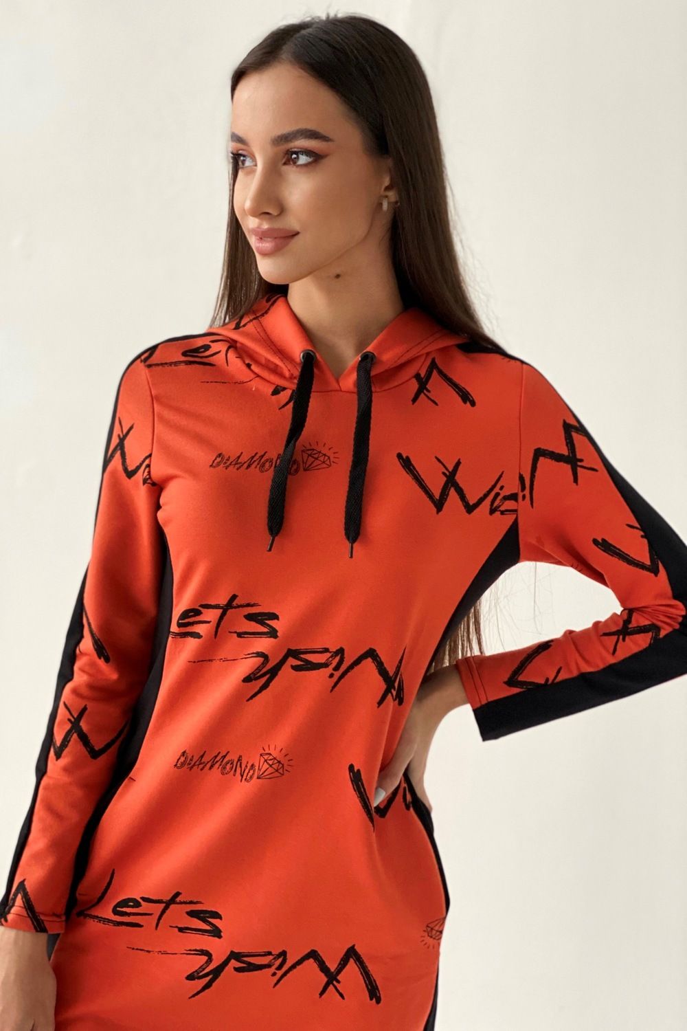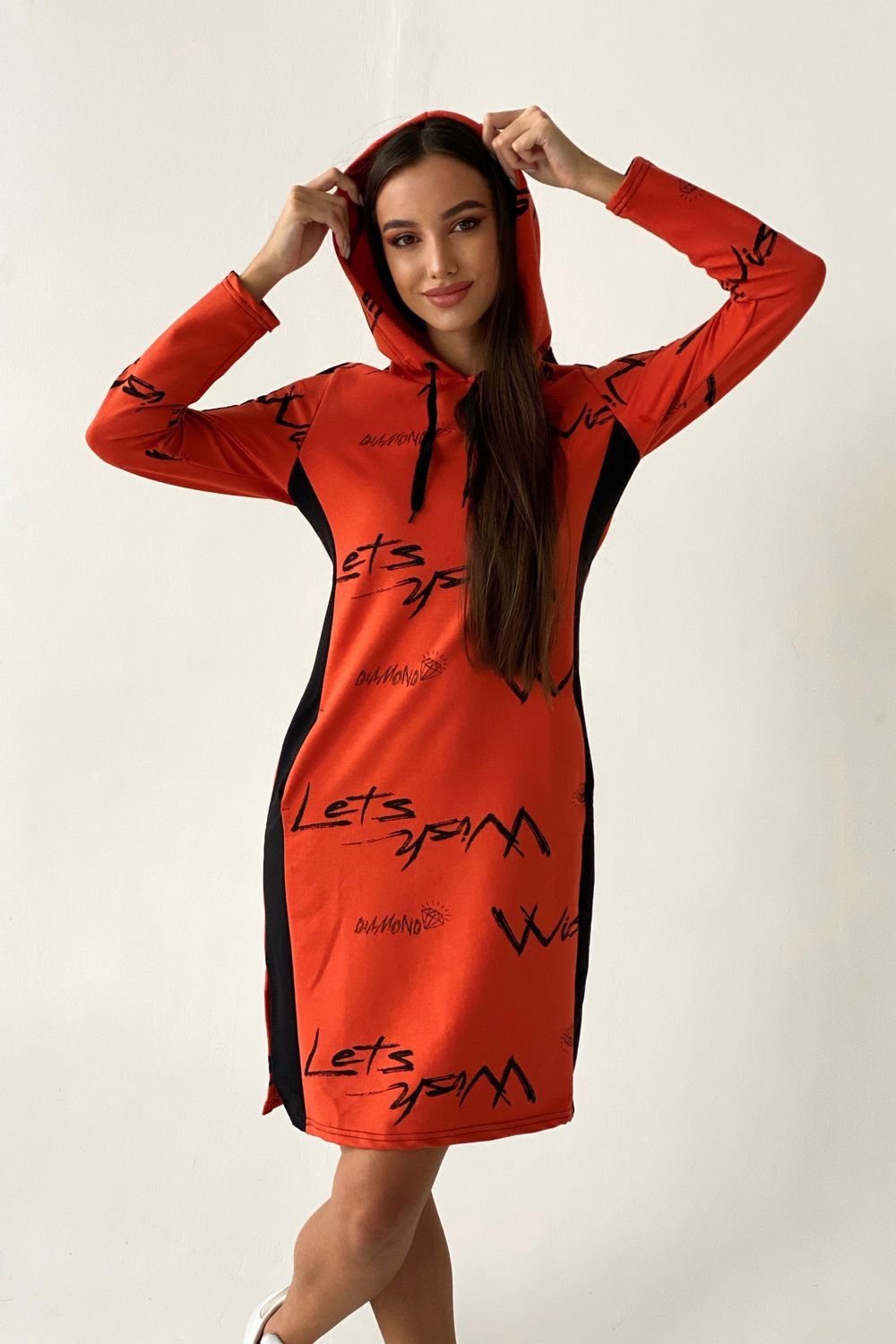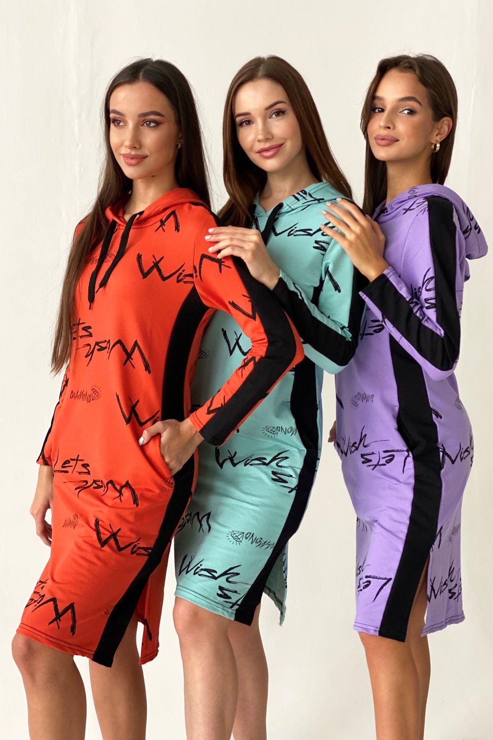 Платье полуприлегающего силуэта, длиной ниже колена, с капюшоном, с боловыми внутренними карманами, с лампасами из отделочного полотна, с высокими разрезами в нижней части боковых швов. Рукав втачной, длинный, с лампасами из отделочного полотна вдоль рукава.