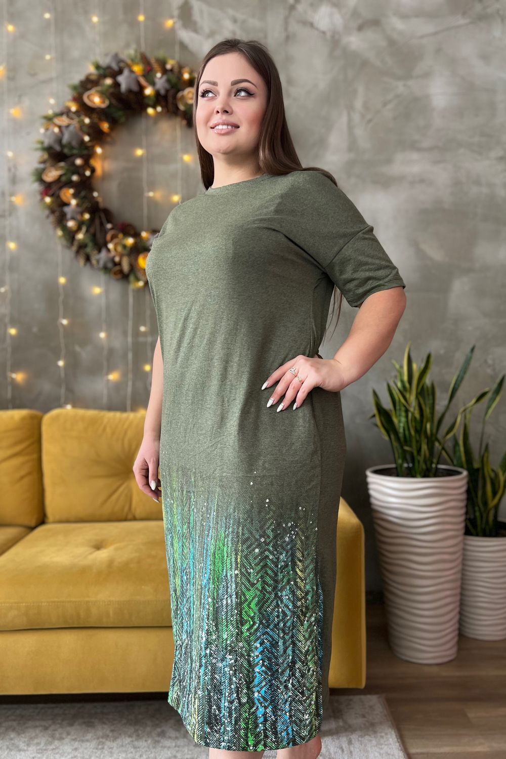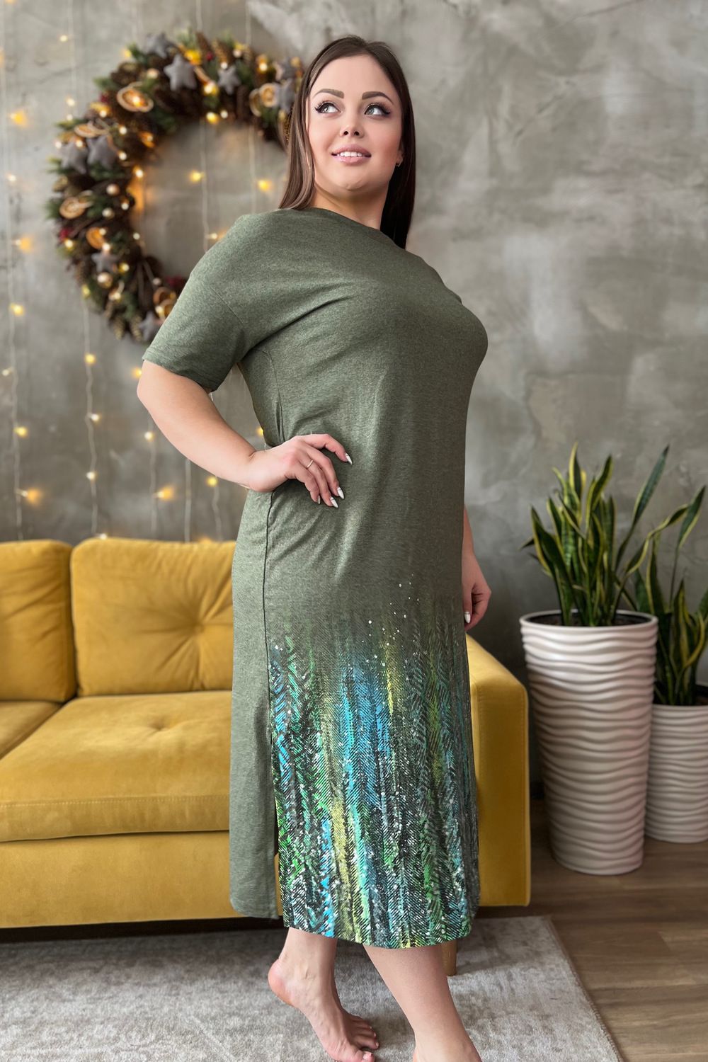 Платье прямого силуэта, с округлой горловиной, с разрезами в нижней части боковых швов. Рукав короткий. Горловина обработана обтачкой из основного полотна. На модели 52 размер
