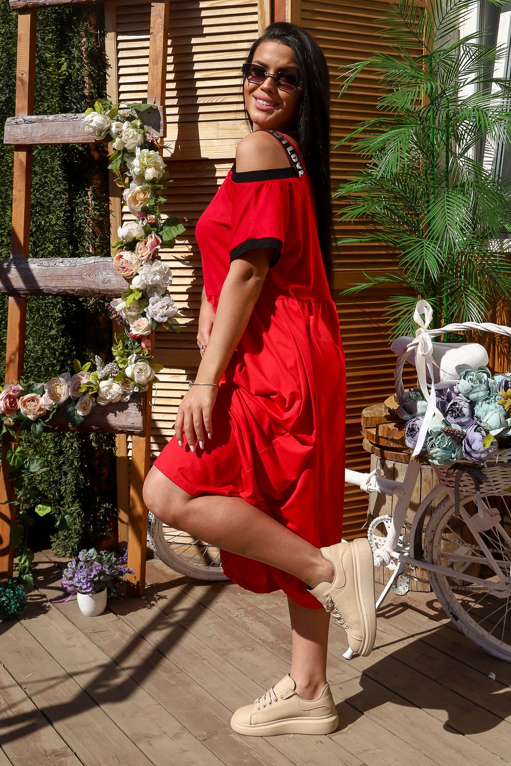 Фасон платья позволяет легко скрыть недостатки фигуры и при этом элегантно выглядеть! Платье отрезное выше линии талии, длиной ниже колена. Рукав цельнокроеный, короткий, с манжетом из отделочного полотна. Верхняя часть платья выполнена из эластичного полотна, юбка со сборкой по линии талии. Горловина асимметричная, с эластичной бретелью, обработана обтачкой из отделочного полотна.