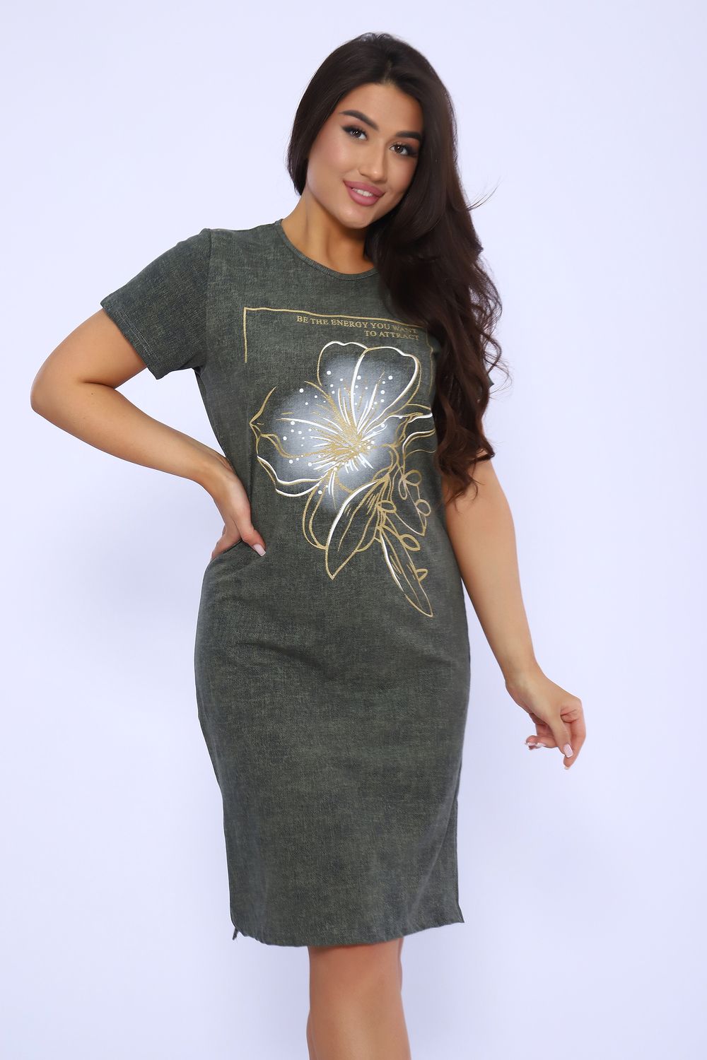 Платье женское укороченное с оригинальным принтом спереди выполнено из кулирки 100% хлопок. Короткий рукав, горловина обработана узким кантом, по бокам разрезы. Платье отлично подойдет как для дома. Так и для прогулок и отдыха.