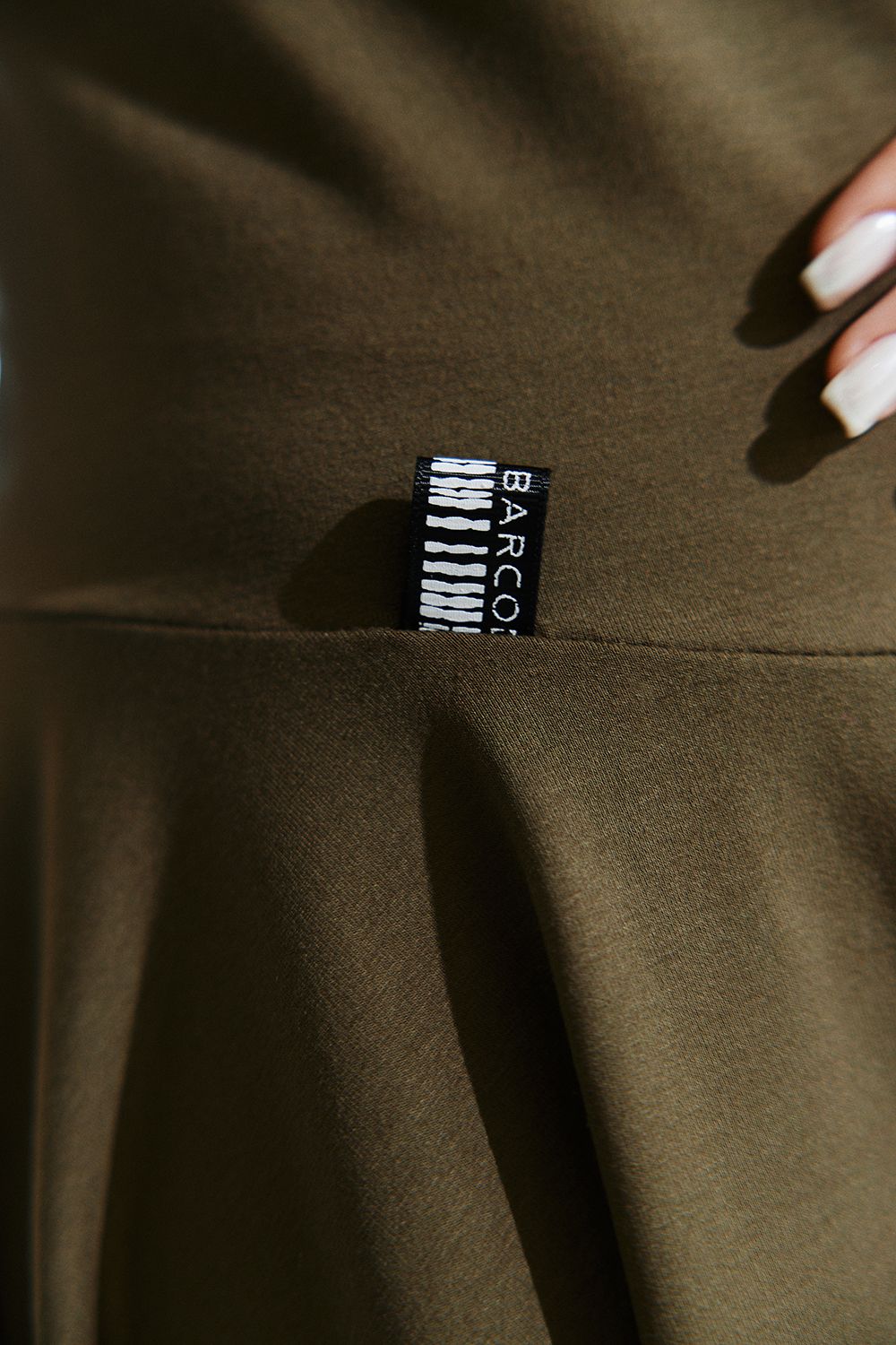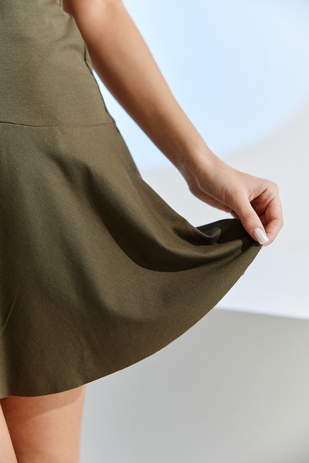 Платье полуприлегающего силуэта, с V-образной горловиной, длиной выше колена, без рукавов, с асимметричным воланом в нижней части. Горловина полочки обработана декоративной обтачкой с контрастными полосами из эластичного полотна. Горловина спинки и проймы обработаны бейкой из основного полотна.