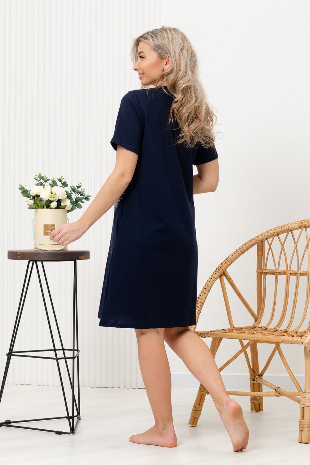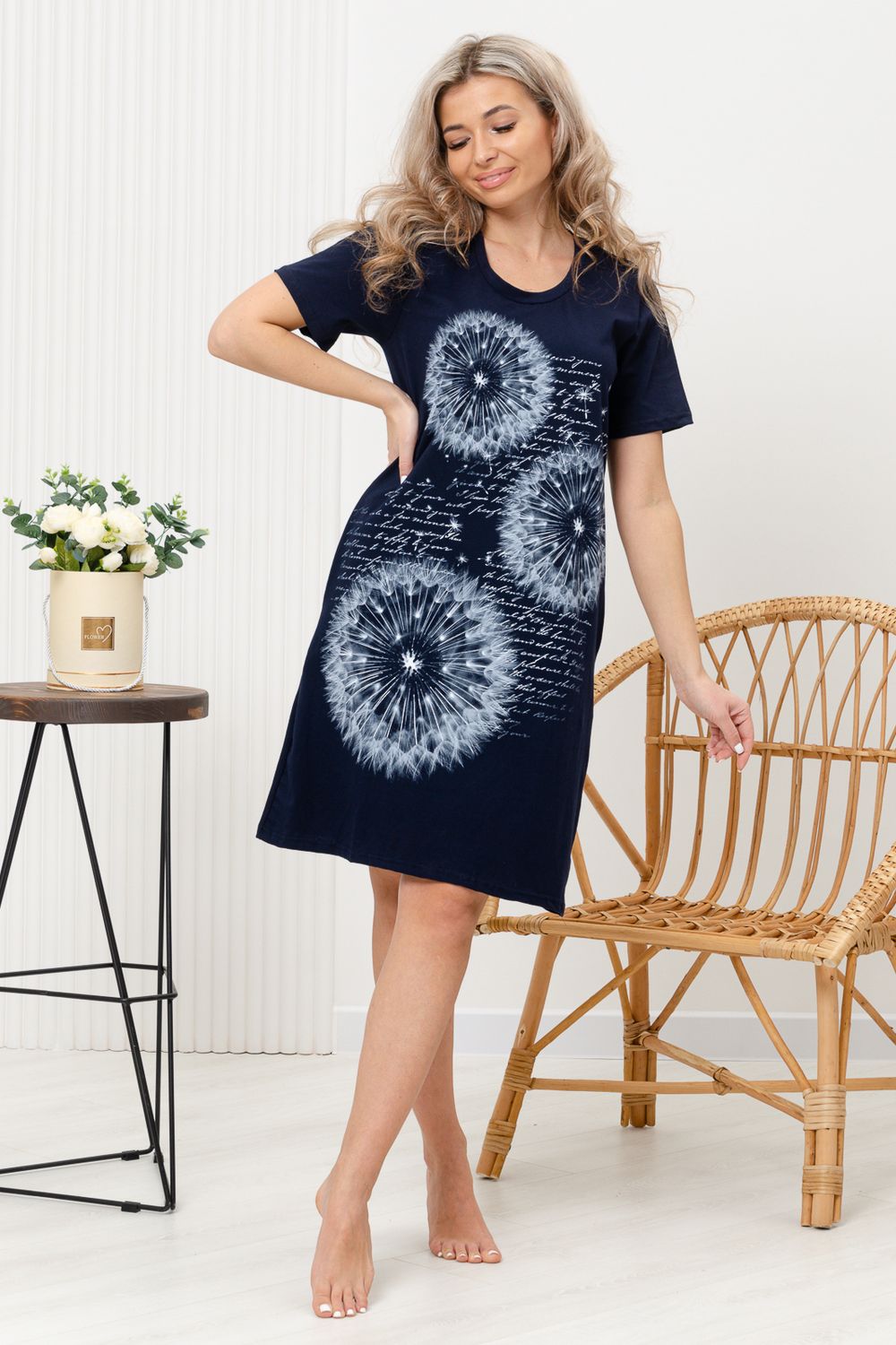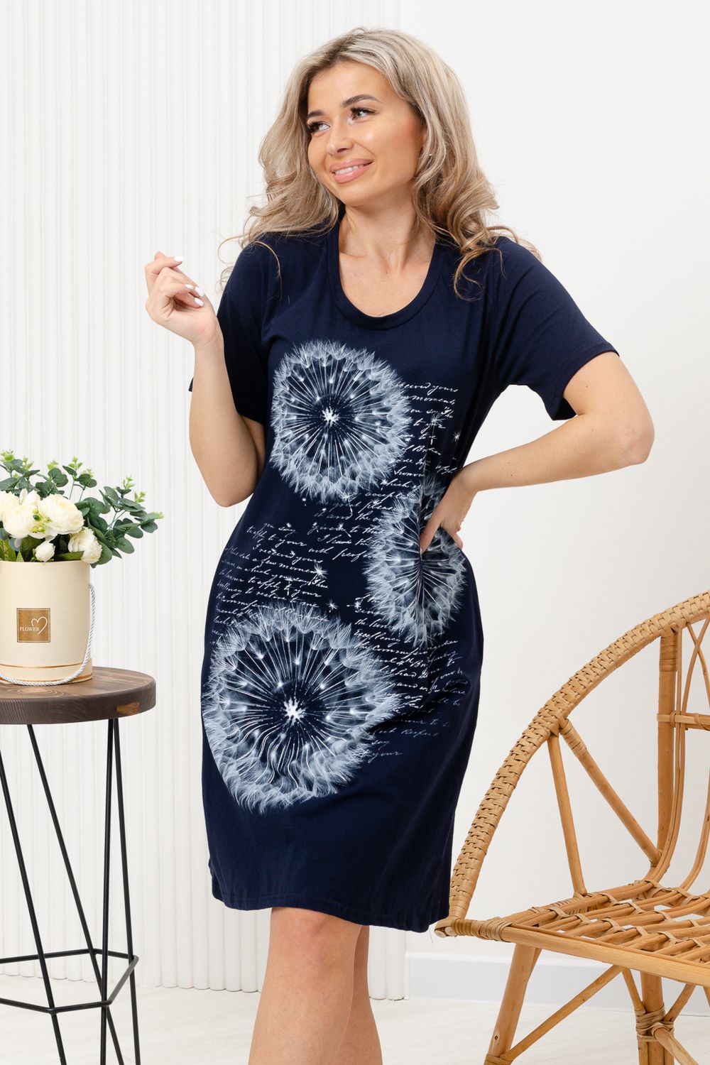 Платье-туника свободного кроя с коротким рукавом. Спереди платья большой красивый принт -одуванчики, в боках карманы, к низу платье расклешено. Горловина обработана бейкой из основной ткани, рукава-подшивка.
