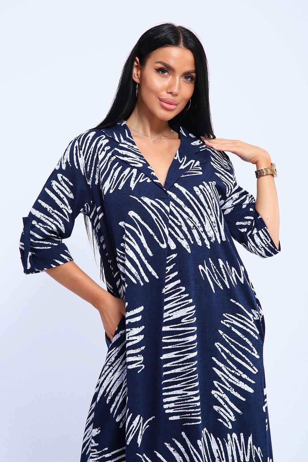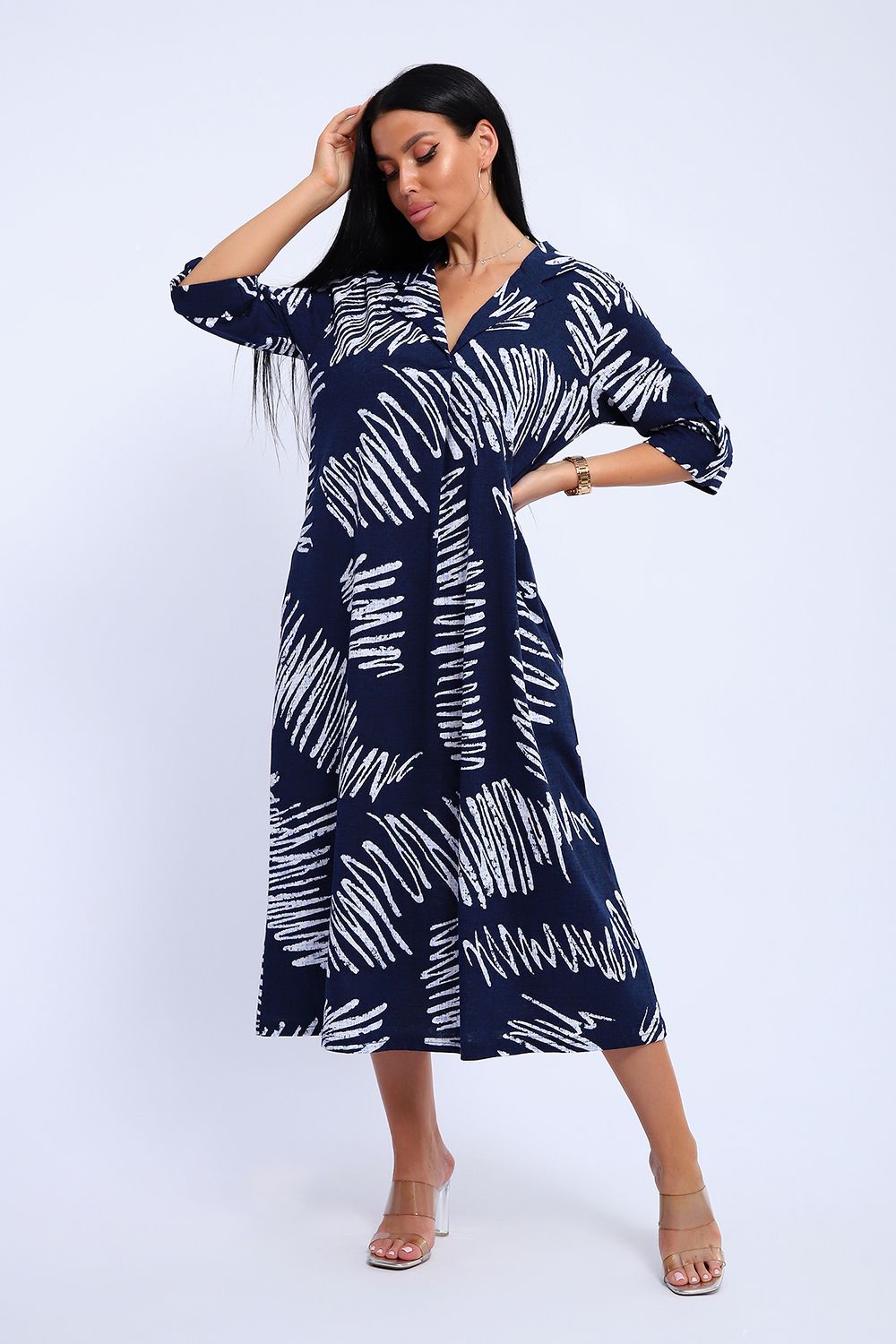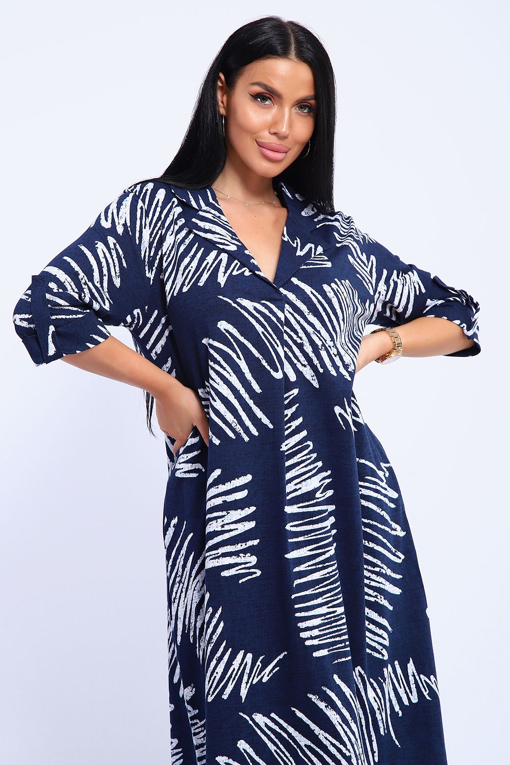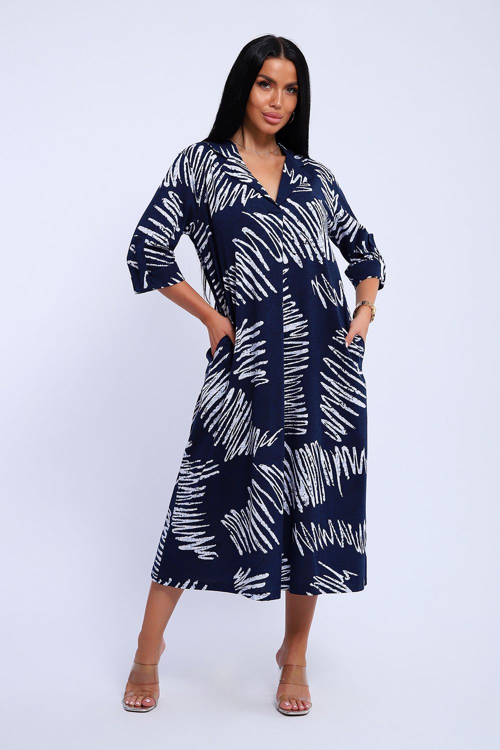 Платье женское свободного покроя. Воротник отложной рубашечного типа, образует V-образный вырез. Платье с карманами в боковых швах. Длина платья чуть выше щиколотки. Рукав 3/4 с манжетой, поднят патой.