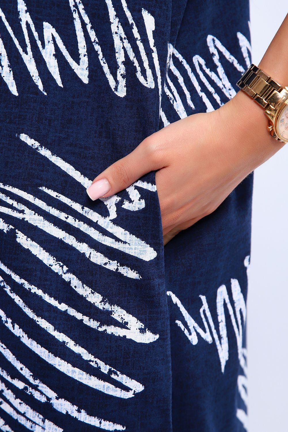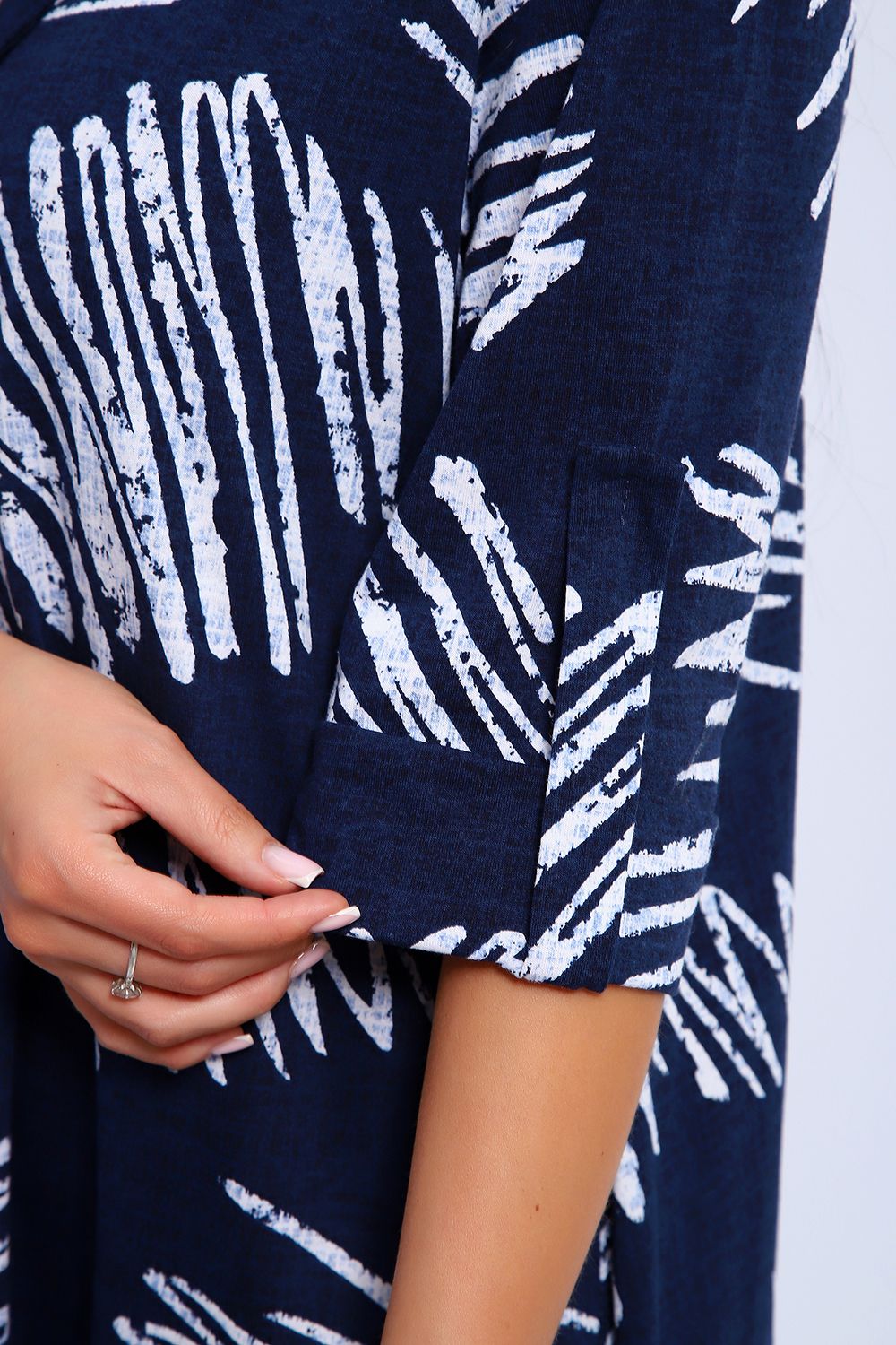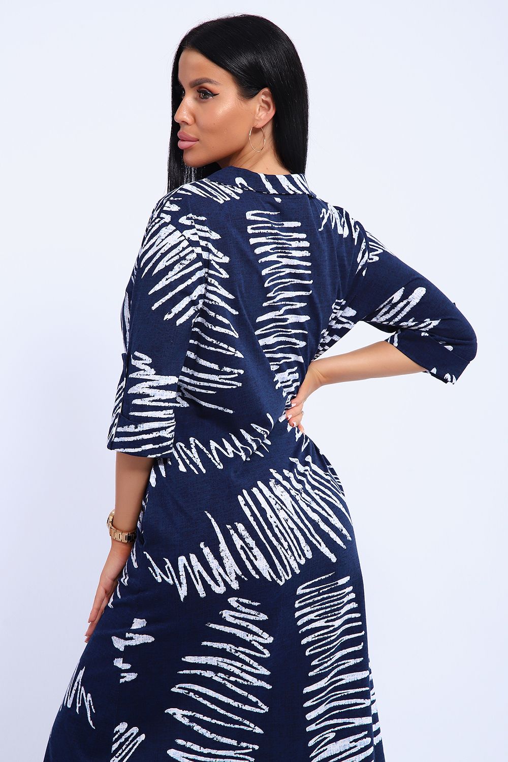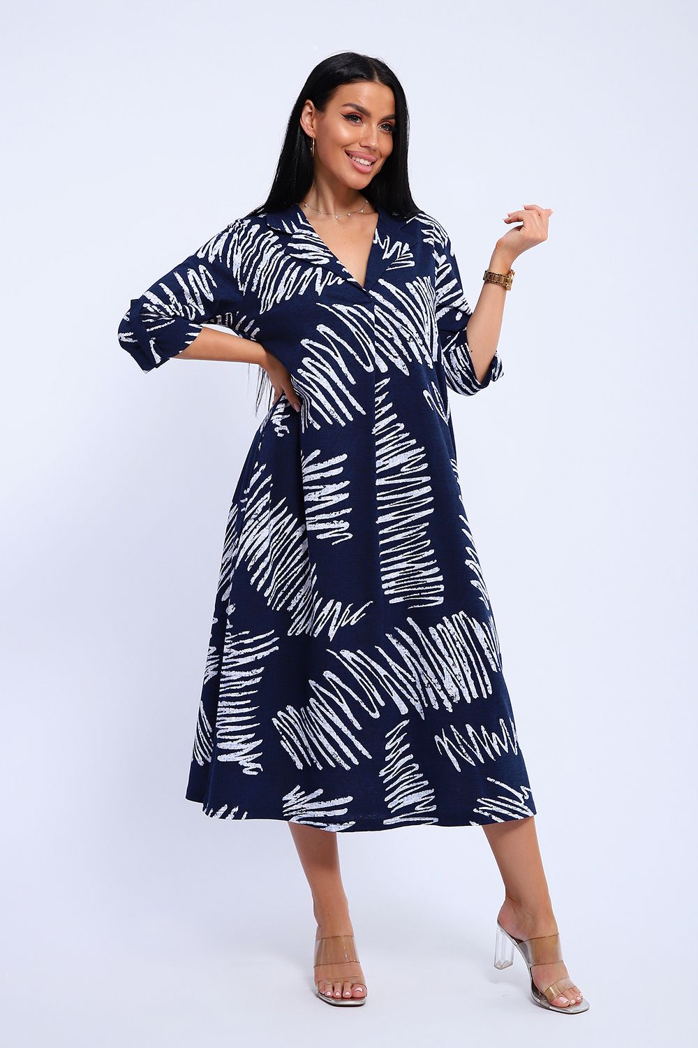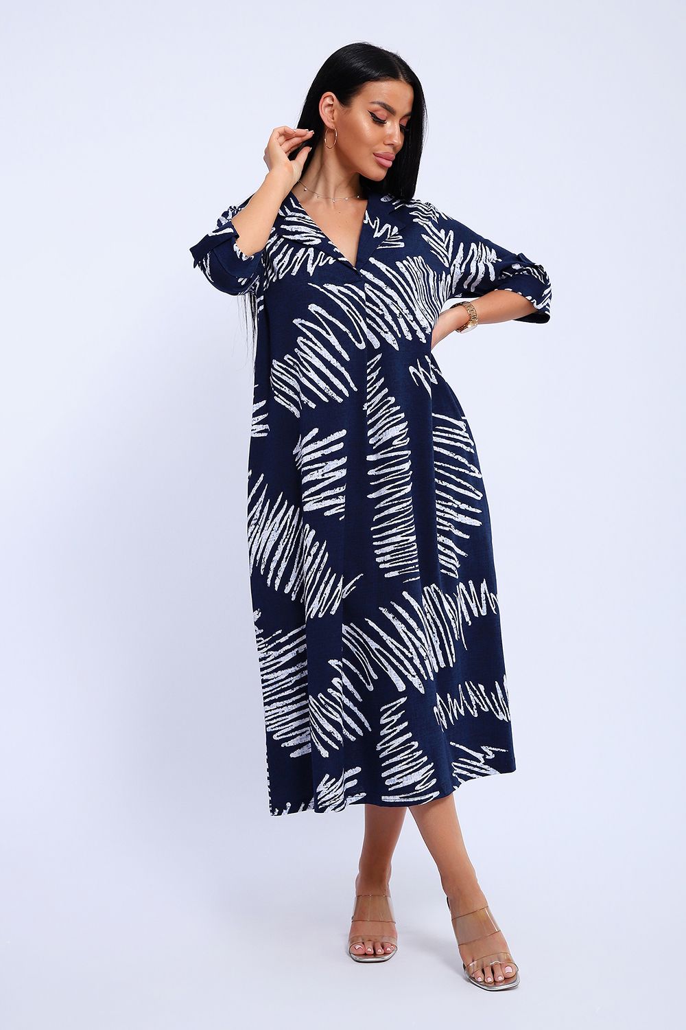 Платье женское свободного покроя. Воротник отложной рубашечного типа, образует V-образный вырез. Платье с карманами в боковых швах. Длина платья чуть выше щиколотки. Рукав 3/4 с манжетой, поднят патой.