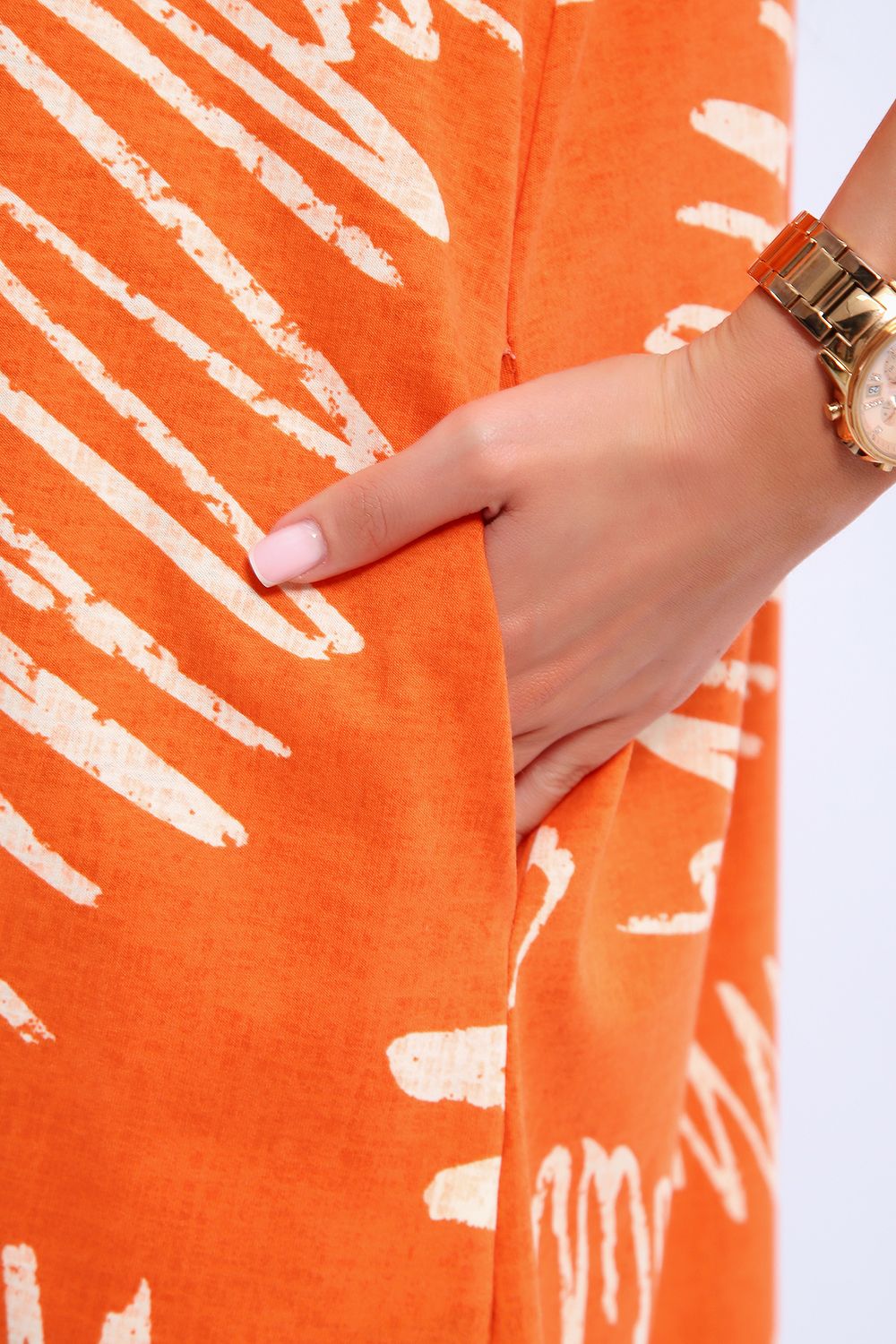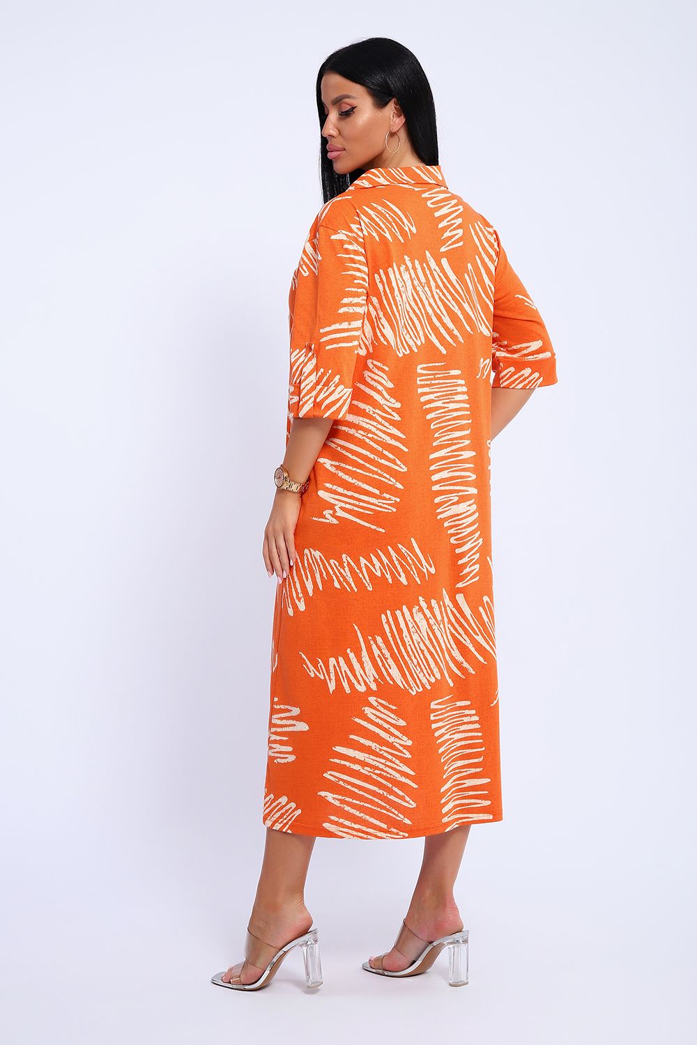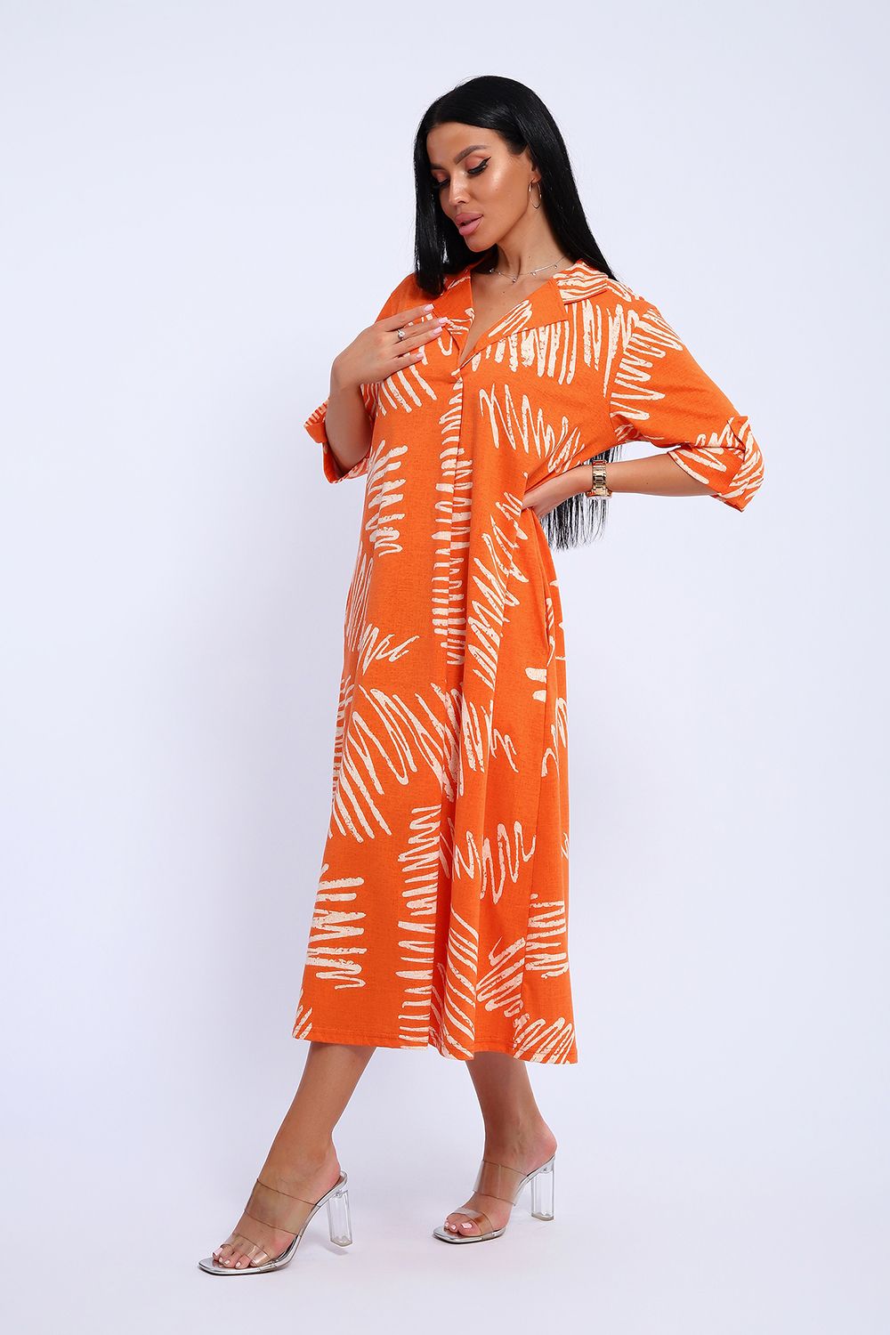 Платье женское свободного покроя. Воротник отложной рубашечного типа, образует V-образный вырез. Платье с карманами в боковых швах. Длина платья чуть выше щиколотки. Рукав 3/4 с манжетой, поднят патой.