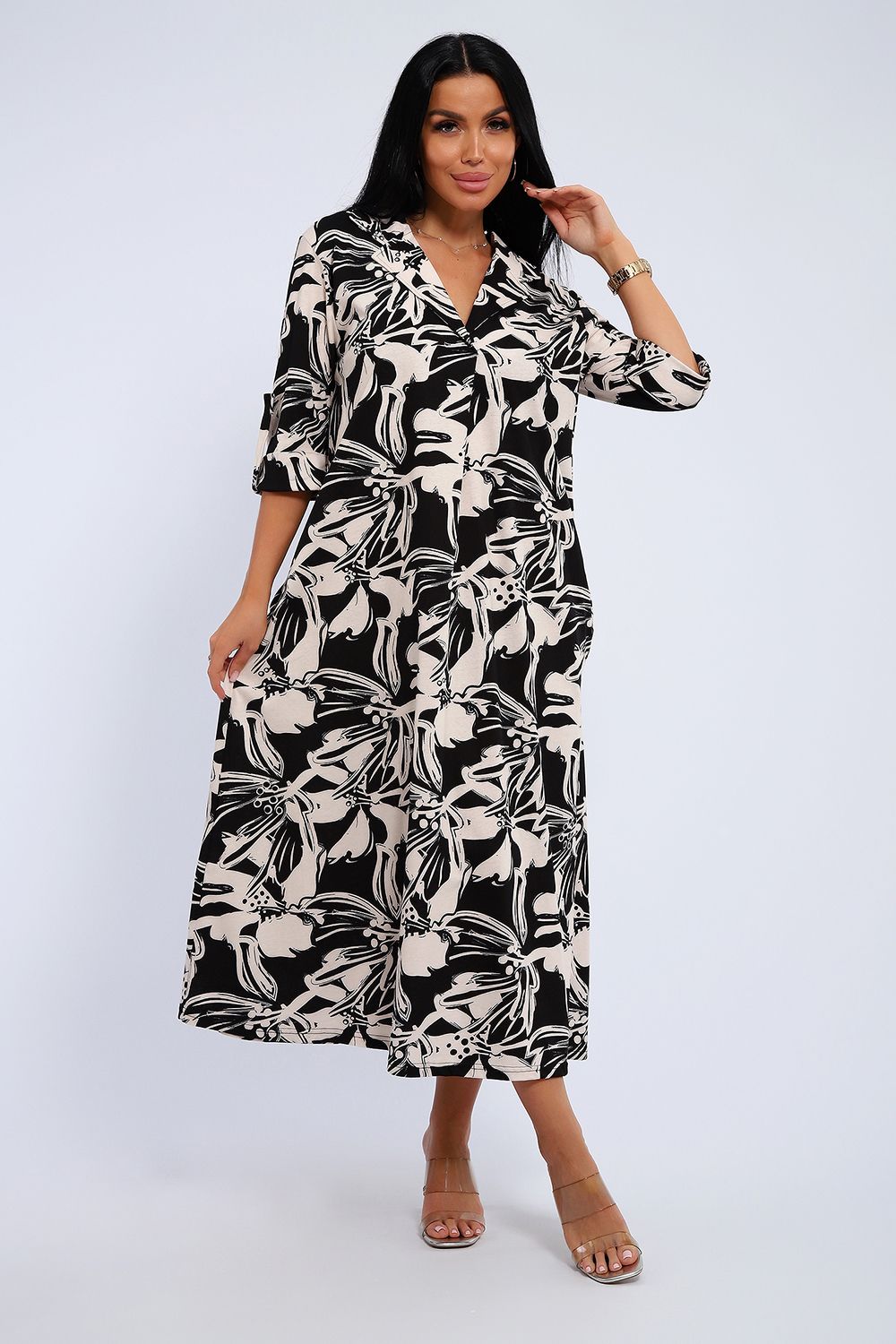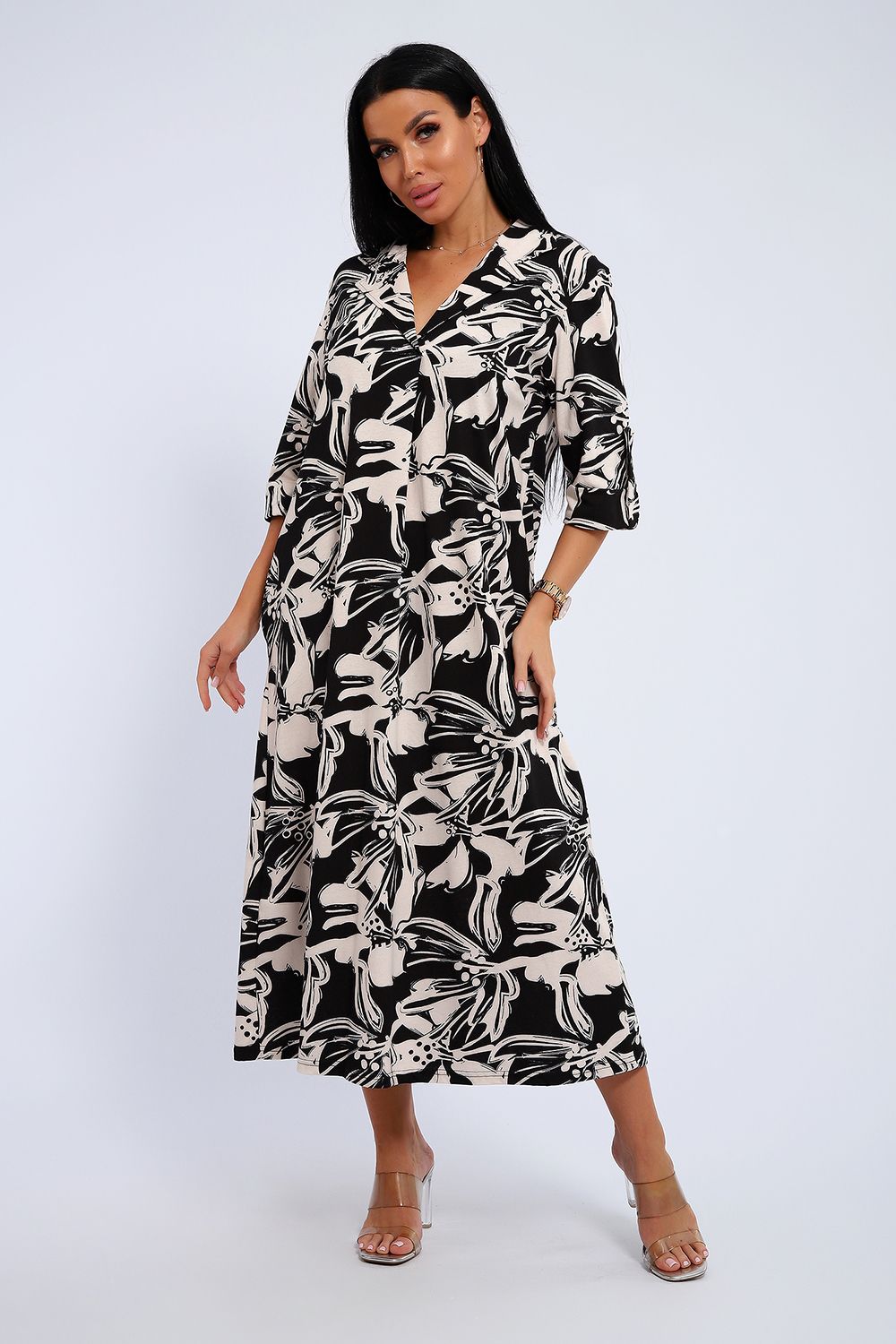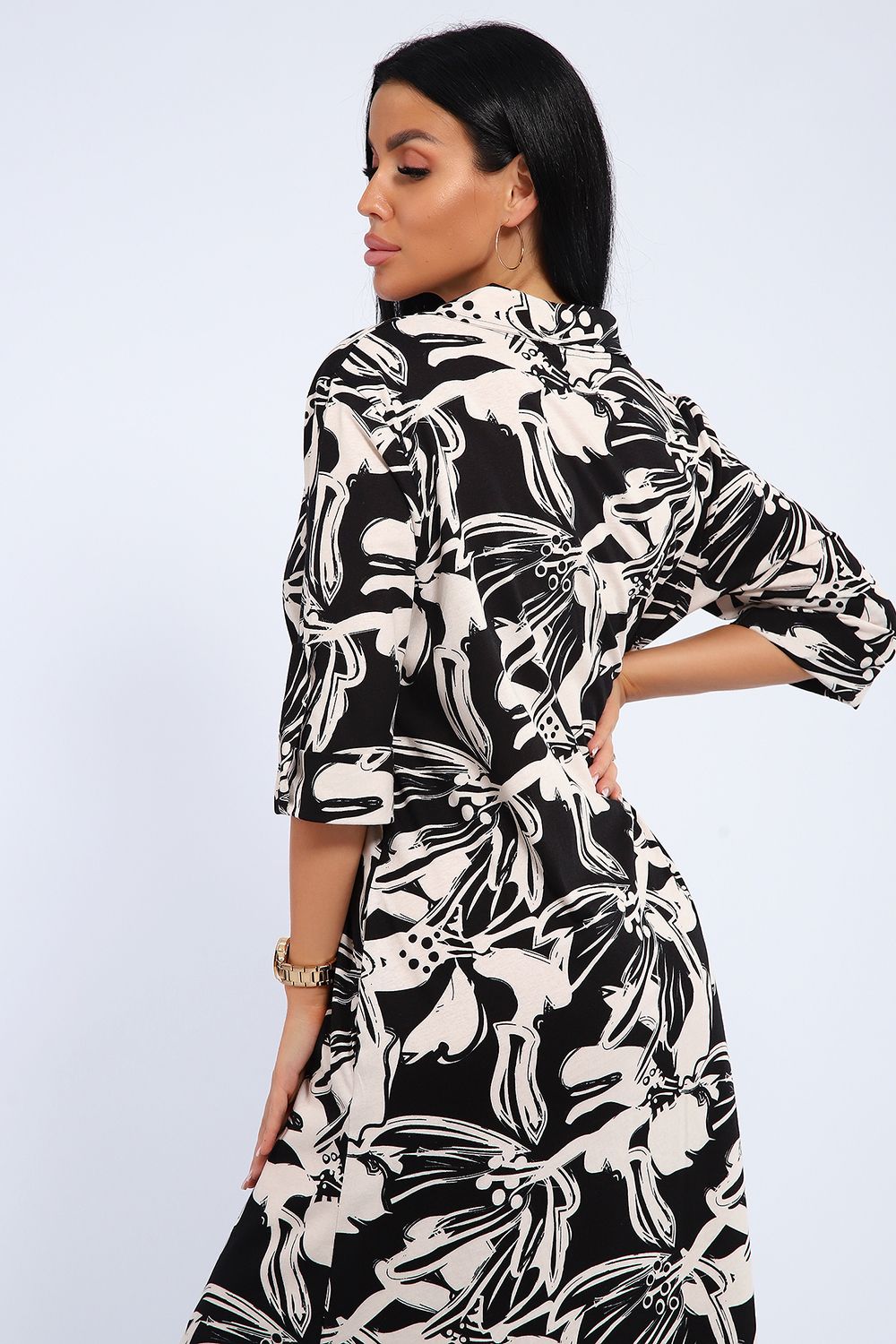 Платье женское свободного покроя. Воротник отложной рубашечного типа, образует V-образный вырез. Платье с карманами в боковых швах. Длина платья чуть выше щиколотки. Рукав 3/4 с манжетой, поднят патой.