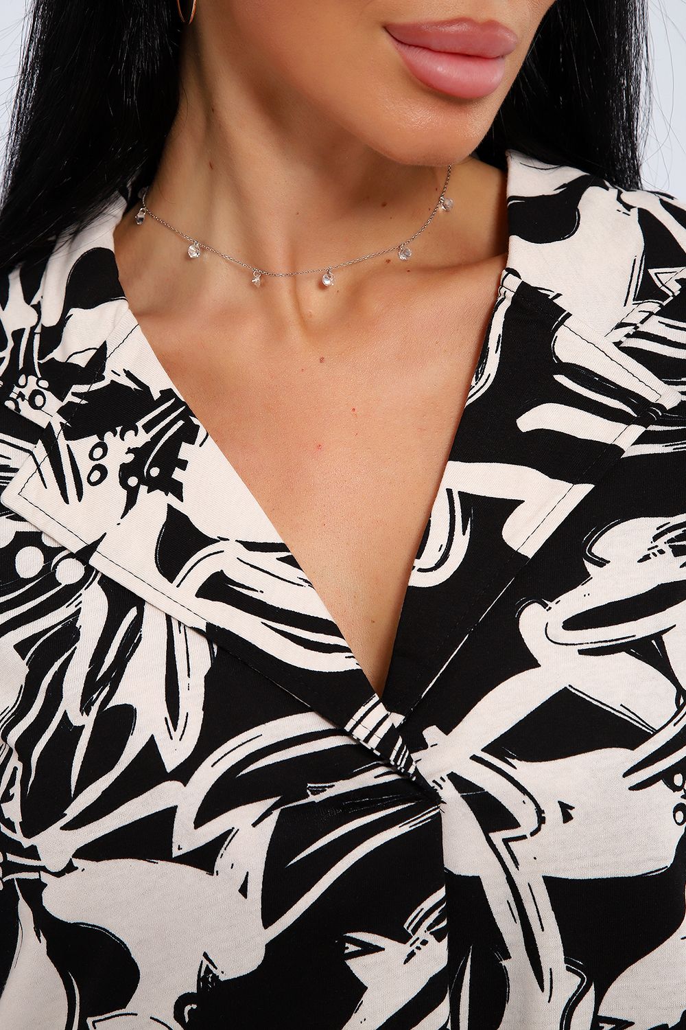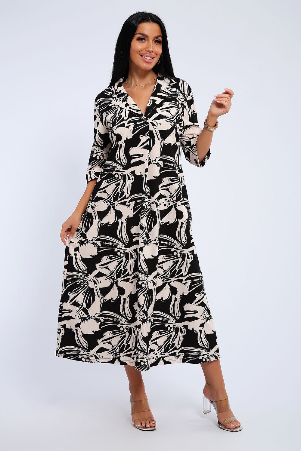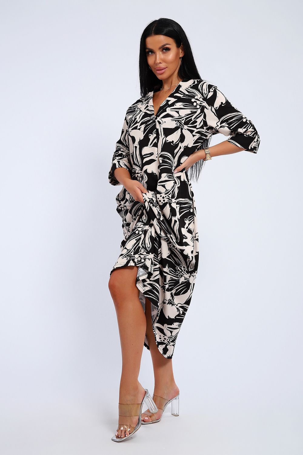 Платье женское свободного покроя. Воротник отложной рубашечного типа, образует V-образный вырез. Платье с карманами в боковых швах. Длина платья чуть выше щиколотки. Рукав 3/4 с манжетой, поднят патой.