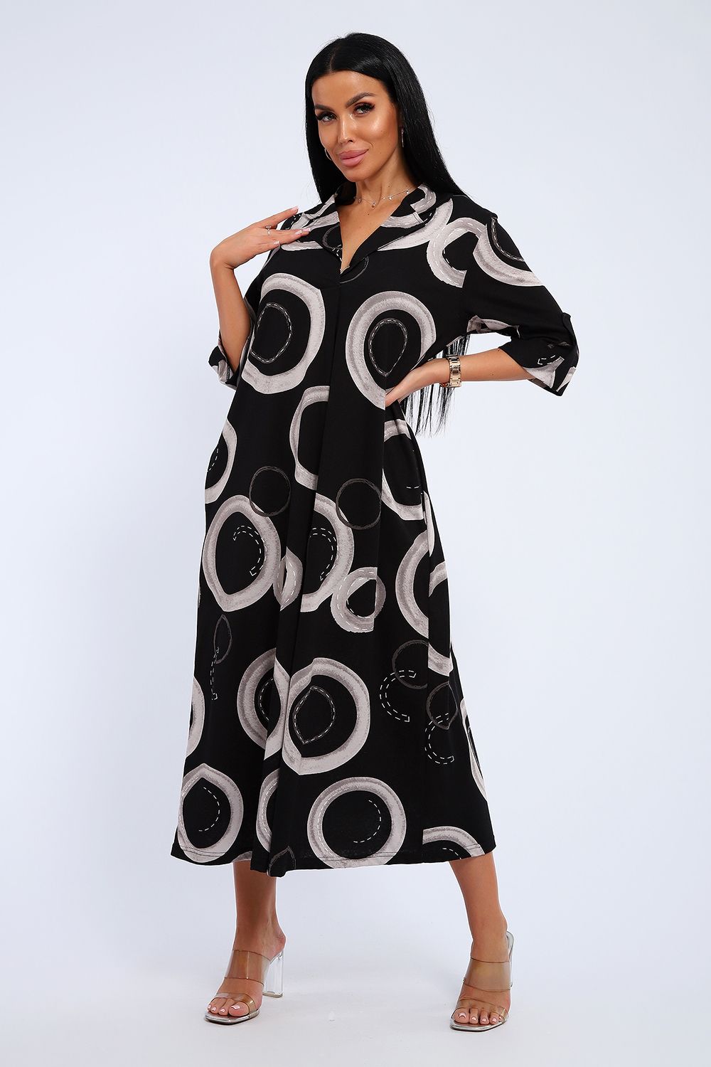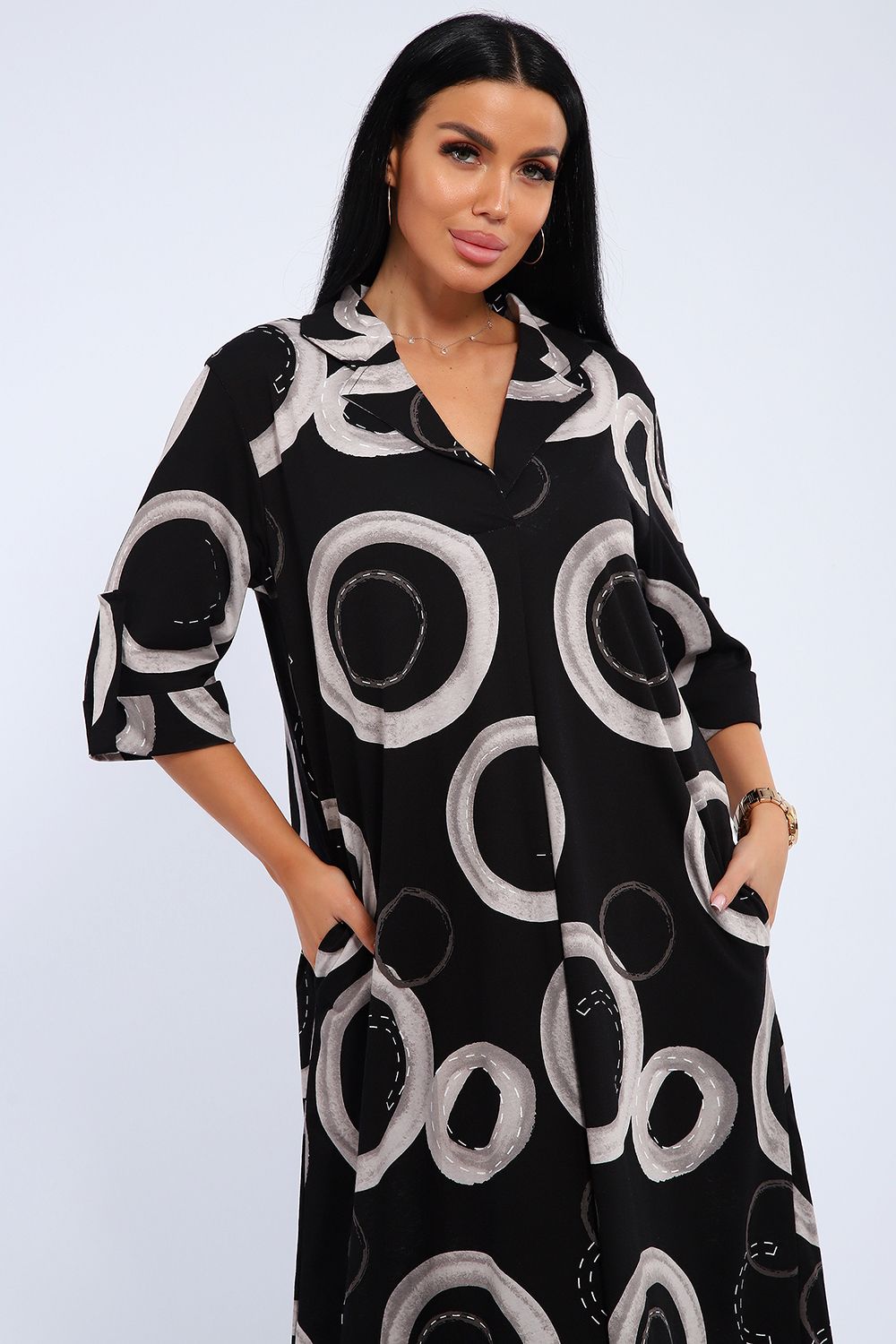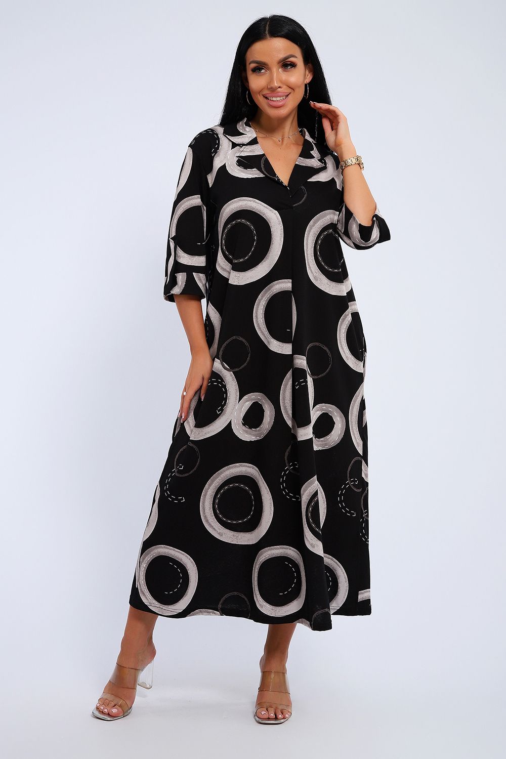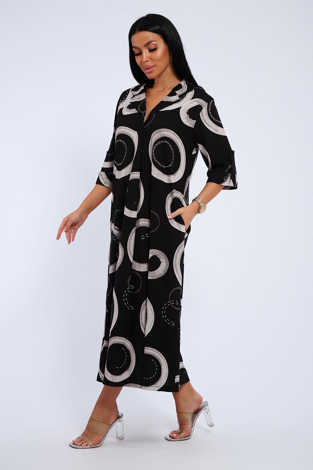 Платье женское свободного покроя. Воротник отложной рубашечного типа, образует V-образный вырез. Платье с карманами в боковых швах. Длина платья чуть выше щиколотки. Рукав 3/4 с манжетой, поднят патой.