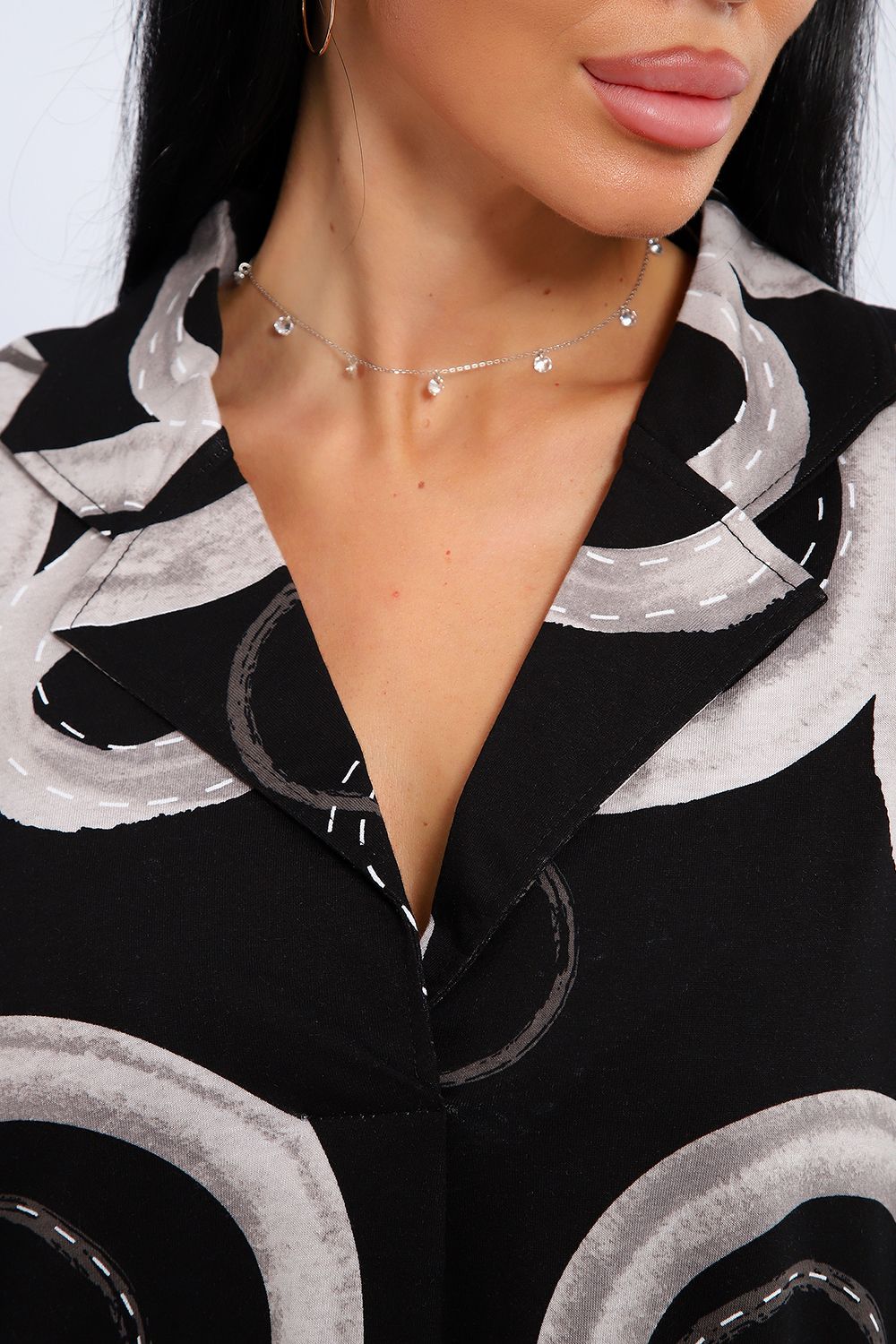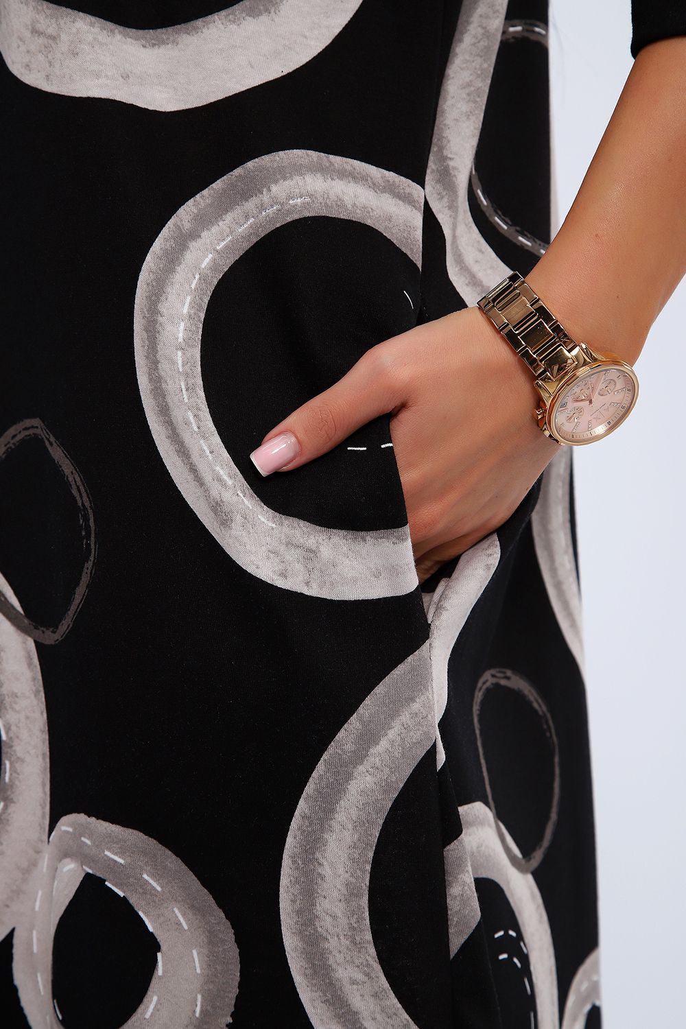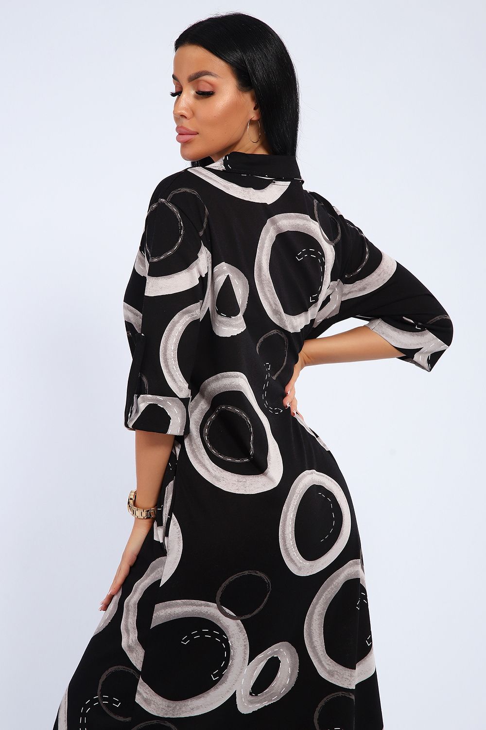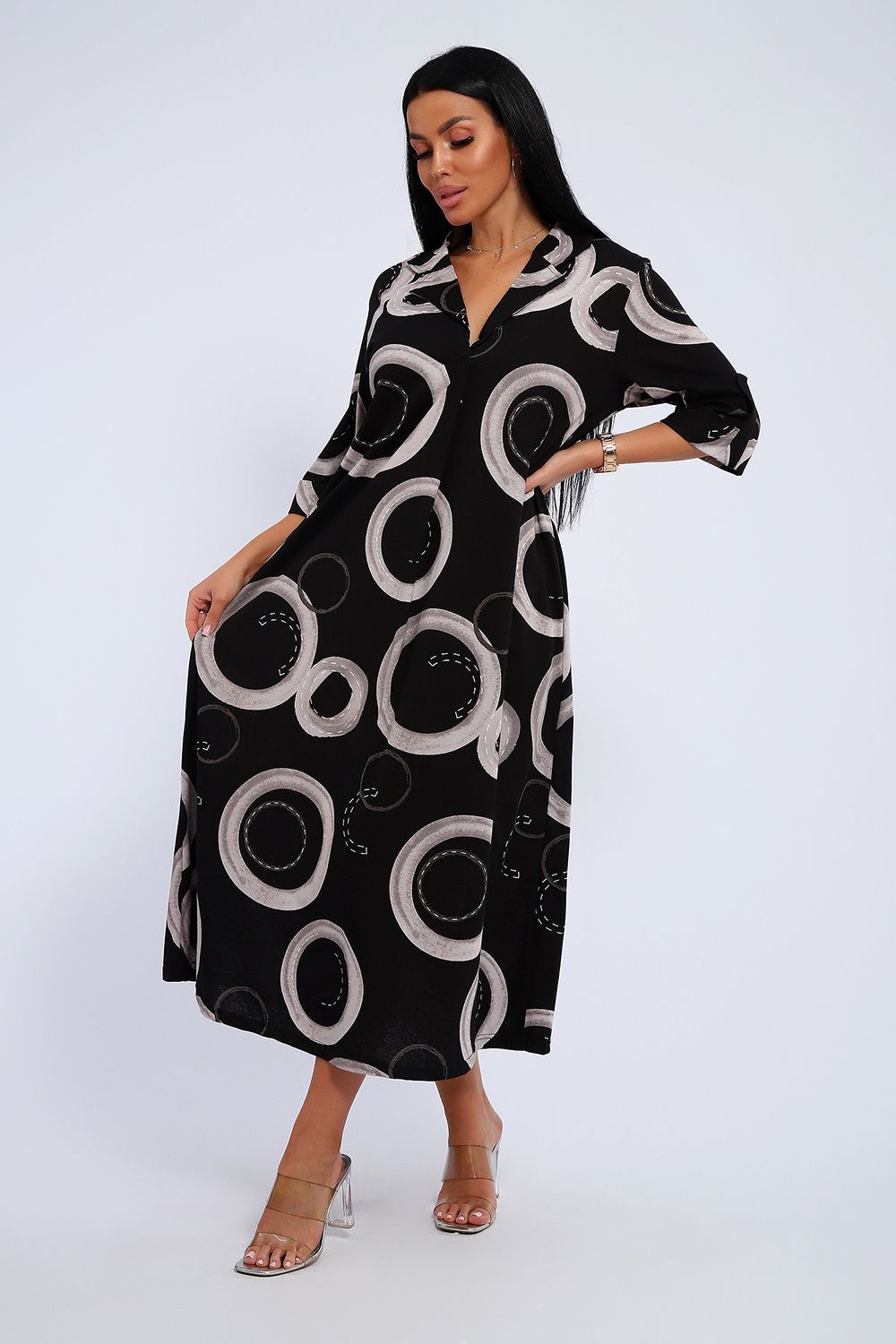 Платье женское свободного покроя. Воротник отложной рубашечного типа, образует V-образный вырез. Платье с карманами в боковых швах. Длина платья чуть выше щиколотки. Рукав 3/4 с манжетой, поднят патой.