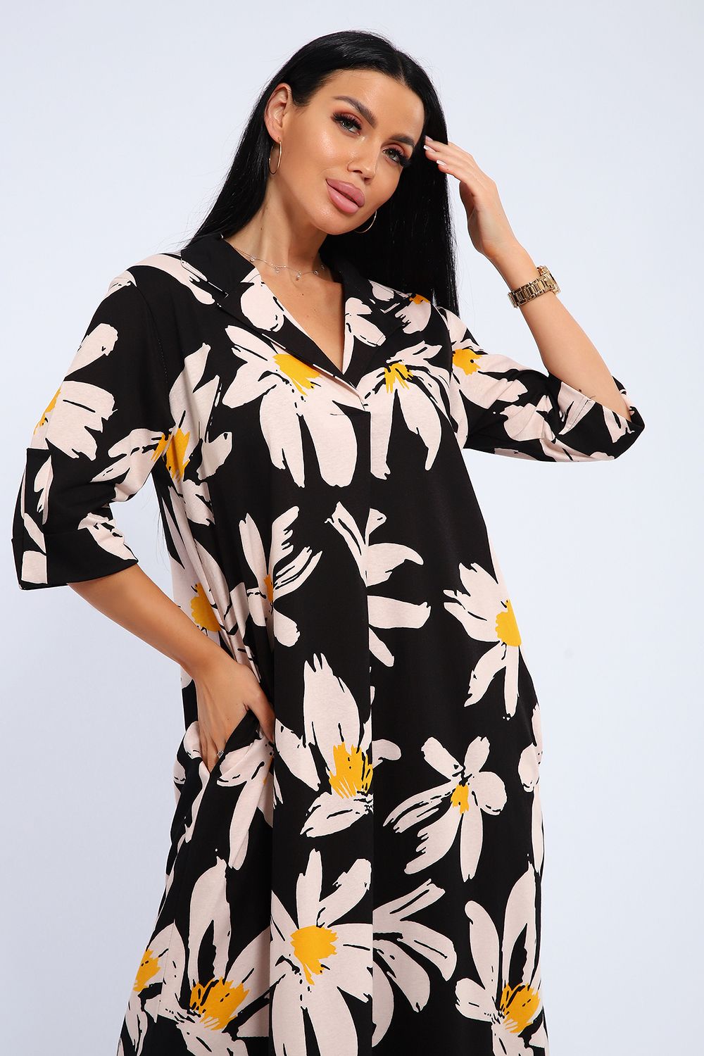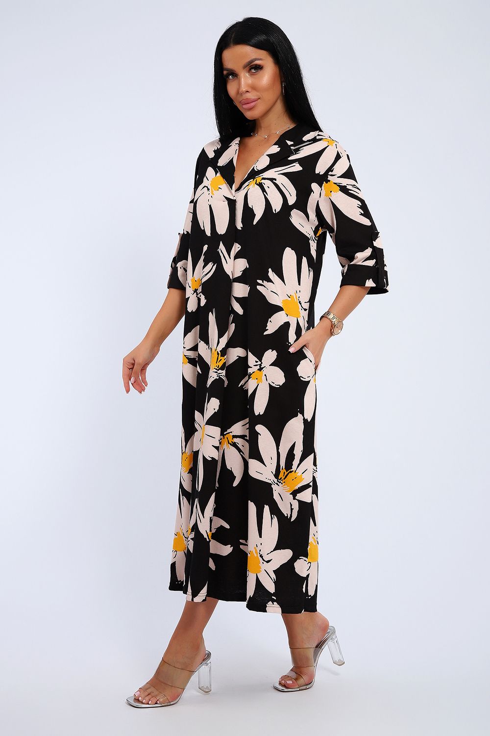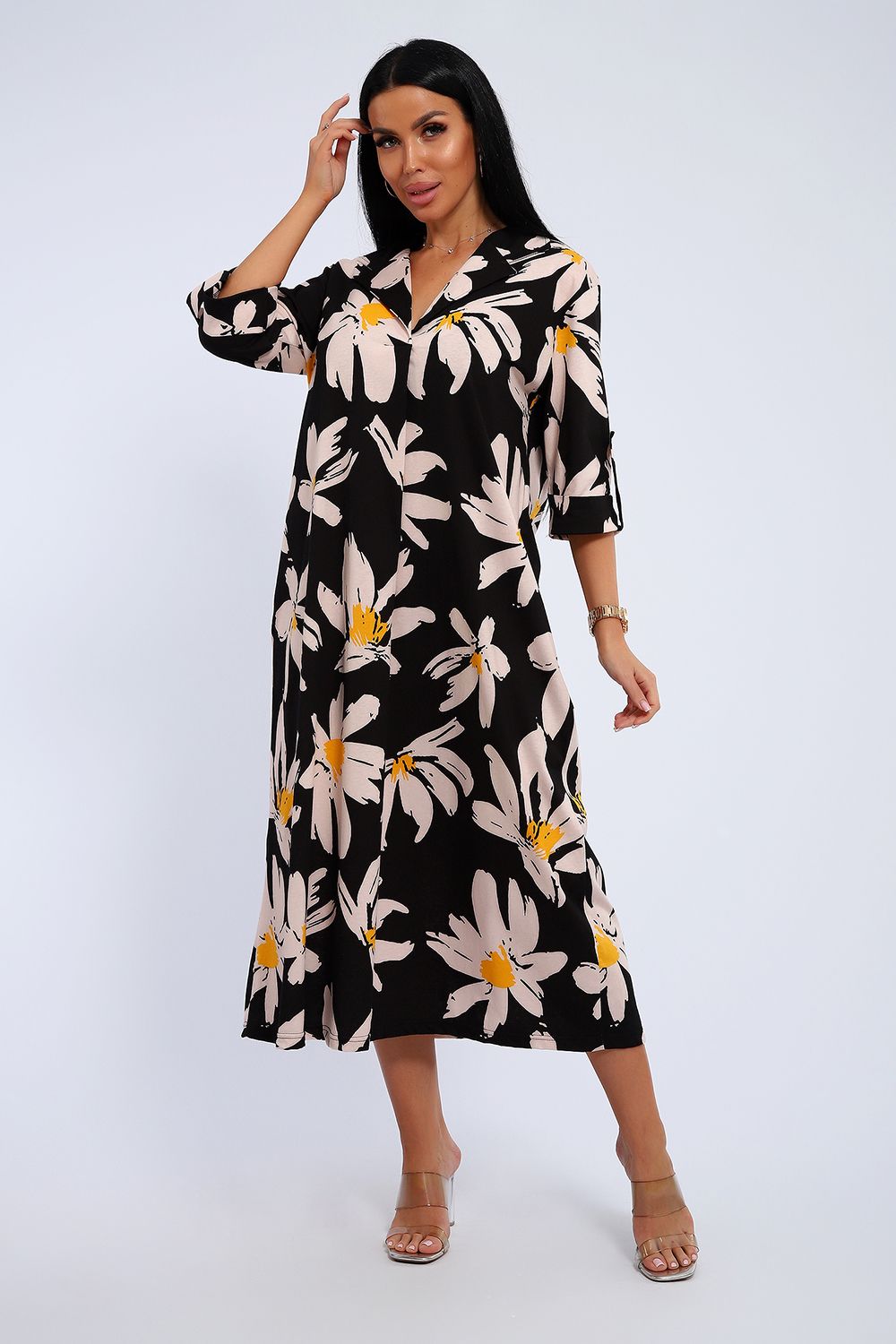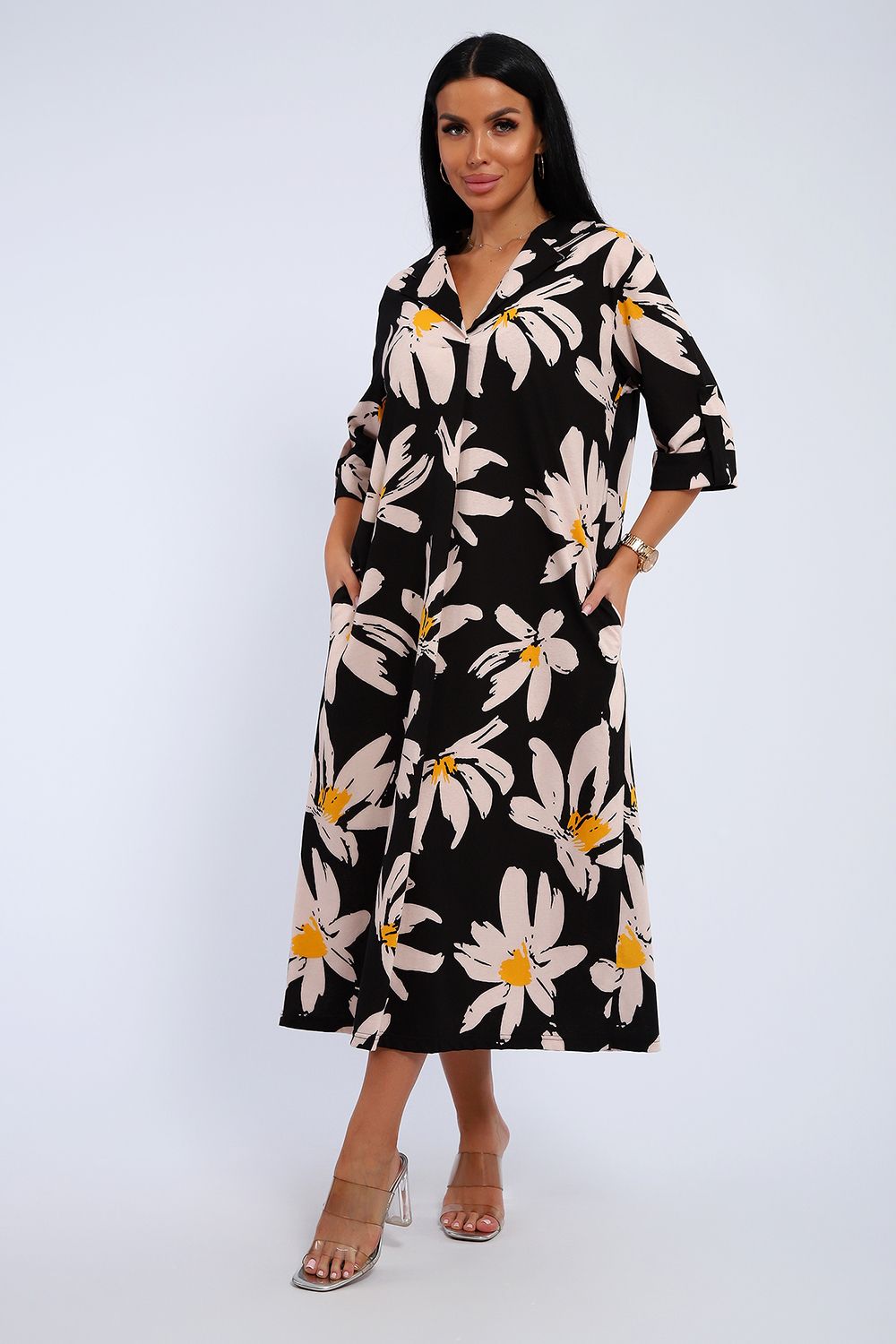Платье женское свободного покроя. Воротник отложной рубашечного типа, образует V-образный вырез. Платье с карманами в боковых швах. Длина платья чуть выше щиколотки. Рукав 3/4 с манжетой, поднят патой.