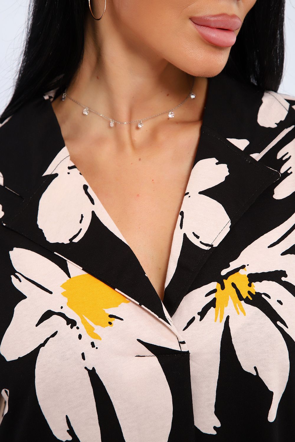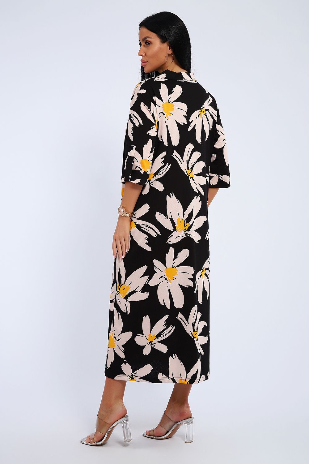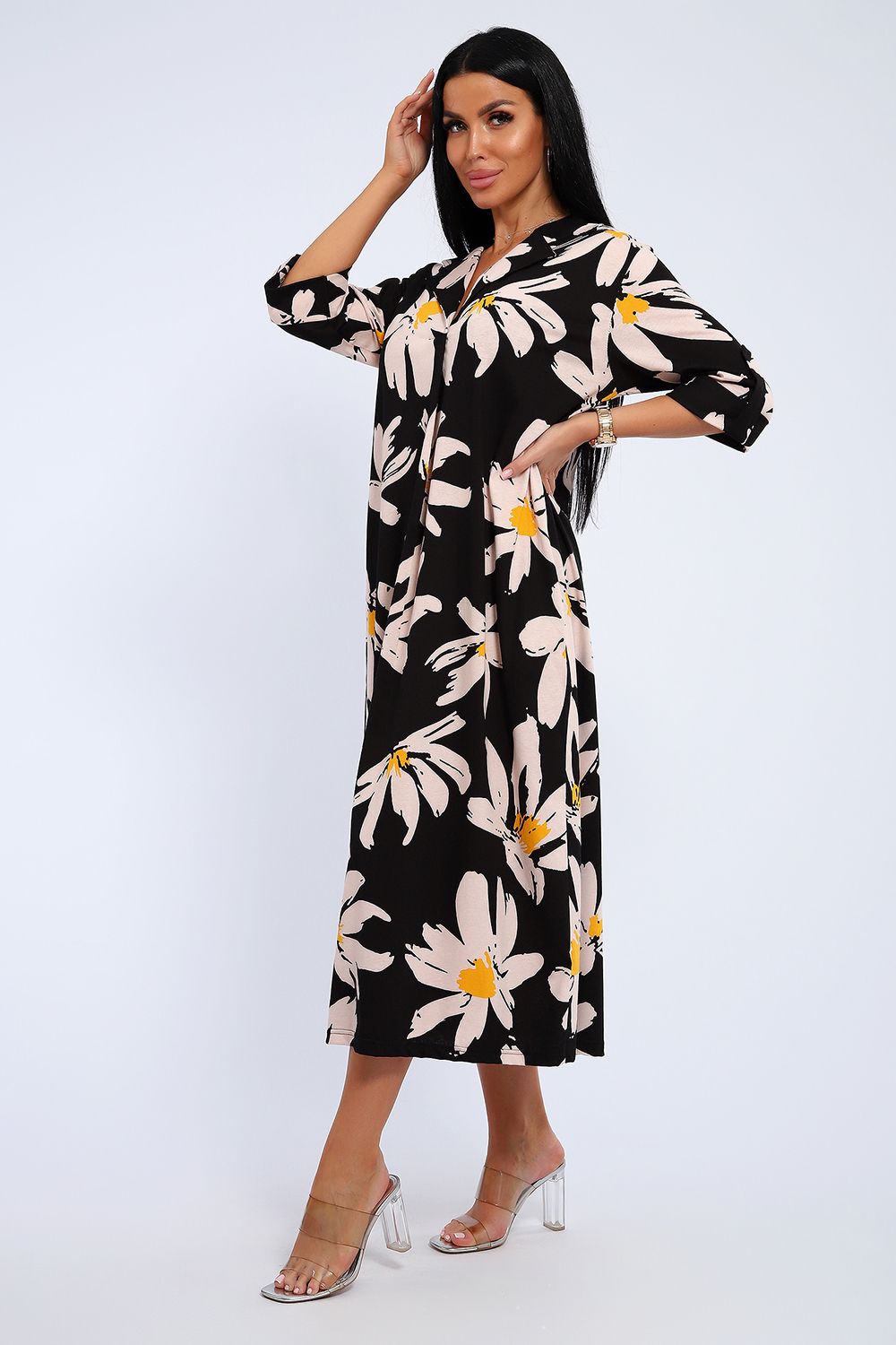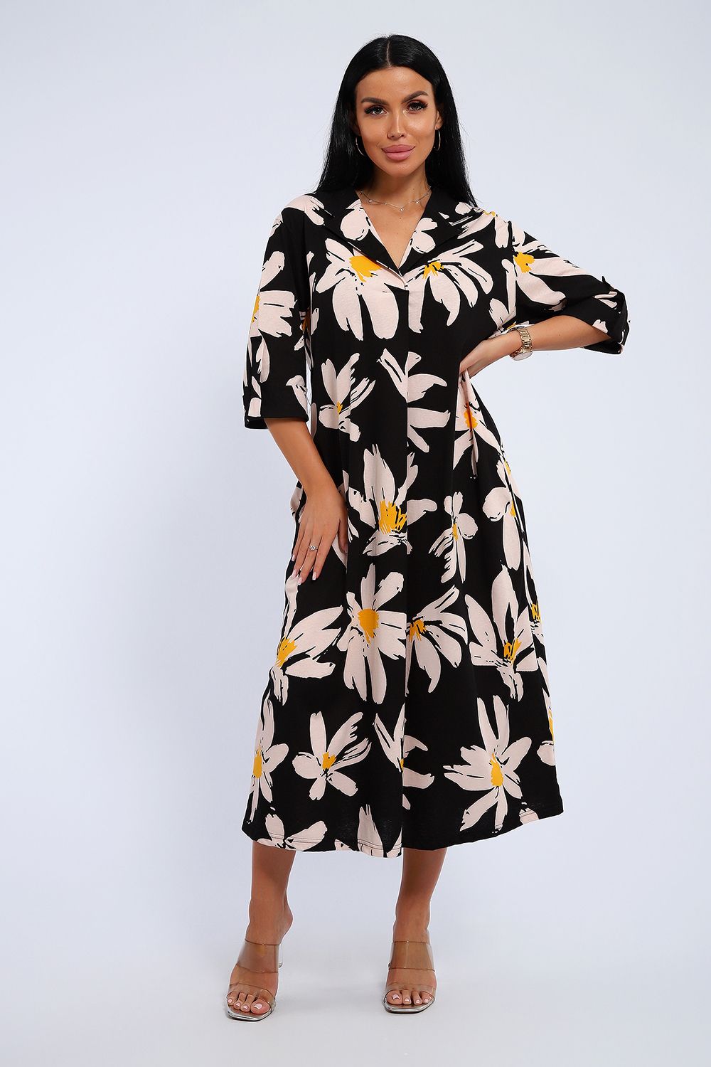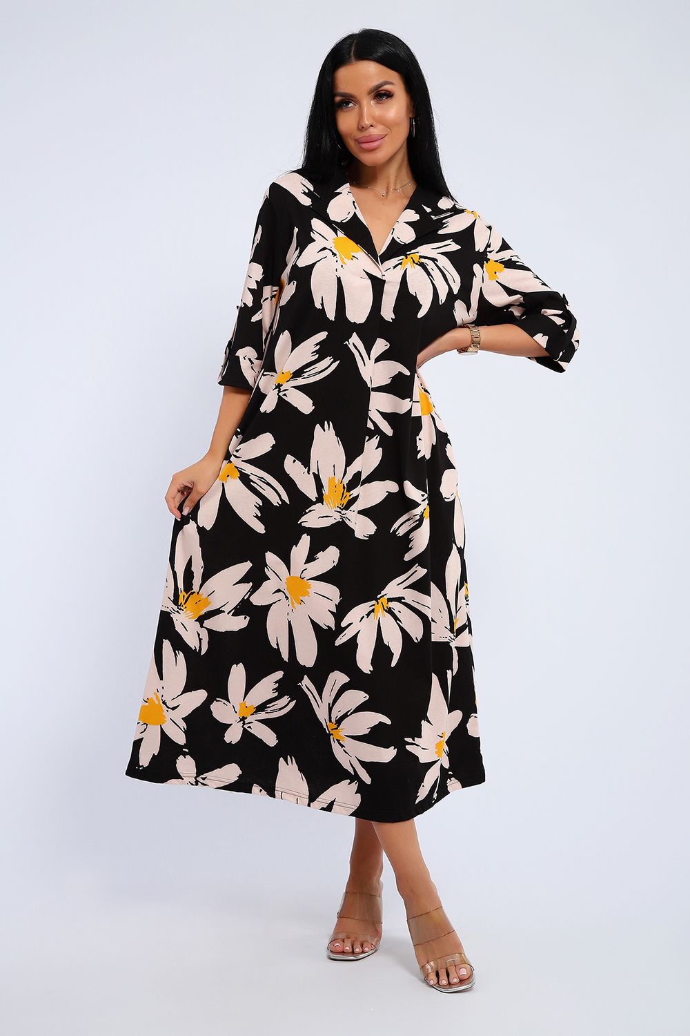 Платье женское свободного покроя. Воротник отложной рубашечного типа, образует V-образный вырез. Платье с карманами в боковых швах. Длина платья чуть выше щиколотки. Рукав 3/4 с манжетой, поднят патой.