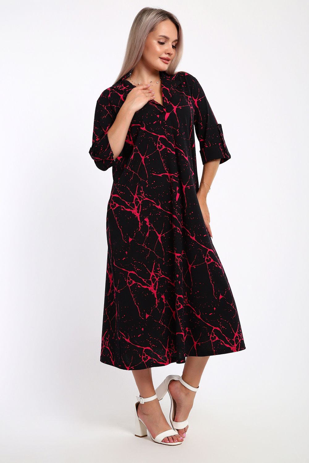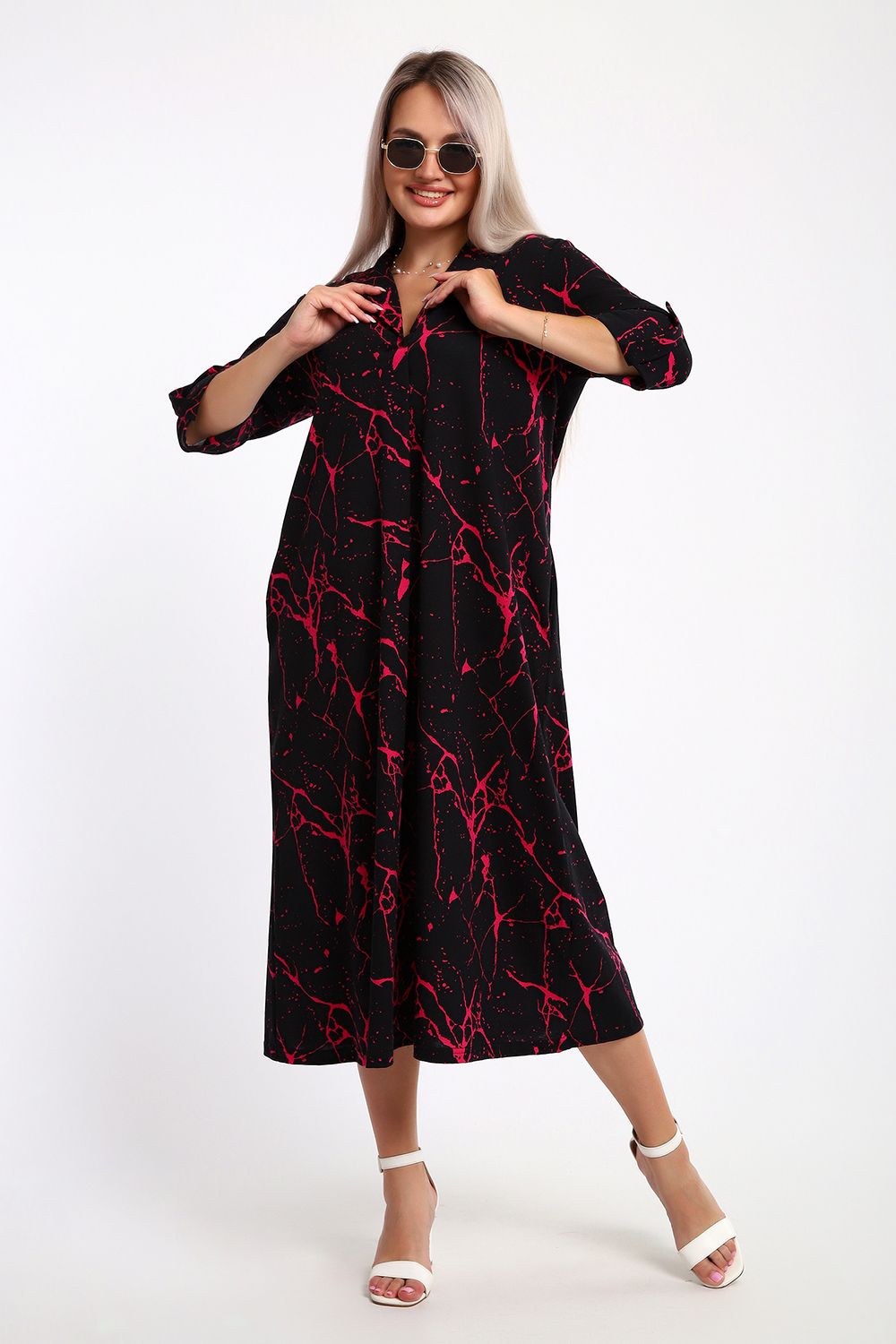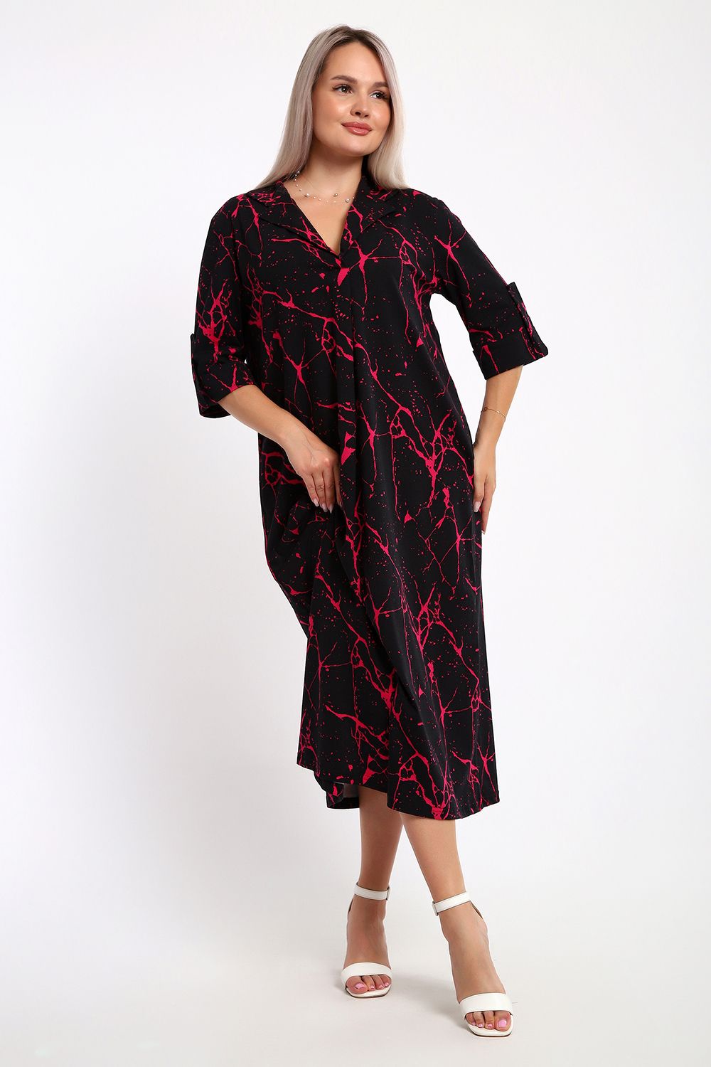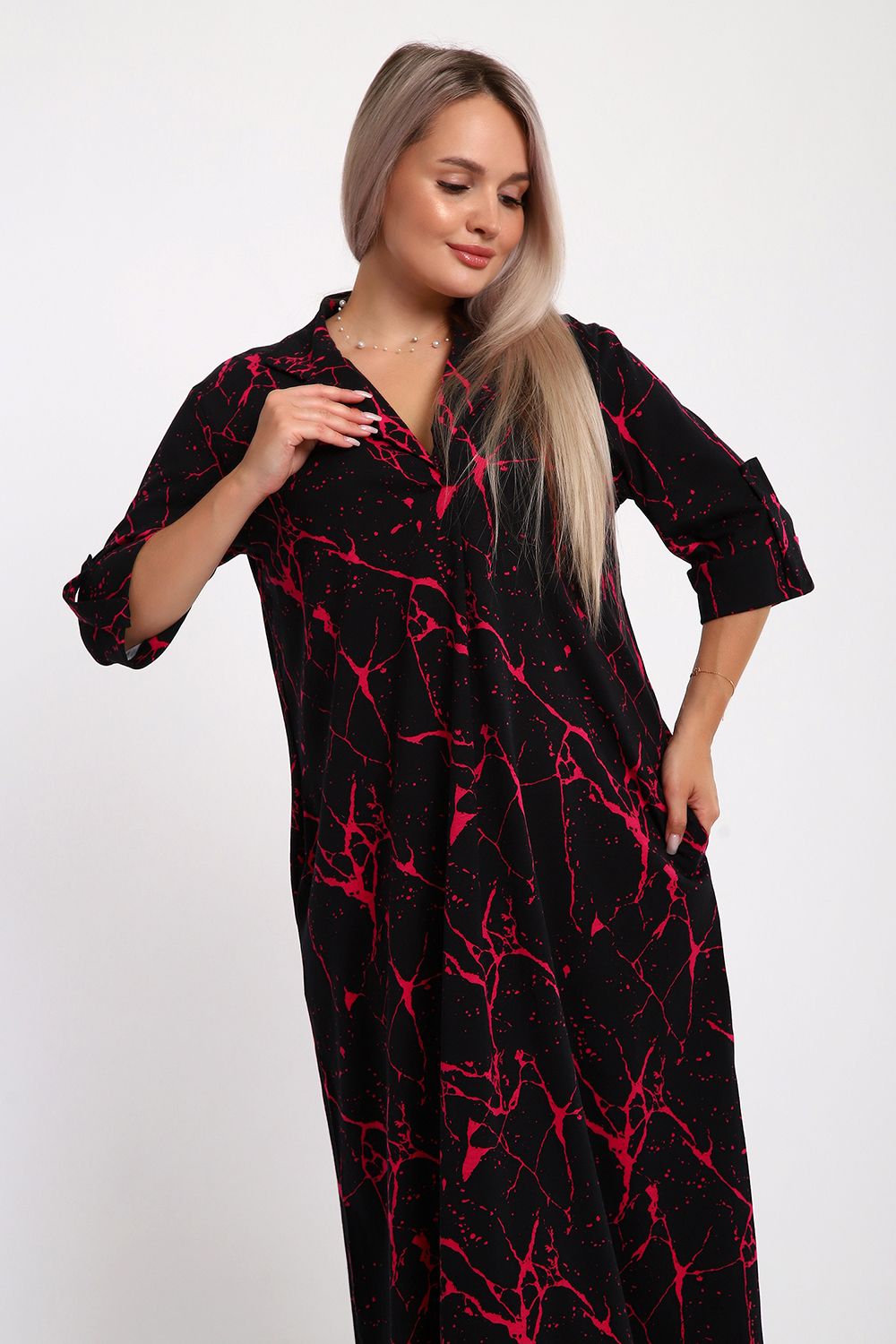 Платье женское свободного покроя. Воротник отложной рубашечного типа, образует V-образный вырез. Платье с карманами в боковых швах. Длина платья чуть выше щиколотки. Рукав 3/4 с манжетой, поднят патой.