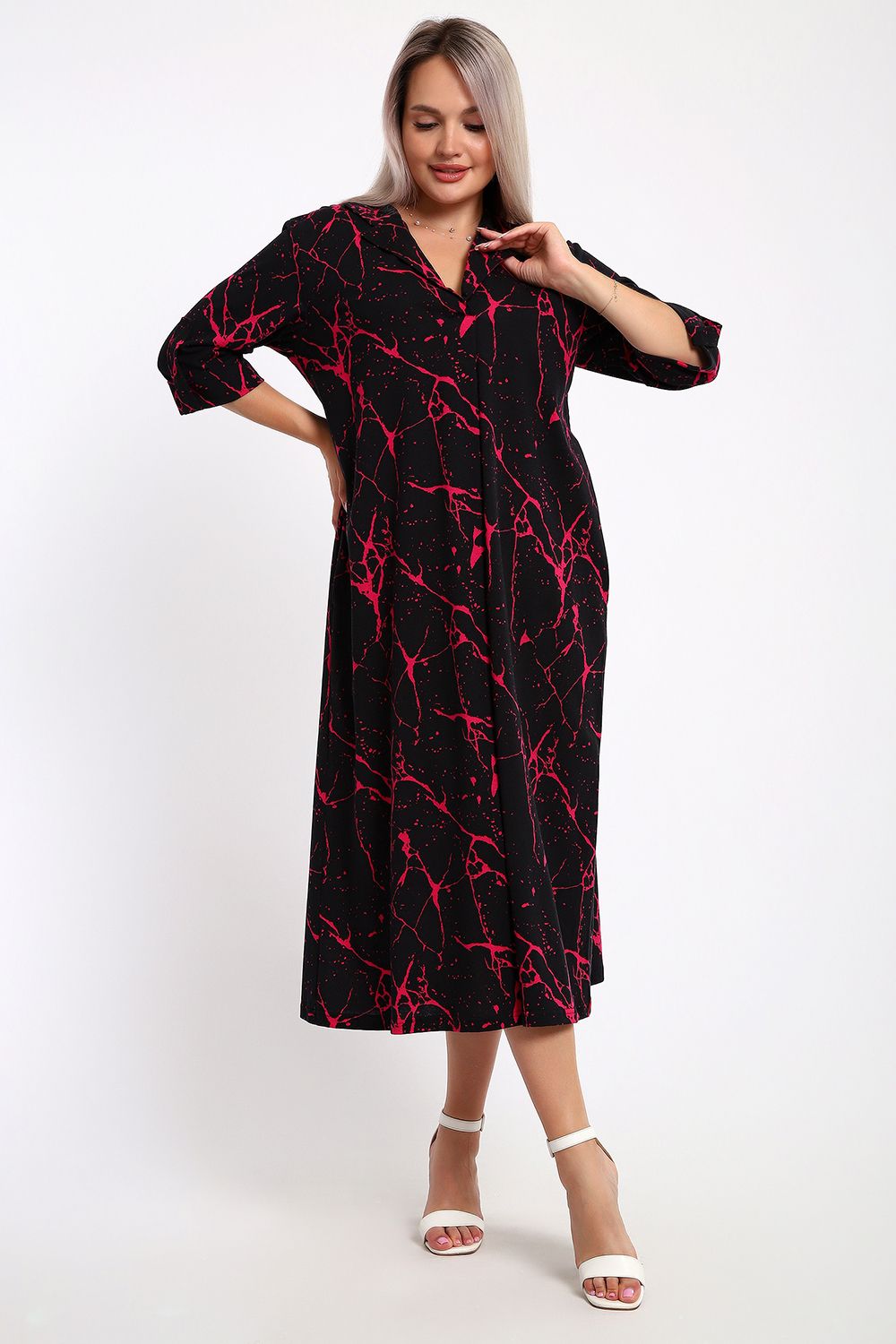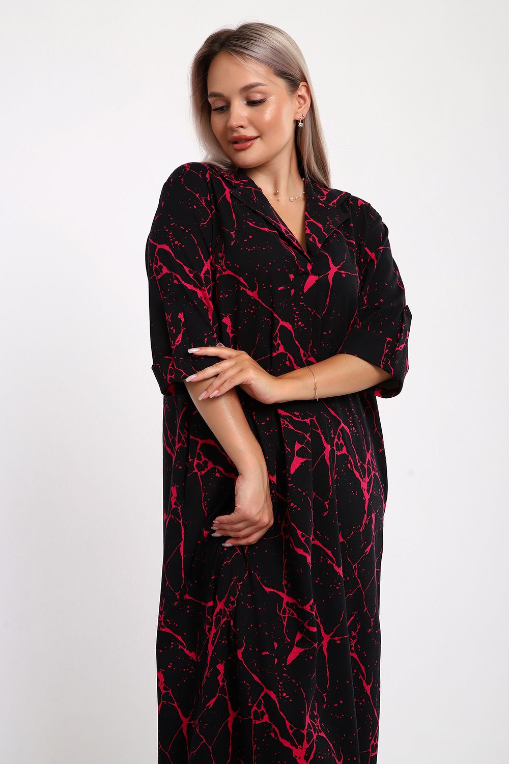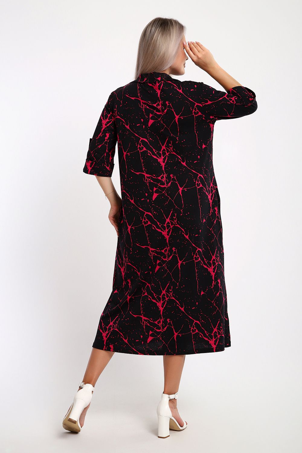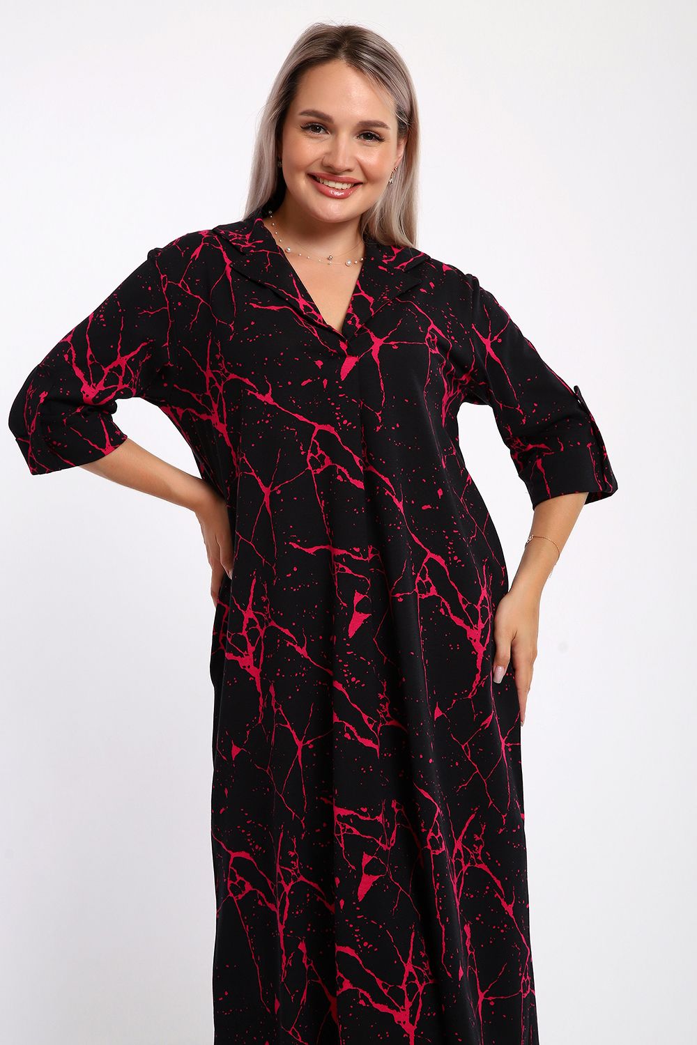 Платье женское свободного покроя. Воротник отложной рубашечного типа, образует V-образный вырез. Платье с карманами в боковых швах. Длина платья чуть выше щиколотки. Рукав 3/4 с манжетой, поднят патой.