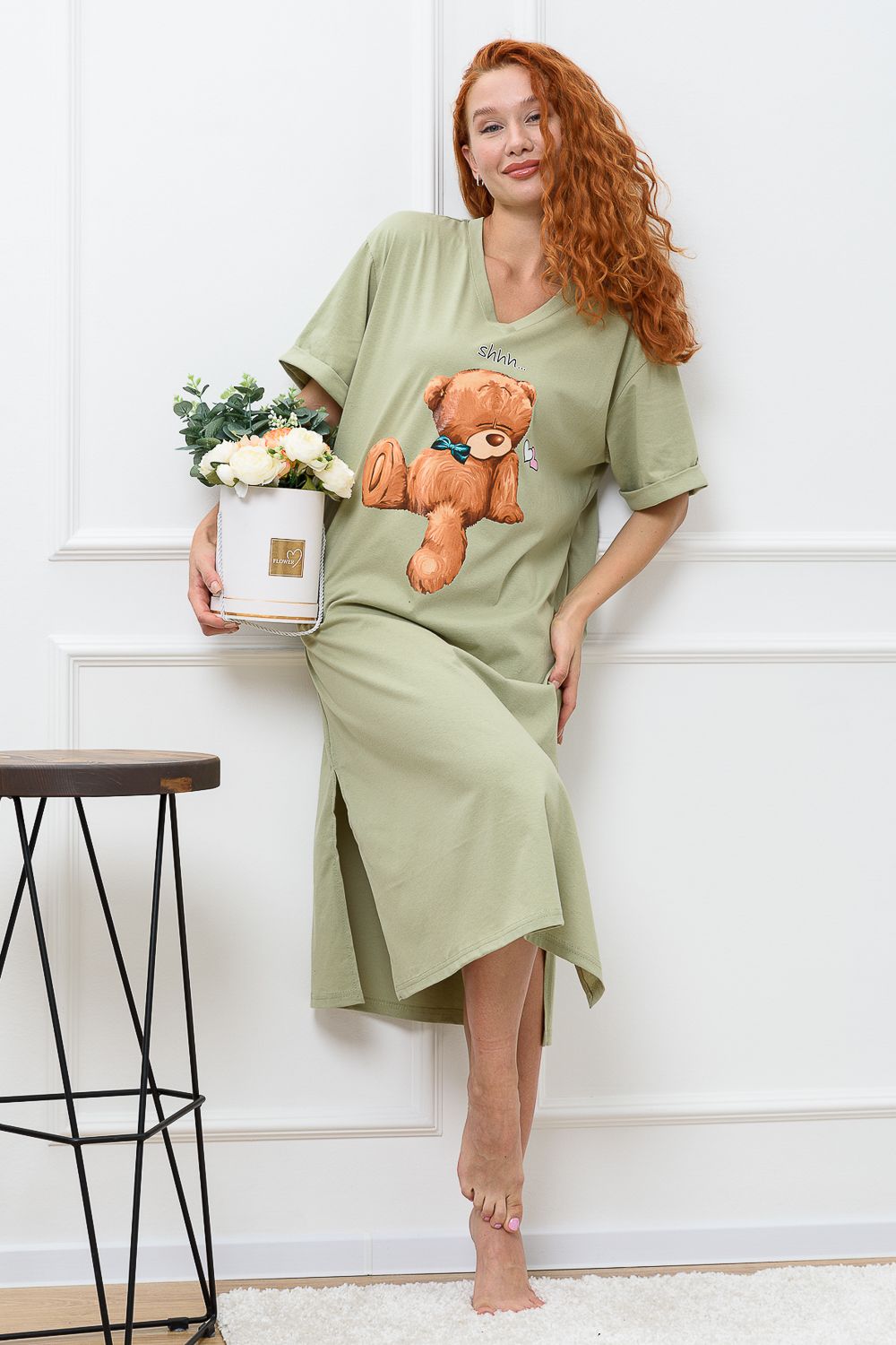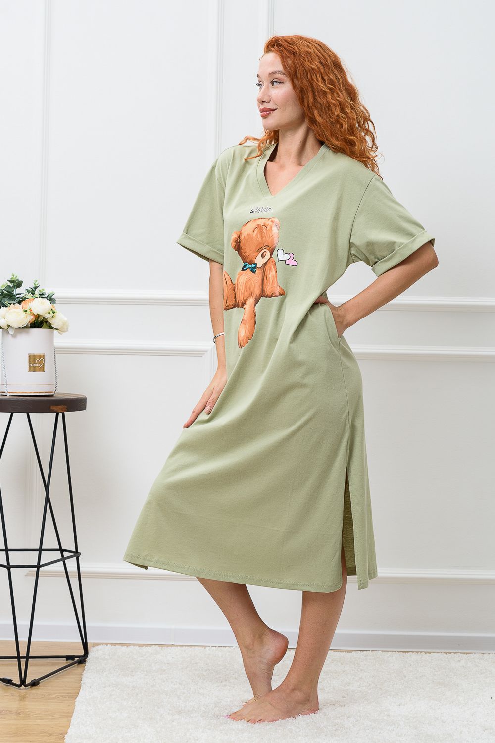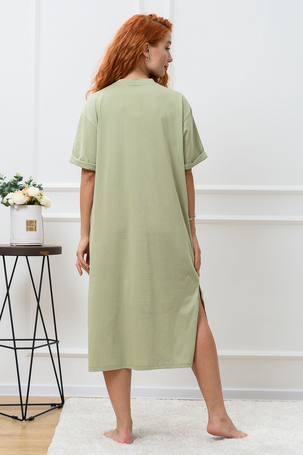 Платье в стиле "оверсайз". Прямое, свободное, с боковыми карманами, длиной до середины икры, с V-образной горловиной. Рукав короткий, с манжетом. В нижней части боковых швов обработаны разрезы. Горловина обработана обтачкой из основного полотна.