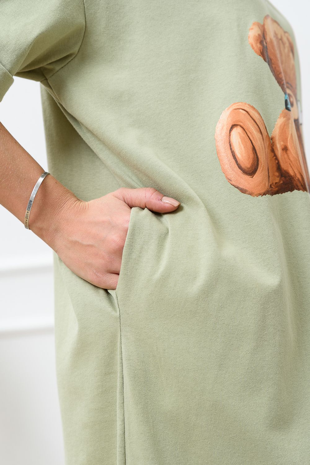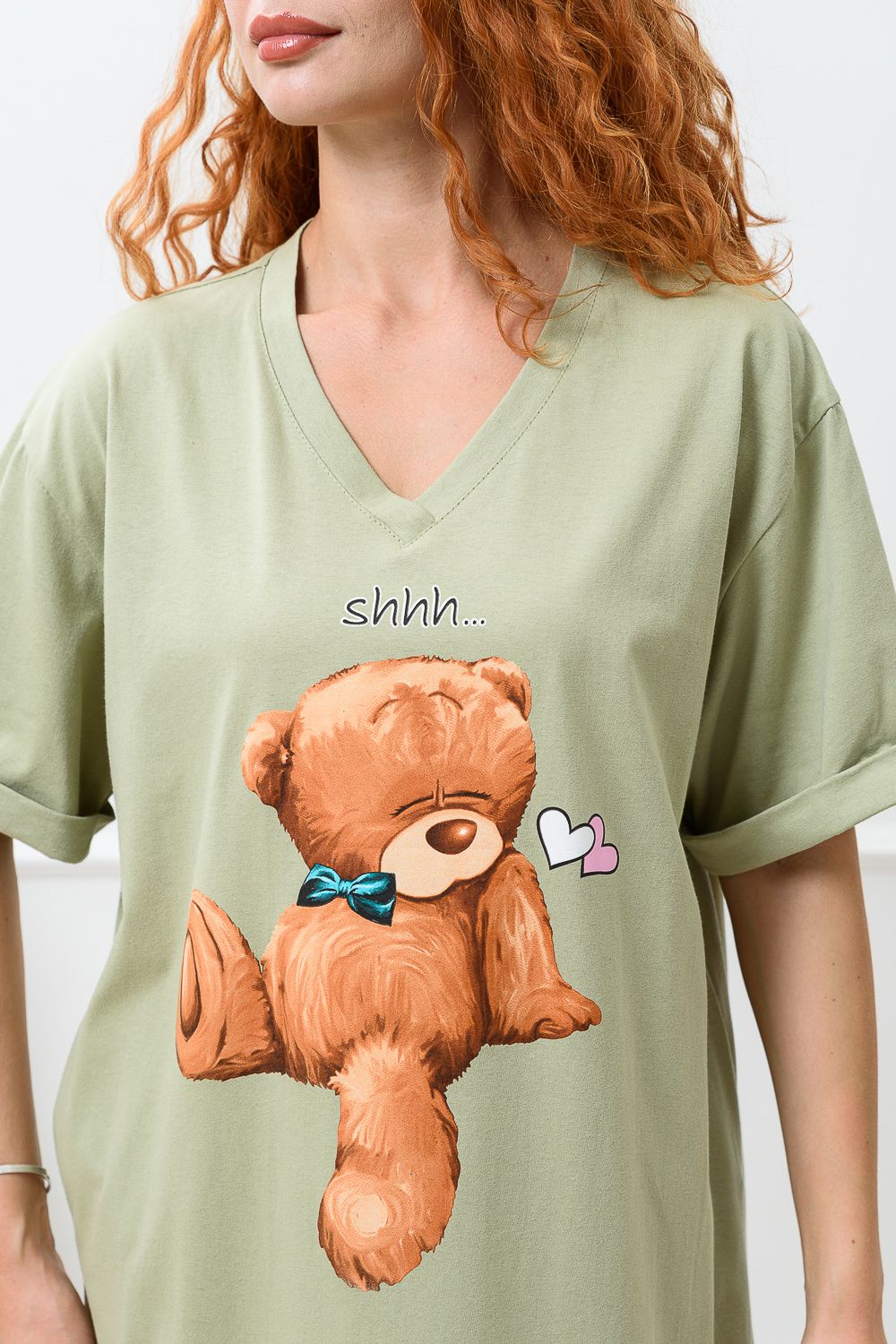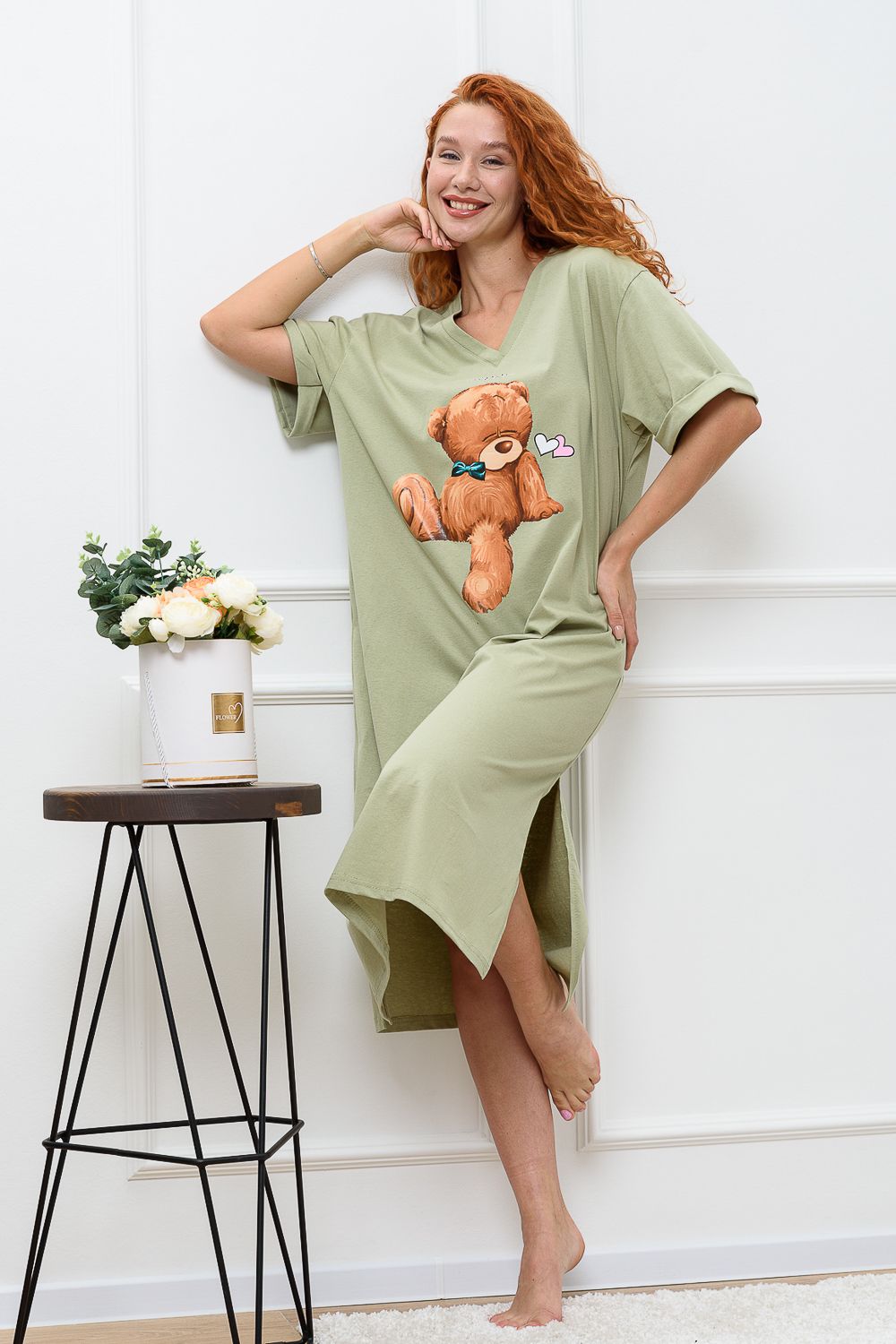 Платье в стиле "оверсайз". Прямое, свободное, с боковыми карманами, длиной до середины икры, с V-образной горловиной. Рукав короткий, с манжетом. В нижней части боковых швов обработаны разрезы. Горловина обработана обтачкой из основного полотна.