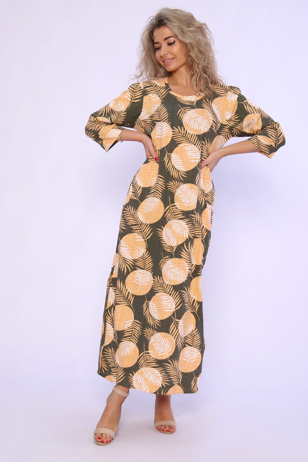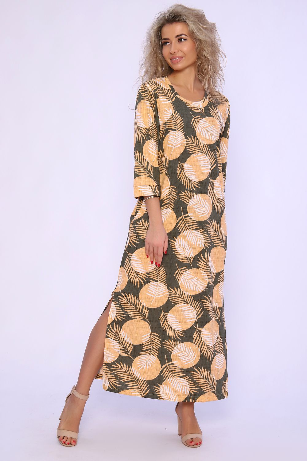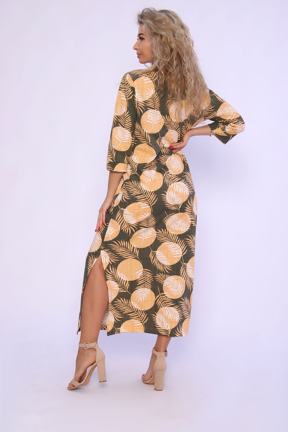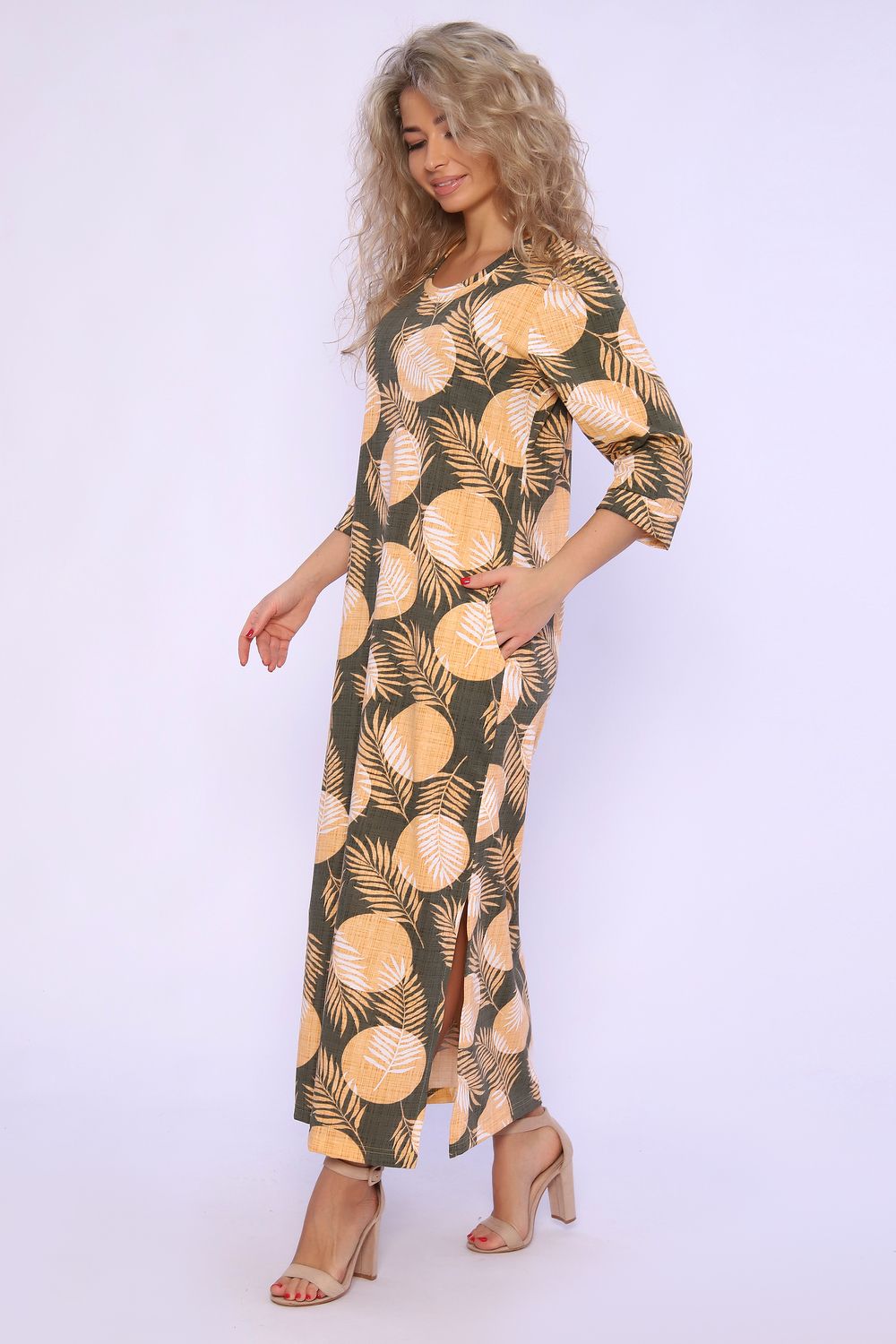 Длинное платье полуприлегающего силуэта с рукавами длиной 3/4 на манжетах и со сборкой. В боковых швах два длинных разреза и удобные карманы.