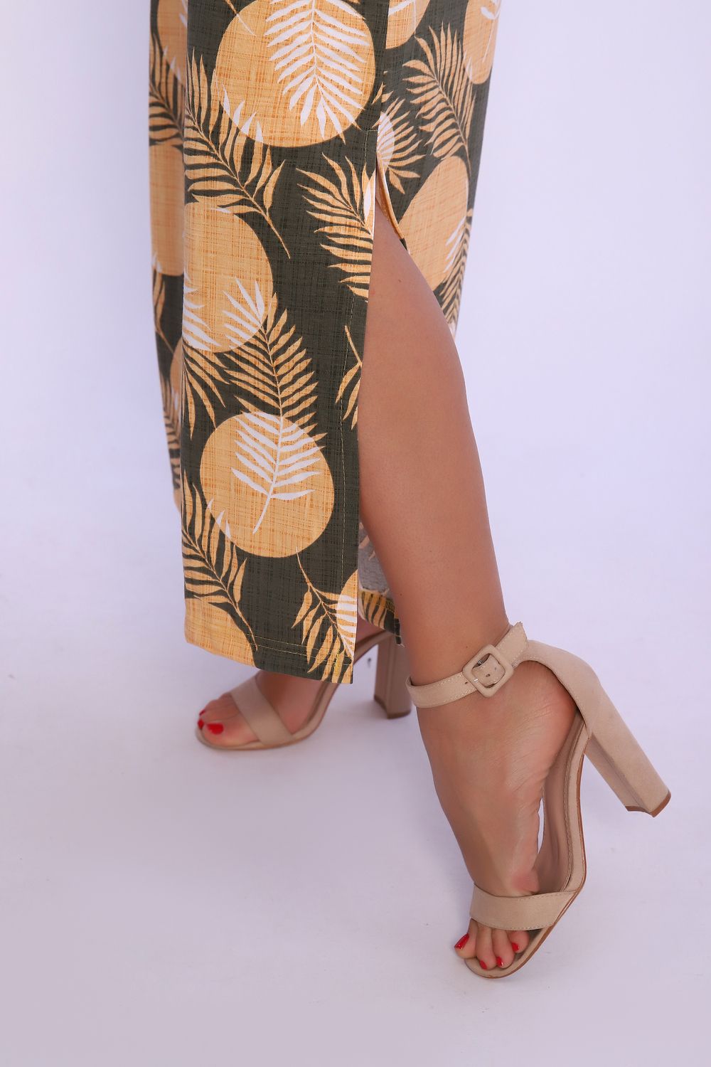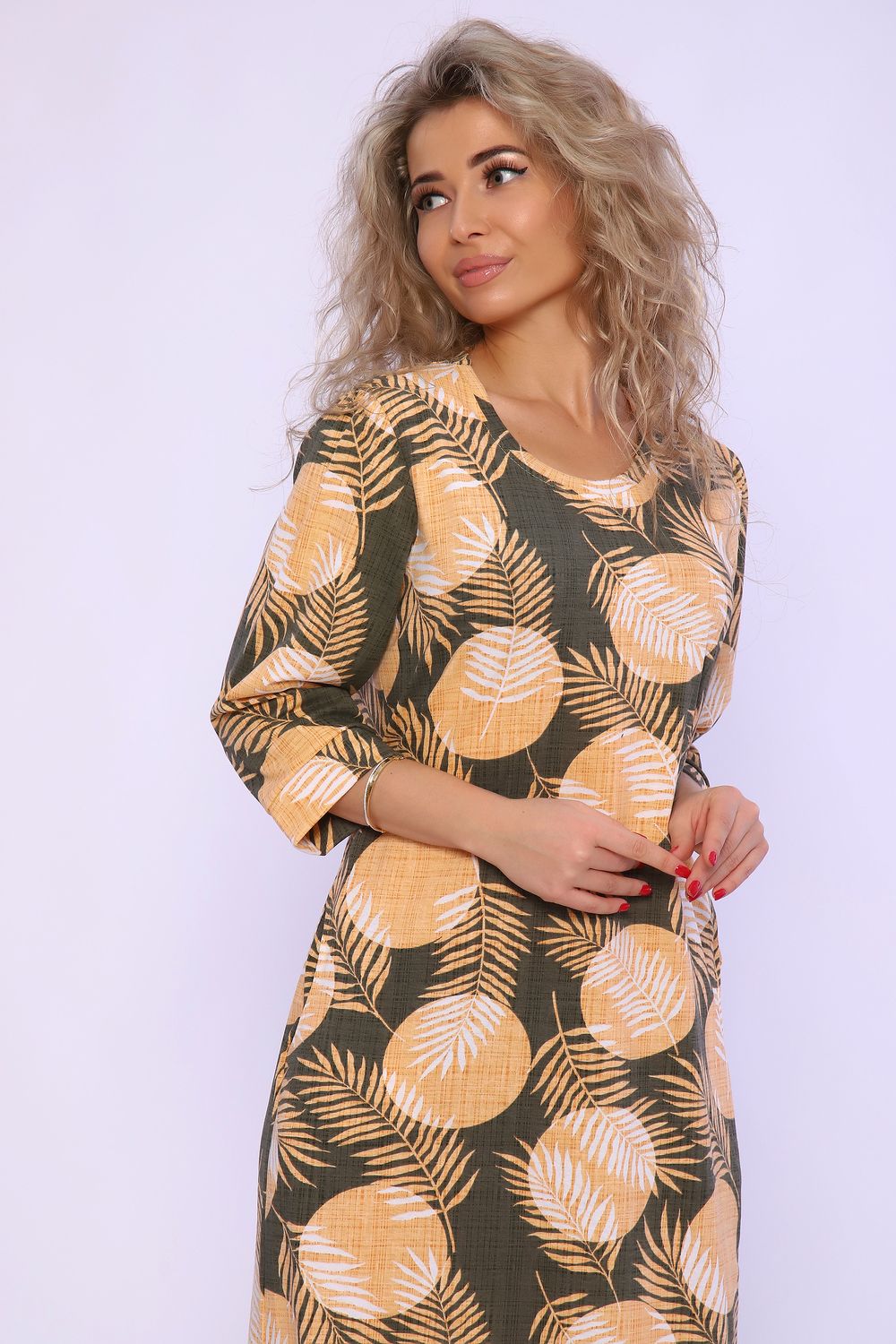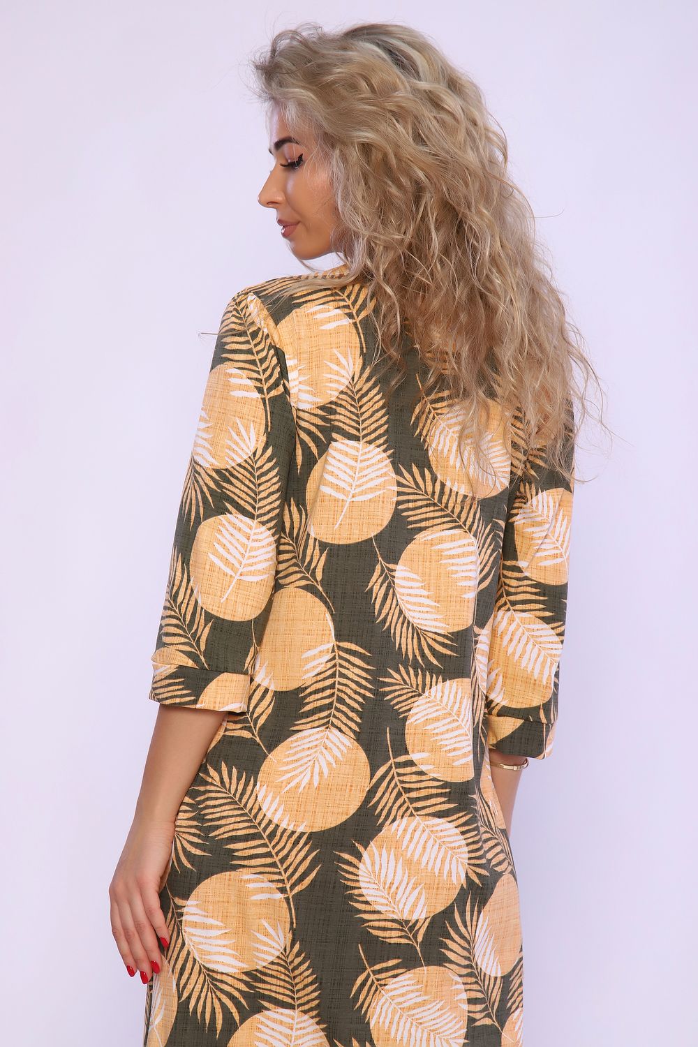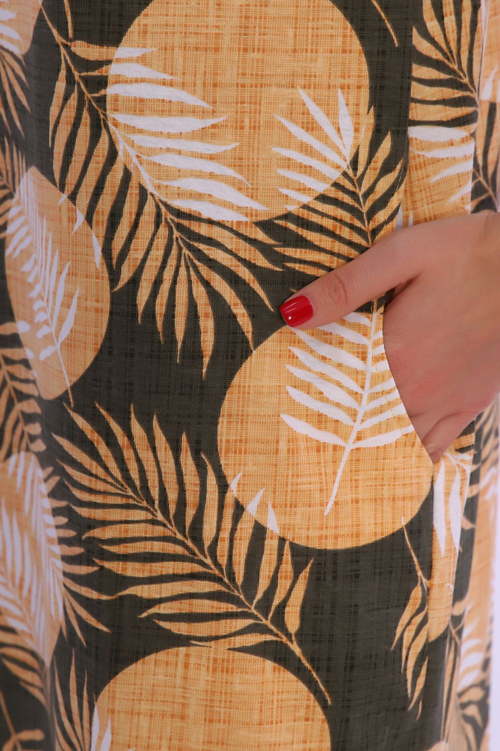 Длинное платье полуприлегающего силуэта с рукавами длиной 3/4 на манжетах и со сборкой. В боковых швах два длинных разреза и удобные карманы.
