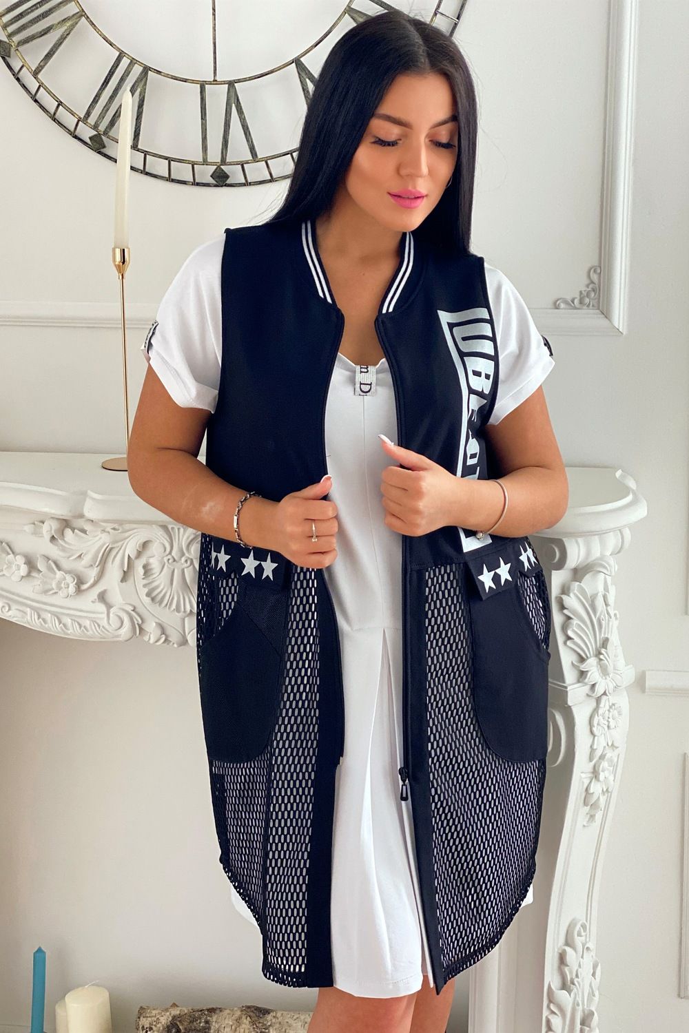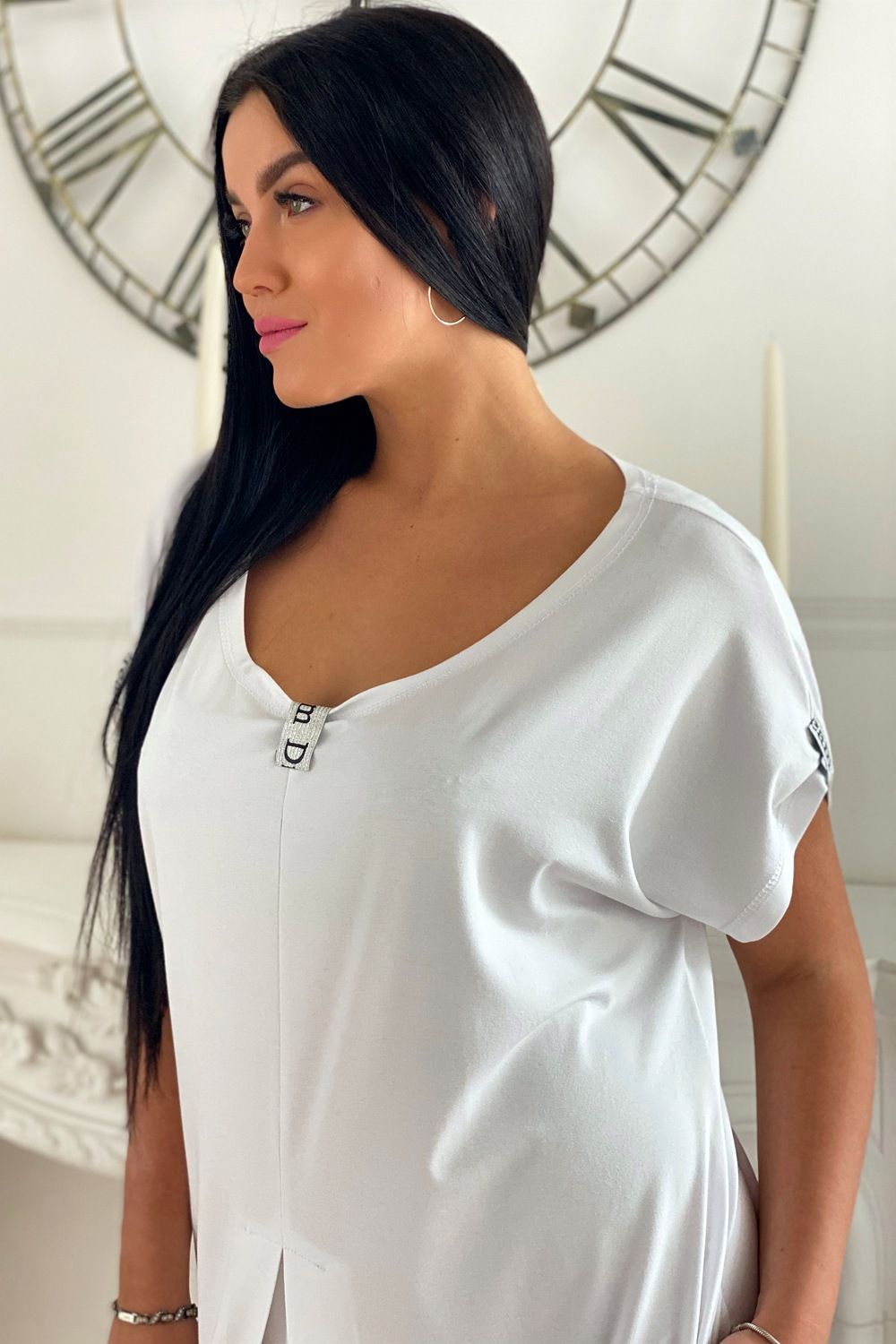 Платье женское прямого силуэта. Рукав цельнокроенный короткий. Середина горловины полочки и низ рукава слегка собран на декоративную серебряную тесьму. От линии талии по центру полочки встречная складка. В боковых швах изделия есть карманы.
