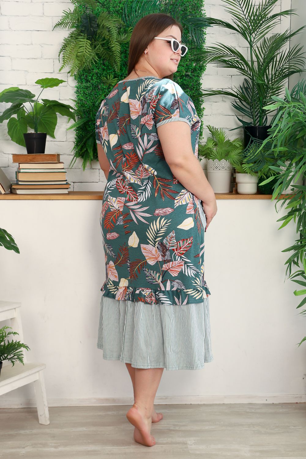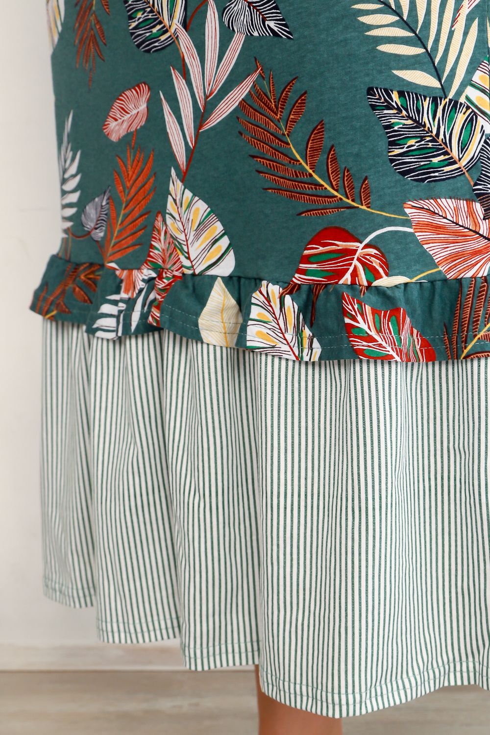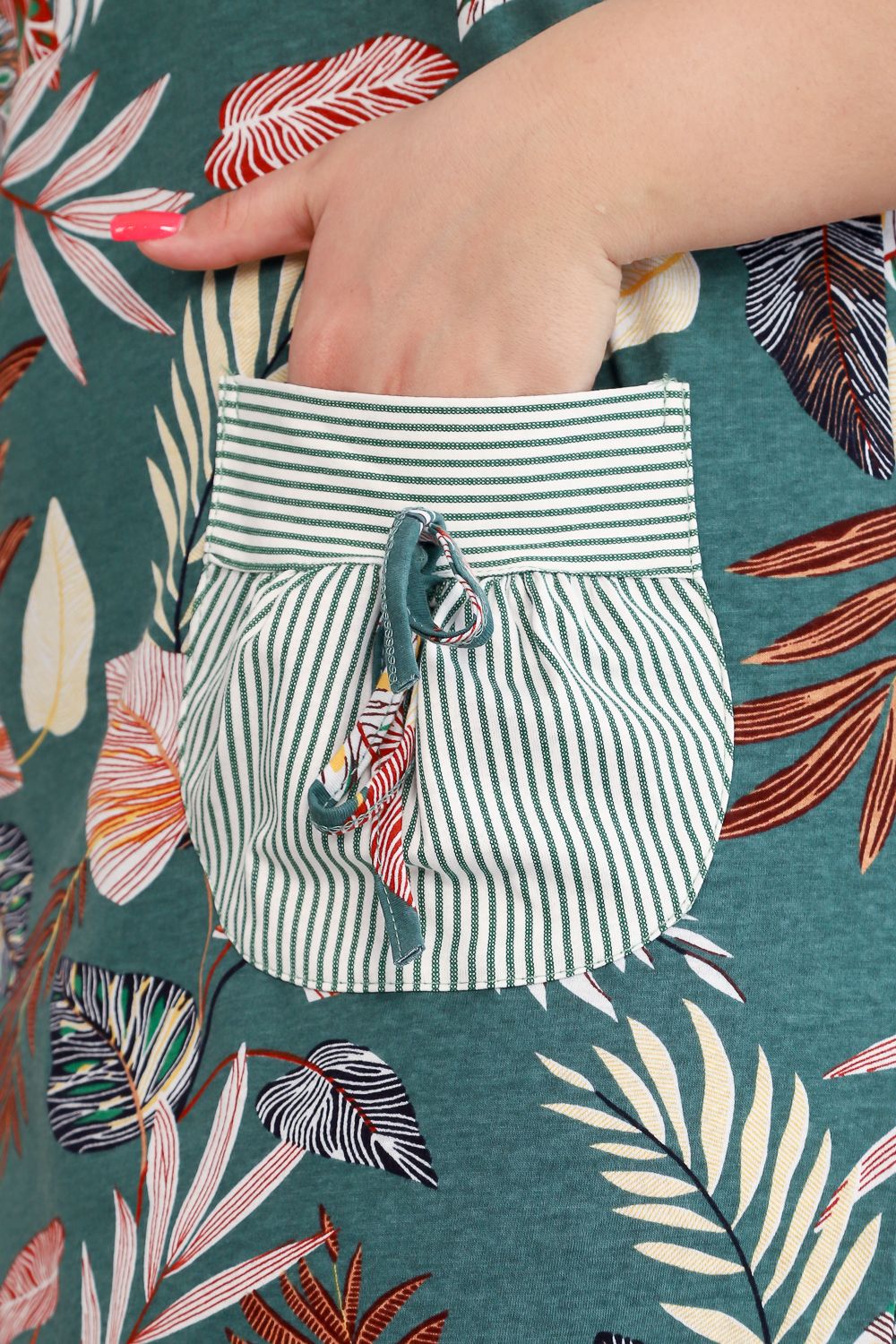 Платье женское слегка расширенное к низу. Вырез горловины круглый, рукав цельнокроенный, короткий. На полочке два накладных кармана из отделочной ткани в полоску. В шве притачивания обтачки кармана завязки из основной ткани. Внизу широкая рюша из ткани в полоску и маленькая из основной ткани, что придает платью особую женственность.