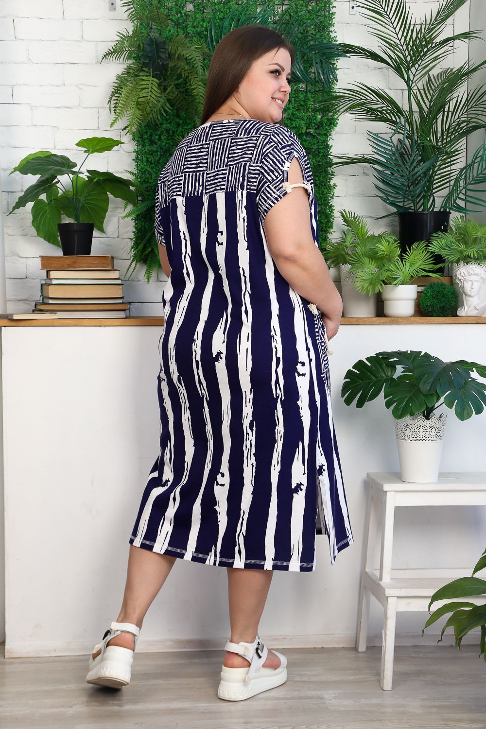 Платье женское полуприлегающего силуэта. Рукав цельнокроенный, спереди имитация реглана, сзади на спинке кокетка. На полочке накладные фигурные карманы, по боковым швам разрезы. Платье в морском стиле, этот образ подчеркнут благодаря использованию х/б шнура в кармане и рукаве, а также ткани в полоску с замечательным компаньоном клетка. На модели 52 размер. На фото платье из той же коллекции 9121