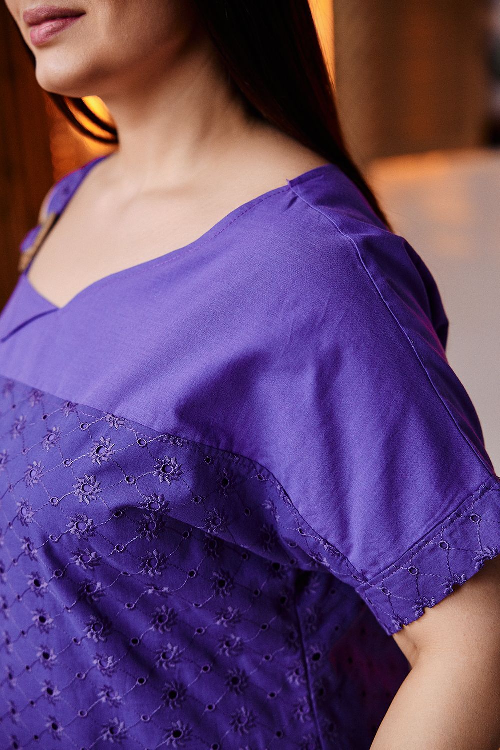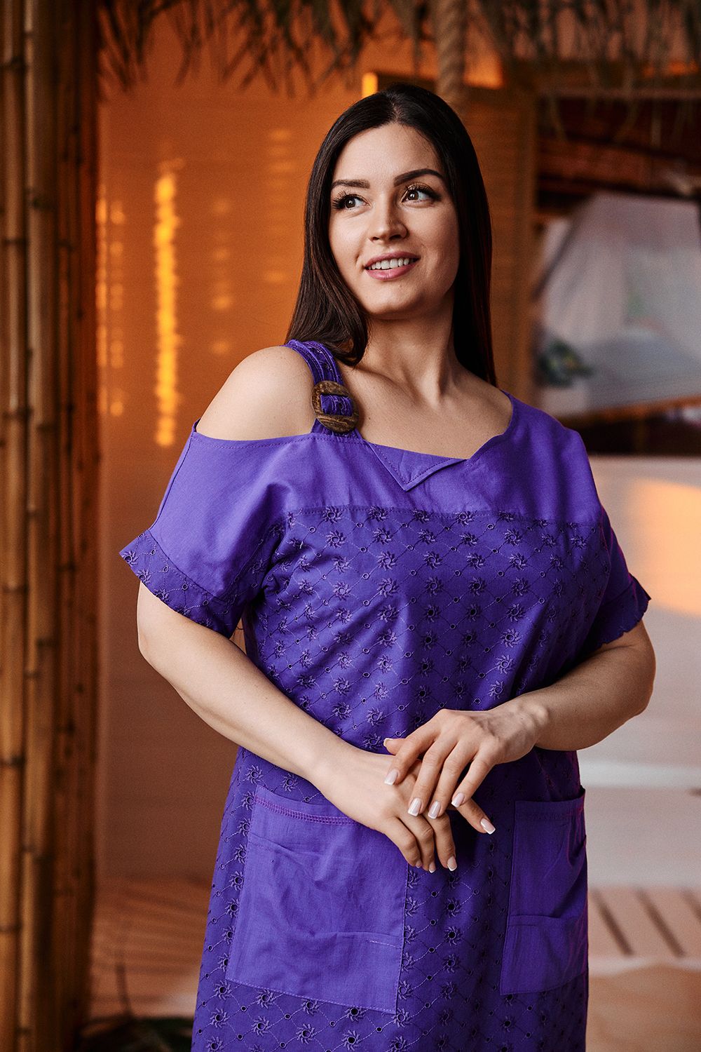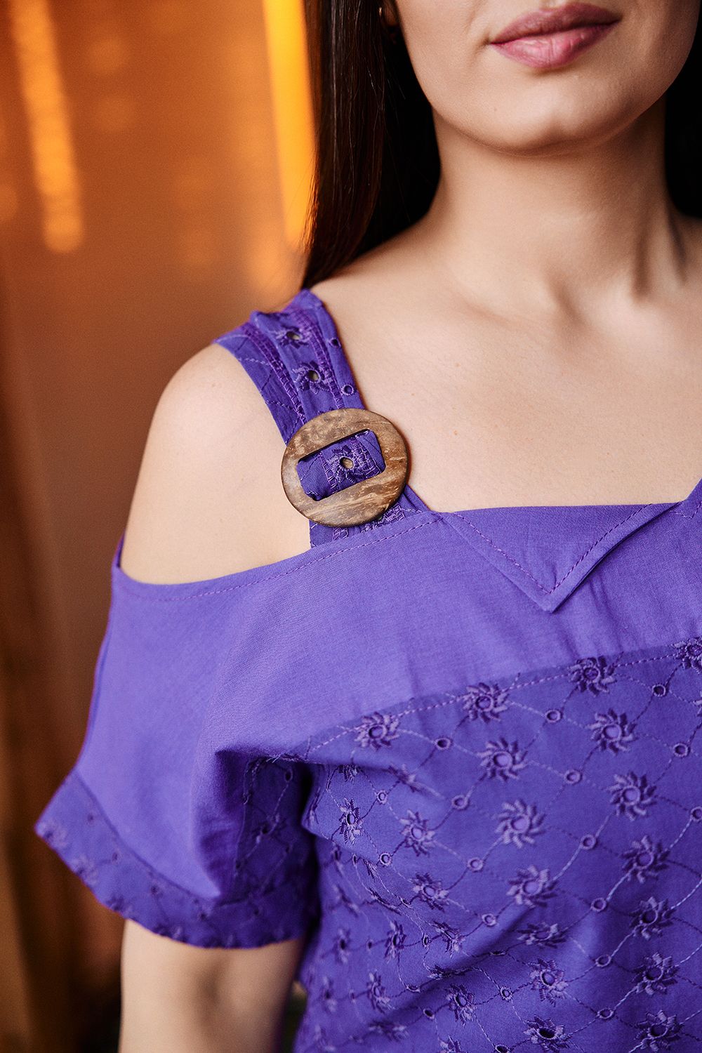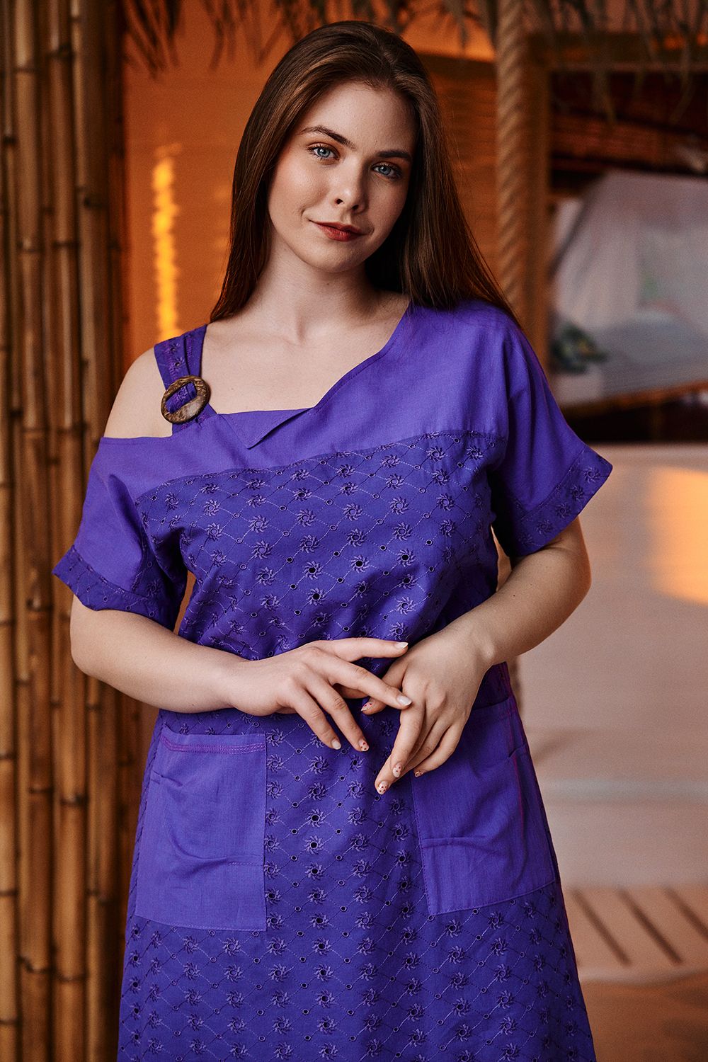 Платье женское полуприлегающего силуэта, на подкладке. Вырез асимметричный, с одной стороны бретель с кокосовой пуговицей. На полочке и спинке кокетка из отделочной ткани. Рукав цельнокроеный до локтя на манжете. На полочке накладные карманы со складками. В боковых швах разрезы.