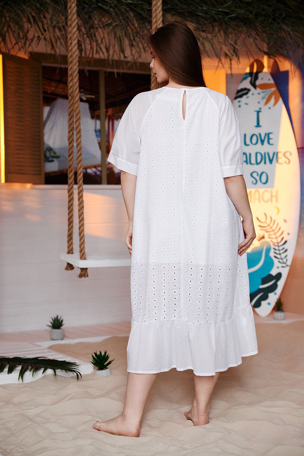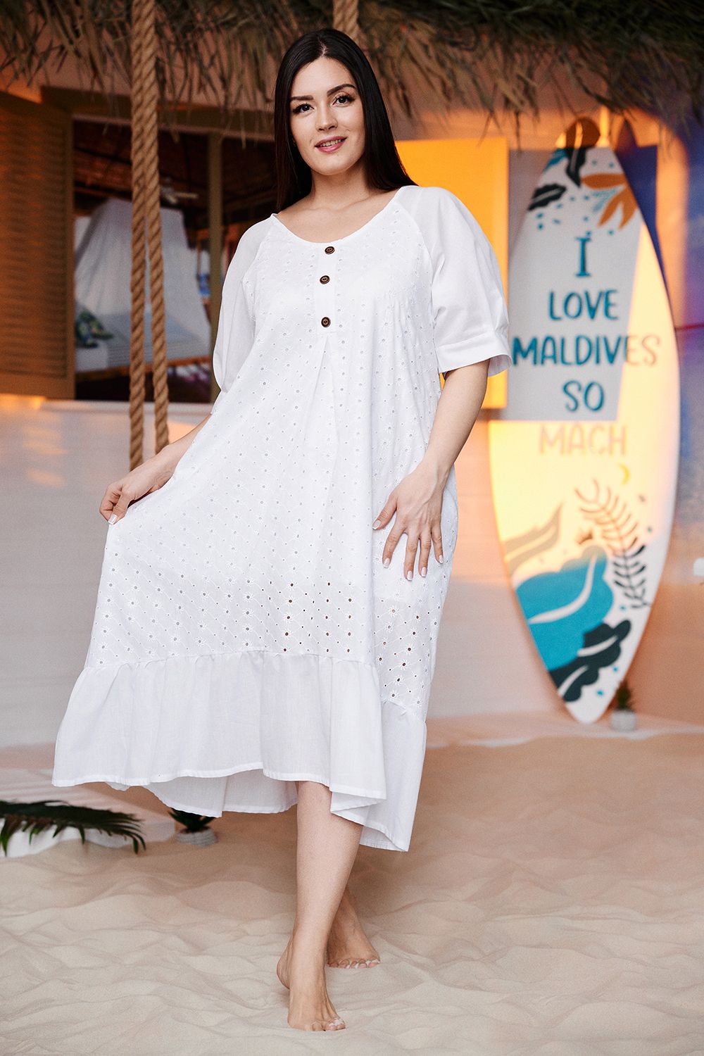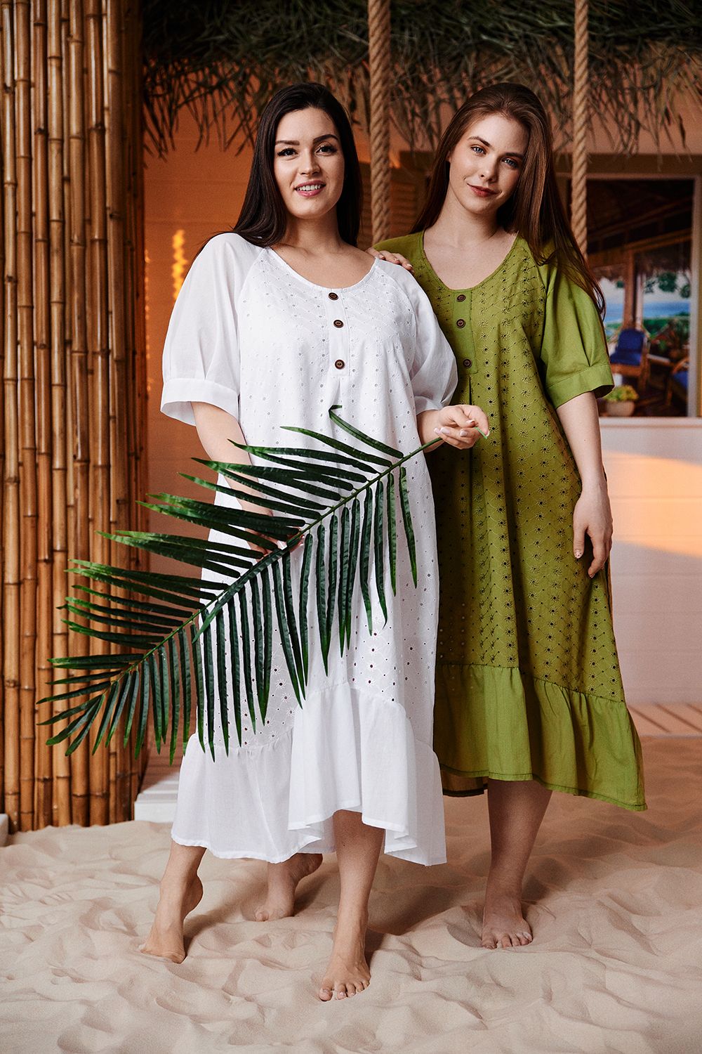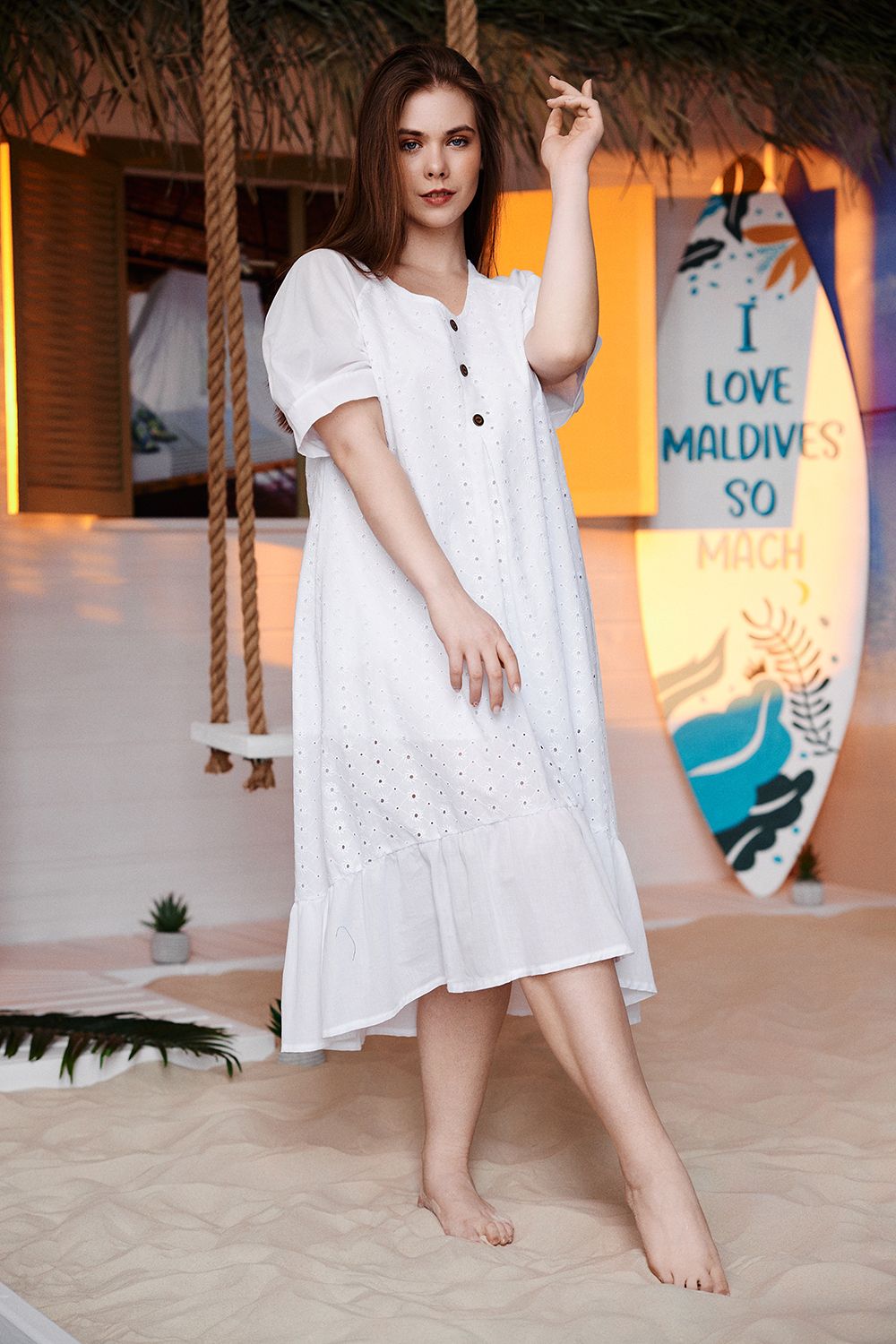 Платье женское, расширенное к низу. Горловина округлая, на полочке имитация планки с тремя пуговицами. Рукав реглан с манжетой и тремя складками. Фигурный низ платья заканчивается широкой рюшей.