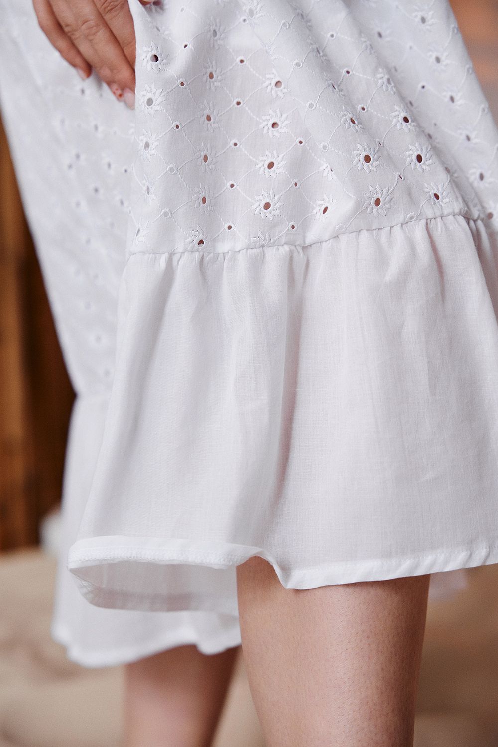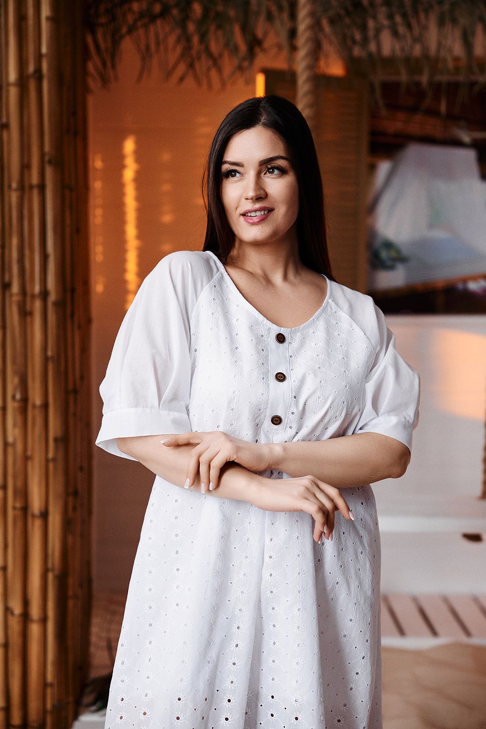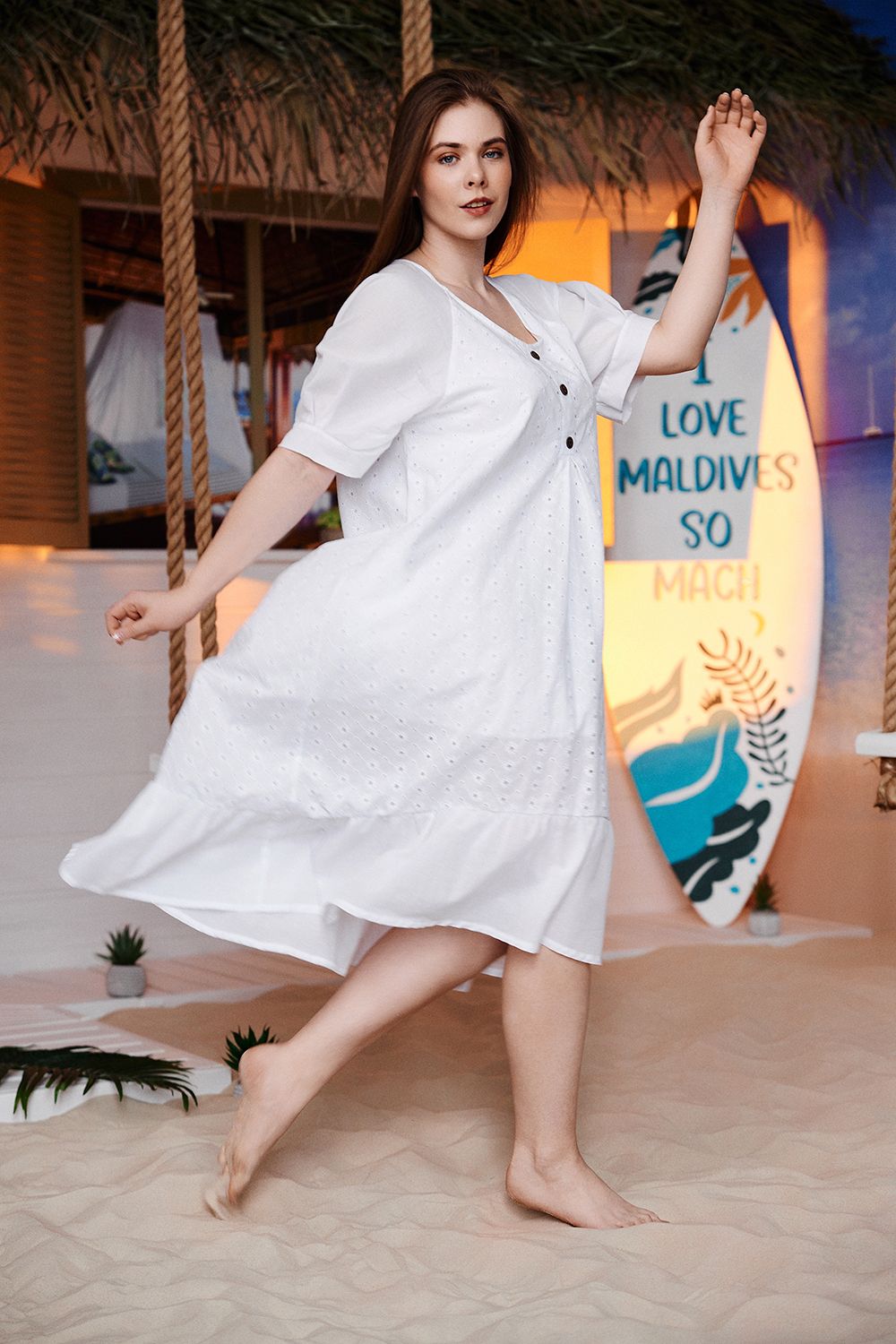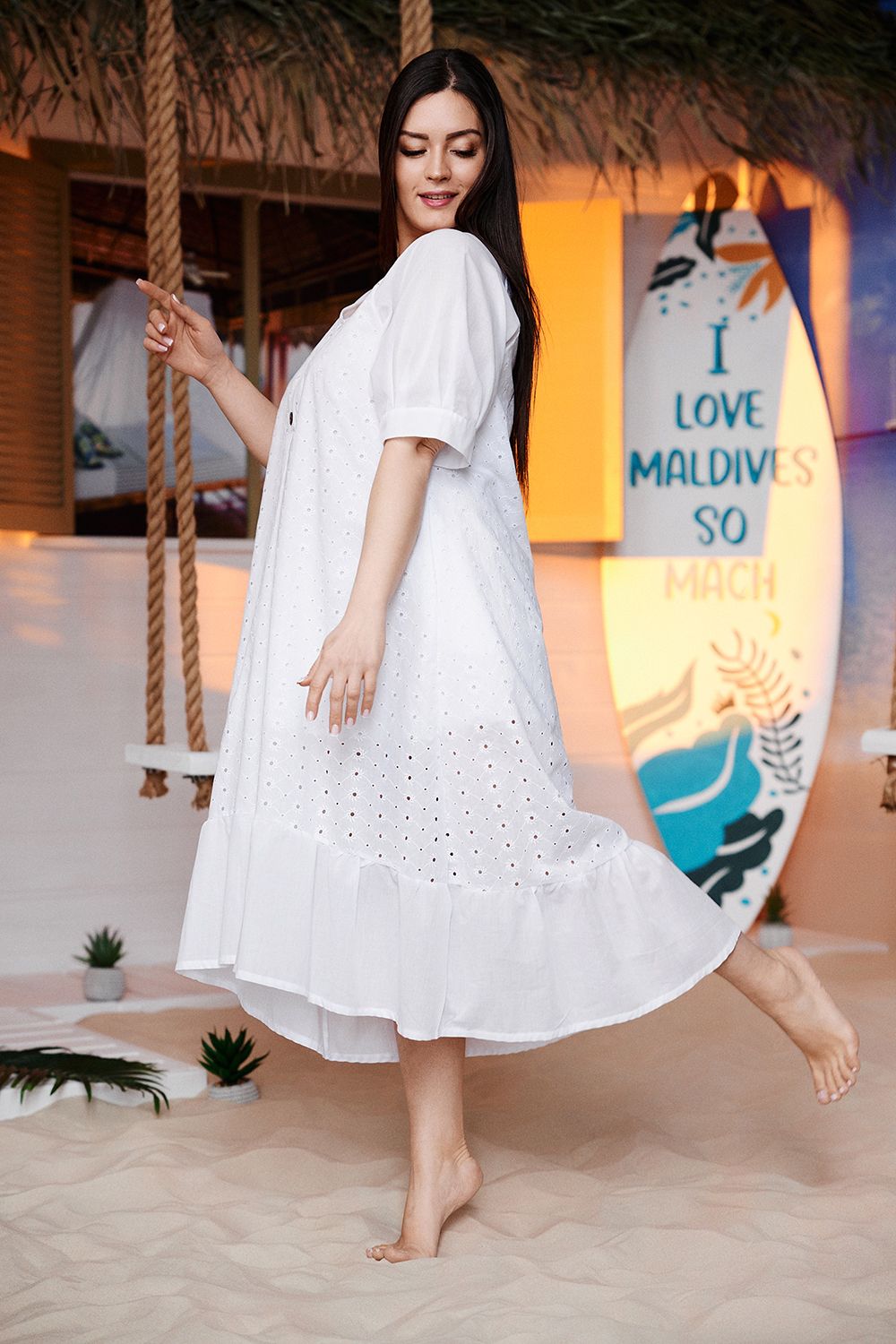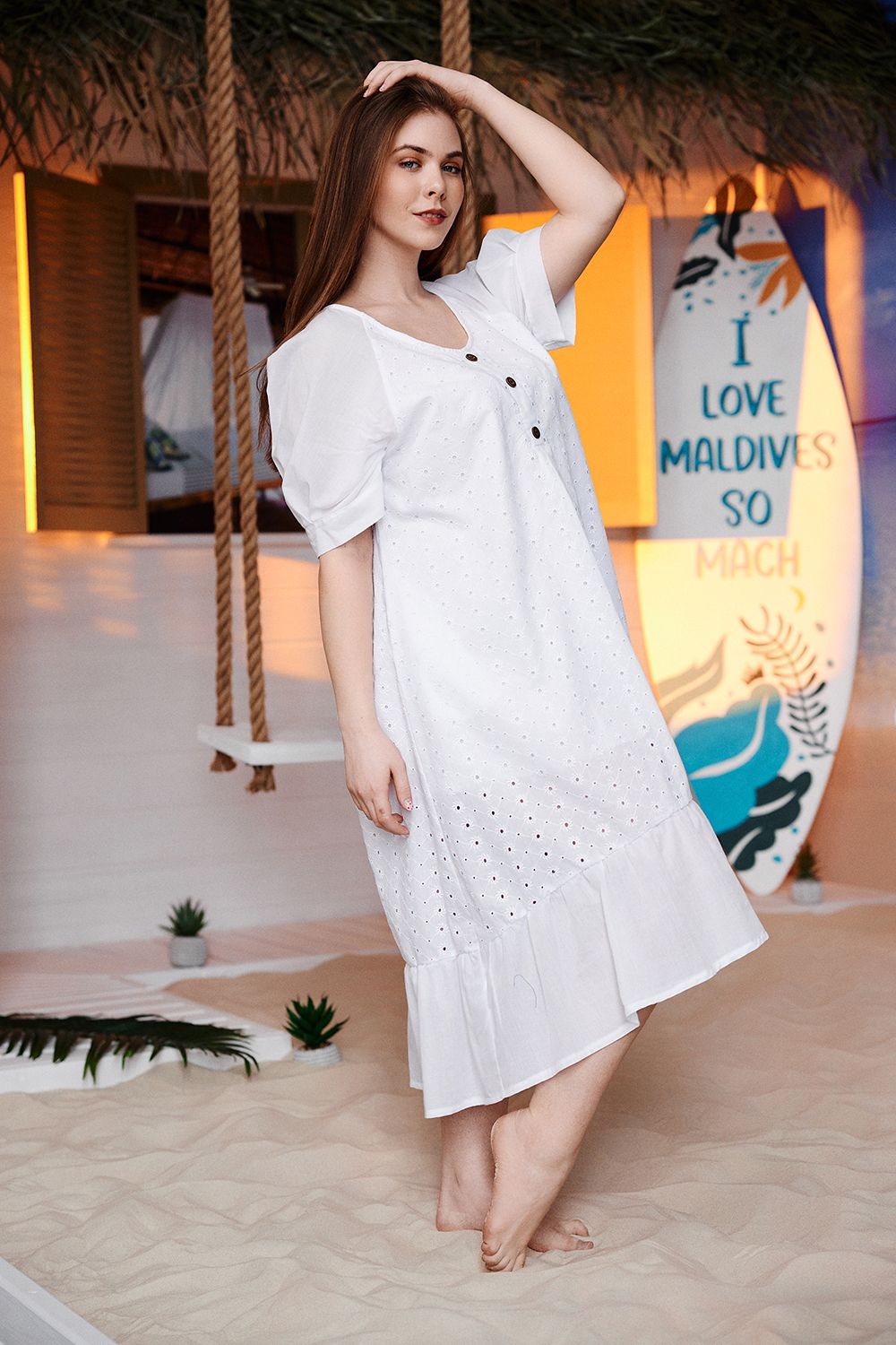 Платье женское, расширенное к низу. Горловина округлая, на полочке имитация планки с тремя пуговицами. Рукав реглан с манжетой и тремя складками. Фигурный низ платья заканчивается широкой рюшей.