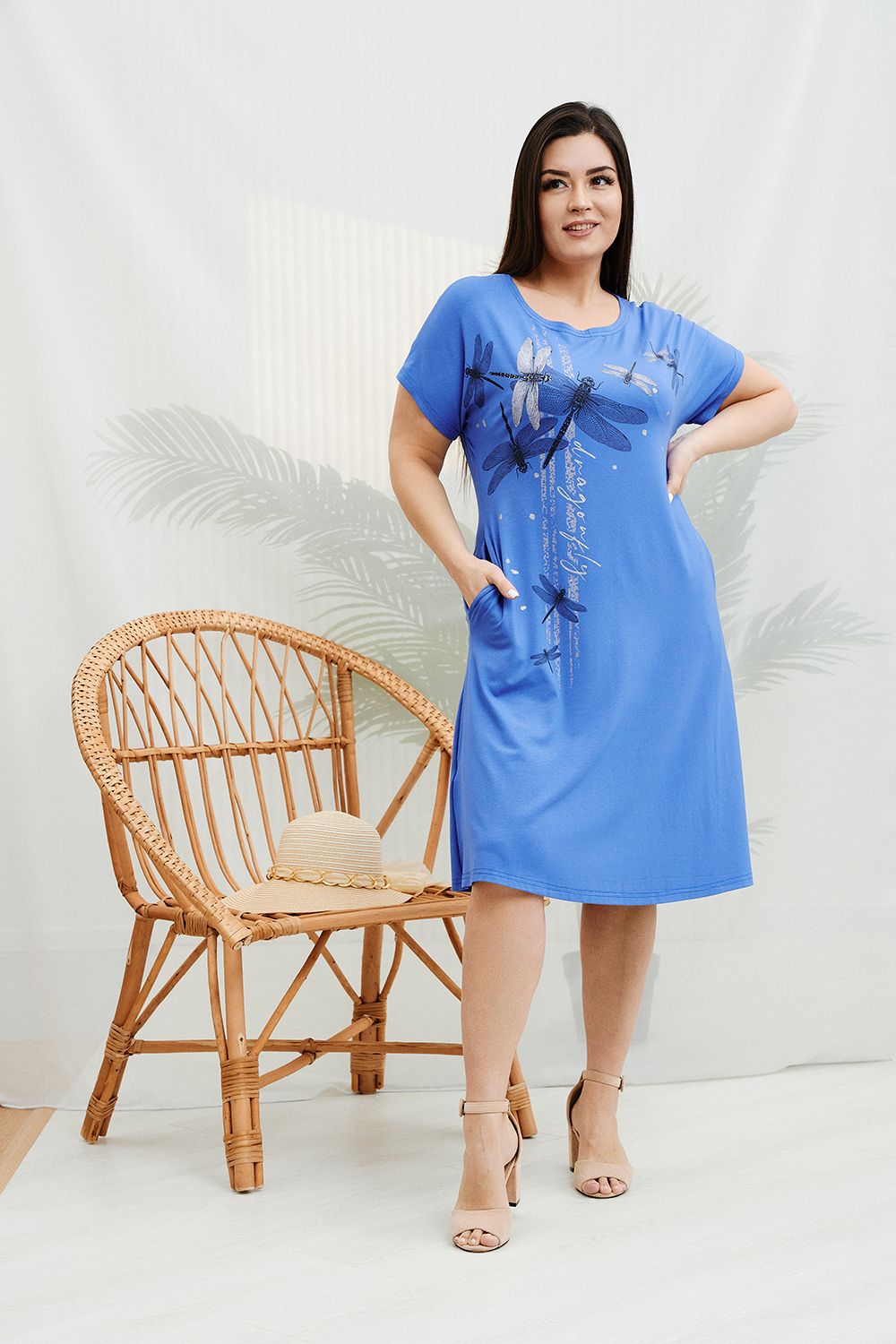 Платье женское полуприлегающего силуэта, слегка расширенное к низу. Рукав цельнокроенный короткий. Горловина округлая. В боковом шве внутренние карманы. На полочке крупный стильный принт.