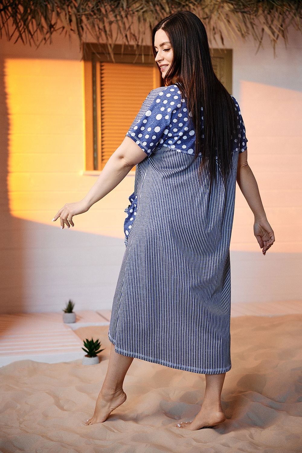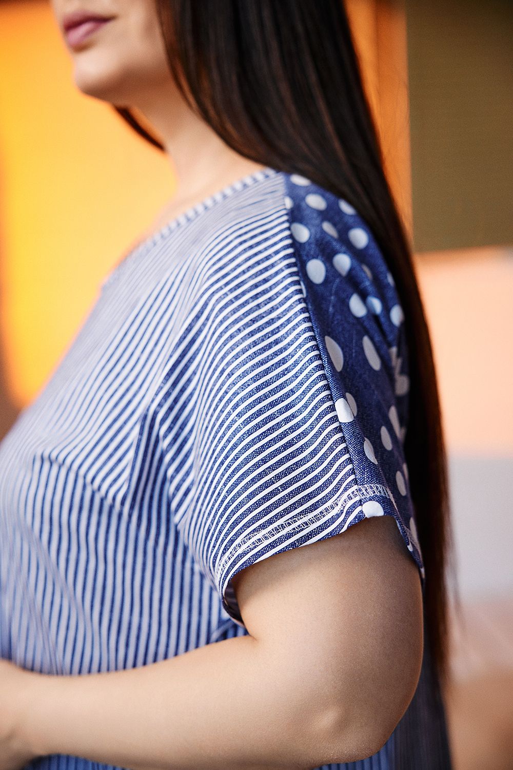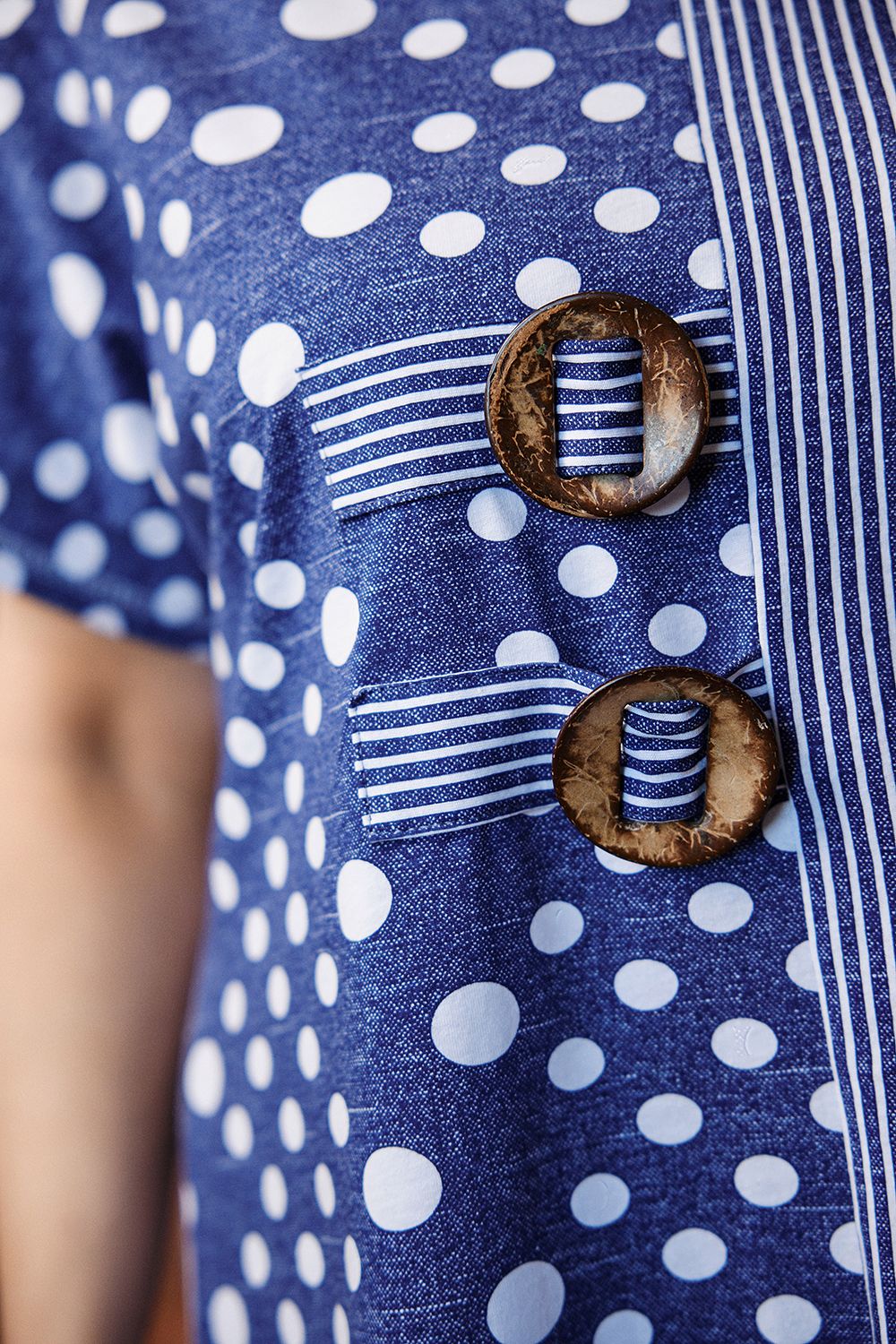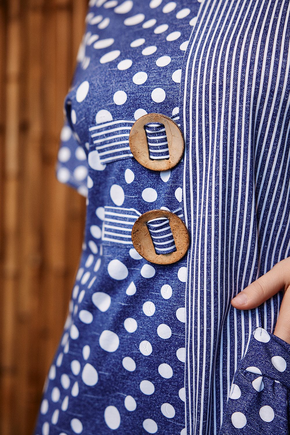 Платье женское, свободное, к низу расширенное. Рукав цельнокроенный короткий. Горловина Y-образная. Платье из двух полочек , одна полочка и кокетка спинки: в горошек, другая полочка и спинка: в полоску. На полочке в полоску большой накладной карман из ткани в горошек с декоративной кокосовой пуговицей на завязке. На полочке в горошек чуть ниже линии груди настрочены два хляста с декоративными кокосовыми пуговицами. На спинке сзади складка для обеспечения достаточной свободы по бедрам. Низ платья фигурный, полочка короче спинки.
