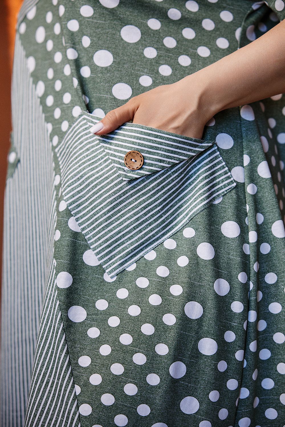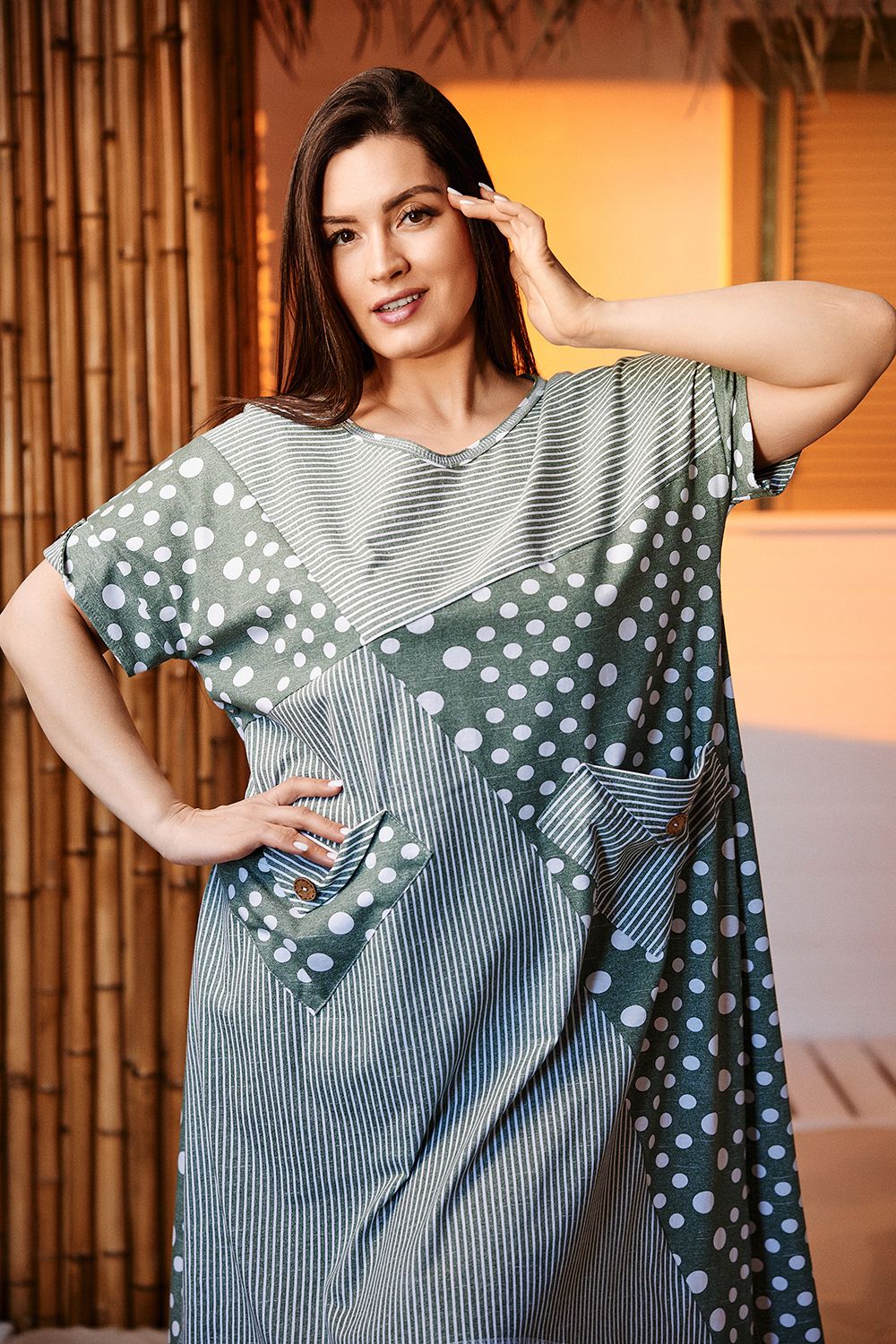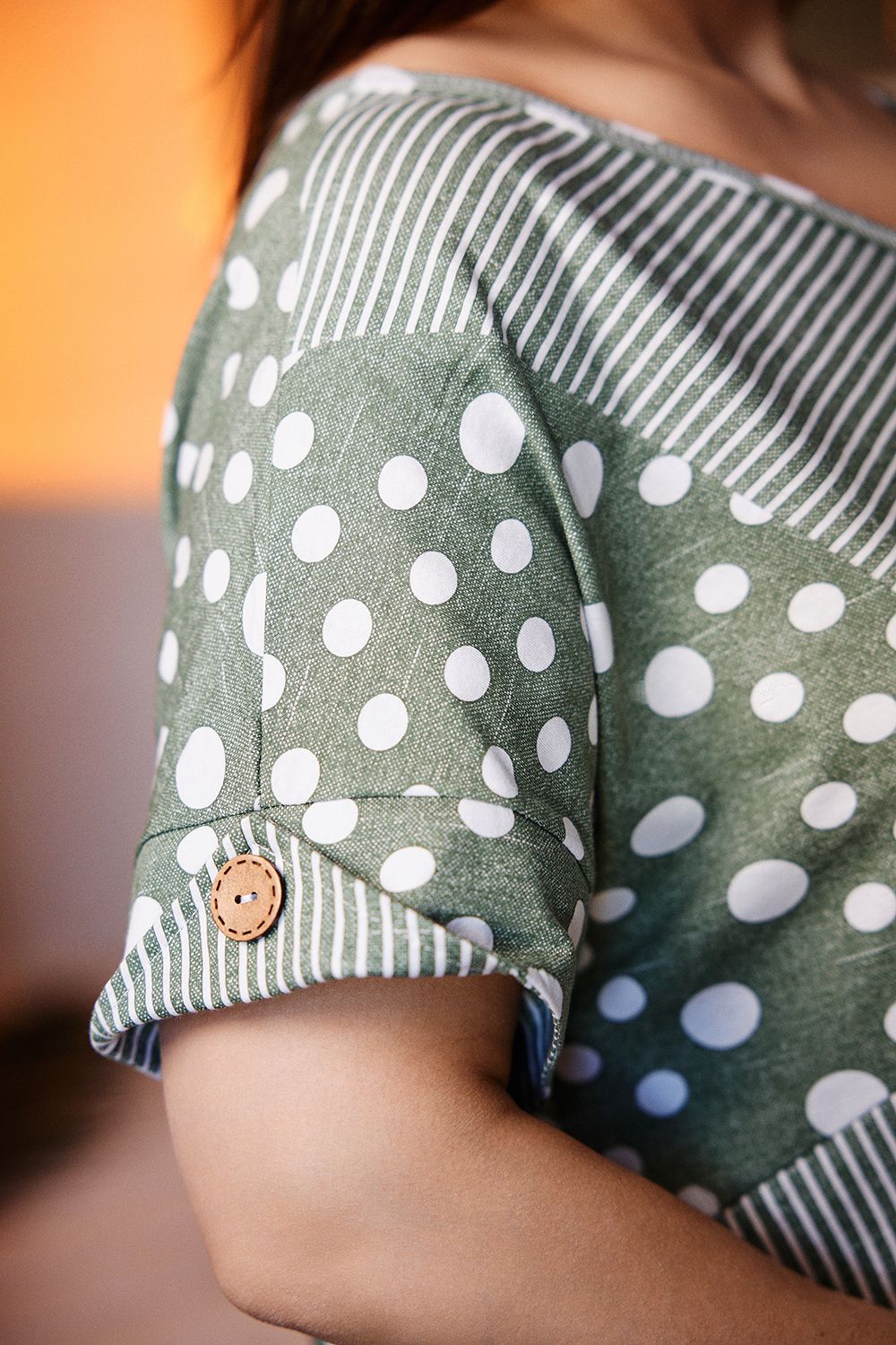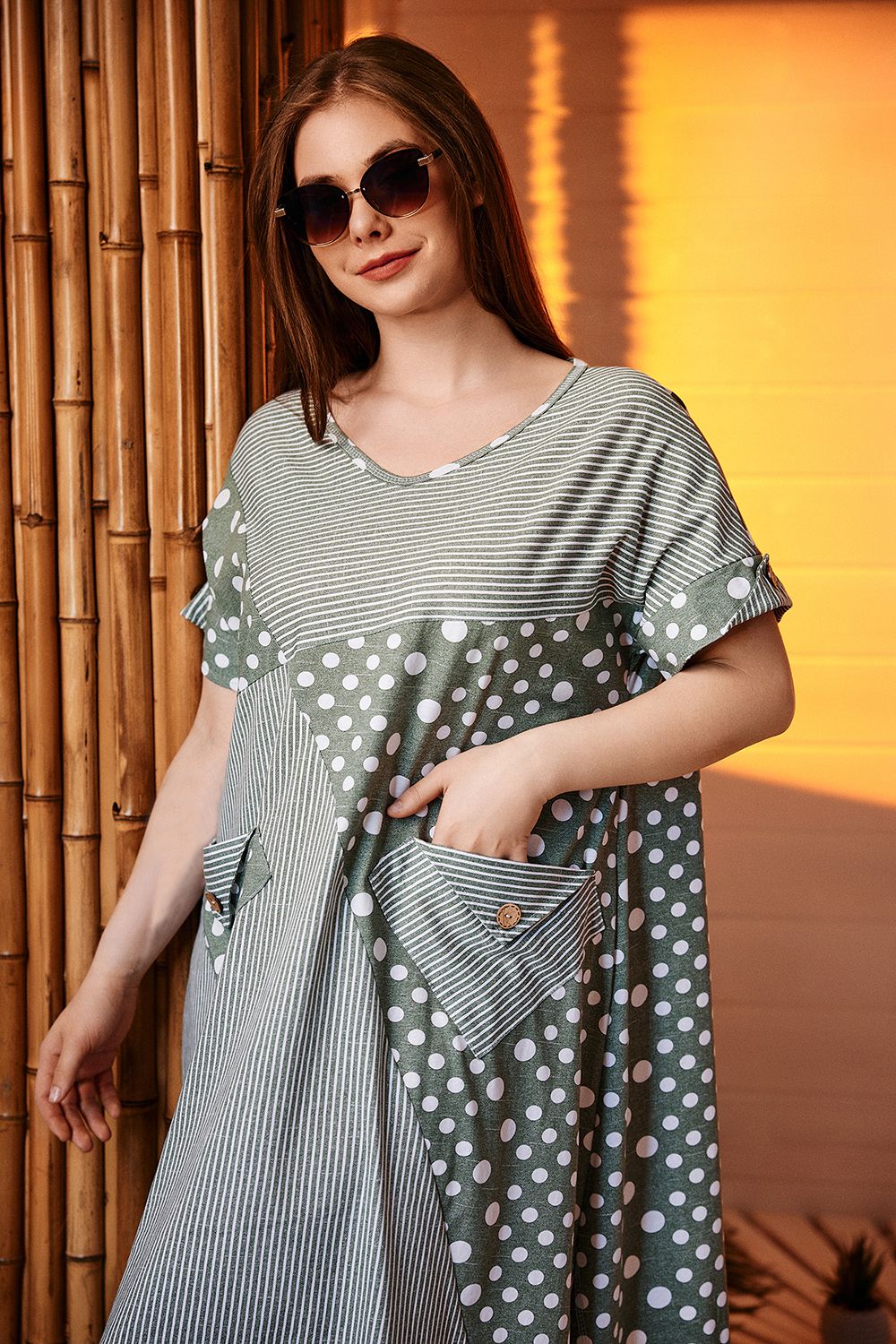 Платье женское, свободное, силуэт трапеция. Рукав короткий цельнокроенный с манжетой. Горловина Y-образная. Полочка состоит из четырех асимметричных частей, две части по диагонали из ткани в горошек, две другие - из мелкой полоски. Низ фигурный, спереди короче, чем сзади. По боковым швам разрезы. На полочках два накладных кармана, форма карманов квадраты, расположенные по диагонали, верхние уголки карманов зафиксированы декоративными пуговицами "кокос". Также пуговицы пришиты на отогнутых уголках манжет. Сочетание тканей "горошка" и мелкой полосы придают платью особую неповторимость и привлекательность.