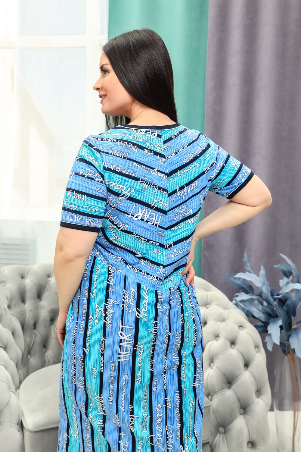 Платье женское полуприлегающего силуэта. Горловина округлая, Рукав втачной короткий. Полочка и спинка состоят из трех частей с разнонаправленной полосой. На полочке внутренние карманы.