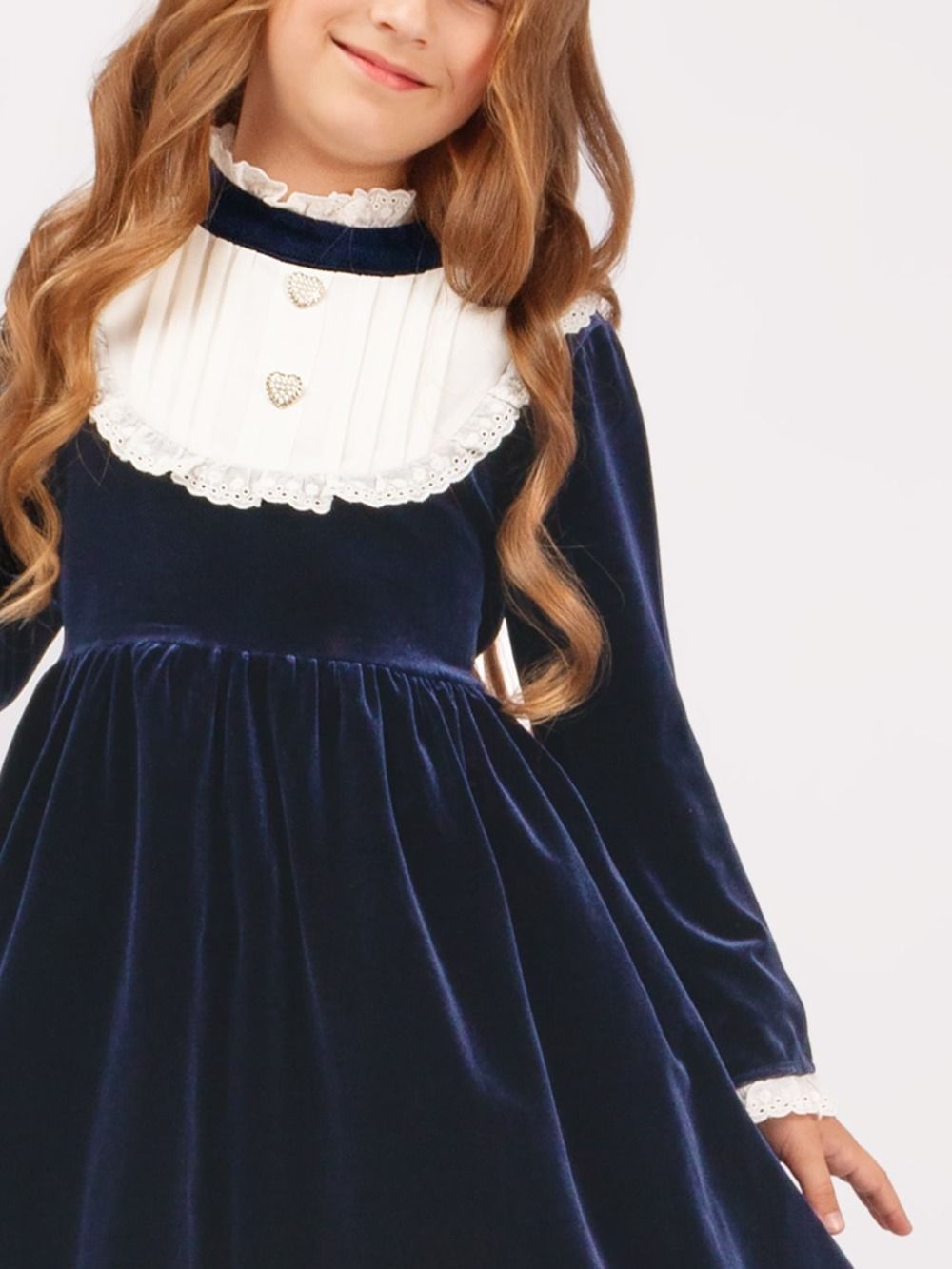 Очаровательное платье для девочки Соль&Перец из бархата, с отрезной кокеткой. Платье декорировано пуговицами из страз и жемчуга, белой кружевной окантовкой. Износоустойчивый материал позволит надолго сохранить форму и привлекательный внешний вид изделия. Идеальный выбор для создания стильного, школьного образа. Платье без подъюбника.